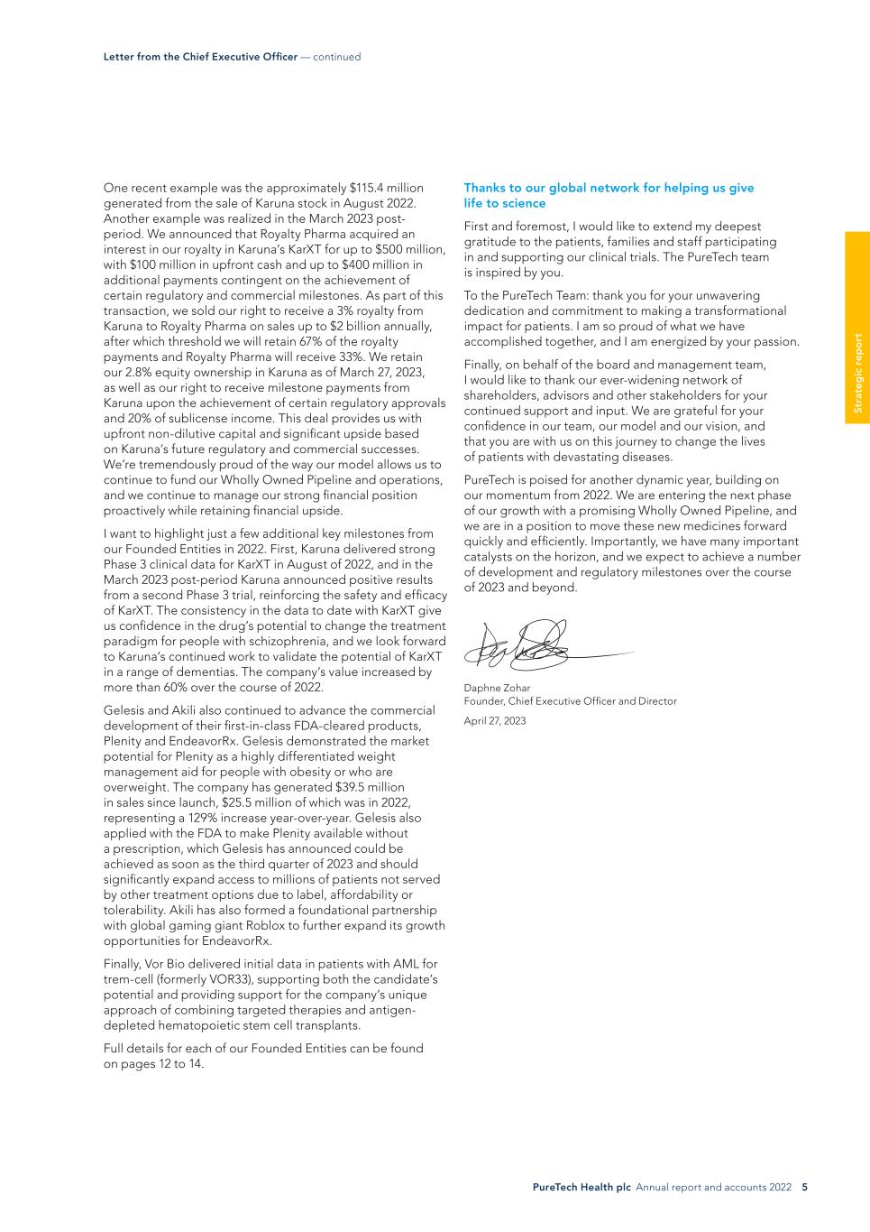 PureTech Health plc Annual report and accounts 2022 5 St ra te g ic r ep o rt One recent example was the approximately $115.4 million generated from the sale of Karuna stock in August 2022. Another example was realized in the March 2023 post- period. We announced that Royalty Pharma acquired an interest in our royalty in Karuna’s KarXT for up to $500 million, with $100 million in upfront cash and up to $400 million in additional payments contingent on the achievement of certain regulatory and commercial milestones. As part of this transaction, we sold our right to receive a 3% royalty from Karuna to Royalty Pharma on sales up to $2 billion annually, after which threshold we will retain 67% of the royalty payments and Royalty Pharma will receive 33%. We retain our 2.8% equity ownership in Karuna as of March 27, 2023, as well as our right to receive milestone payments from Karuna upon the achievement of certain regulatory approvals and 20% of sublicense income. This deal provides us with upfront non-dilutive capital and significant upside based on Karuna’s future regulatory and commercial successes. We’re tremendously proud of the way our model allows us to continue to fund our Wholly Owned Pipeline and operations, and we continue to manage our strong financial position proactively while retaining financial upside. I want to highlight just a few additional key milestones from our Founded Entities in 2022. First, Karuna delivered strong Phase 3 clinical data for KarXT in August of 2022, and in the March 2023 post-period Karuna announced positive results from a second Phase 3 trial, reinforcing the safety and efficacy of KarXT. The consistency in the data to date with KarXT give us confidence in the drug’s potential to change the treatment paradigm for people with schizophrenia, and we look forward to Karuna’s continued work to validate the potential of KarXT in a range of dementias. The company’s value increased by more than 60% over the course of 2022. Gelesis and Akili also continued to advance the commercial development of their first-in-class FDA-cleared products, Plenity and EndeavorRx. Gelesis demonstrated the market potential for Plenity as a highly differentiated weight management aid for people with obesity or who are overweight. The company has generated $39.5 million in sales since launch, $25.5 million of which was in 2022, representing a 129% increase year-over-year. Gelesis also applied with the FDA to make Plenity available without a prescription, which Gelesis has announced could be achieved as soon as the third quarter of 2023 and should significantly expand access to millions of patients not served by other treatment options due to label, affordability or tolerability. Akili has also formed a foundational partnership with global gaming giant Roblox to further expand its growth opportunities for EndeavorRx. Finally, Vor Bio delivered initial data in patients with AML for trem-cell (formerly VOR33), supporting both the candidate’s potential and providing support for the company’s unique approach of combining targeted therapies and antigen- depleted hematopoietic stem cell transplants. Full details for each of our Founded Entities can be found on pages 12 to 14. Letter from the Chief Executive Officer — continued Thanks to our global network for helping us give life to science First and foremost, I would like to extend my deepest gratitude to the patients, families and staff participating in and supporting our clinical trials. The PureTech team is inspired by you. To the PureTech Team: thank you for your unwavering dedication and commitment to making a transformational impact for patients. I am so proud of what we have accomplished together, and I am energized by your passion. Finally, on behalf of the board and management team, I would like to thank our ever-widening network of shareholders, advisors and other stakeholders for your continued support and input. We are grateful for your confidence in our team, our model and our vision, and that you are with us on this journey to change the lives of patients with devastating diseases. PureTech is poised for another dynamic year, building on our momentum from 2022. We are entering the next phase of our growth with a promising Wholly Owned Pipeline, and we are in a position to move these new medicines forward quickly and efficiently. Importantly, we have many important catalysts on the horizon, and we expect to achieve a number of development and regulatory milestones over the course of 2023 and beyond. Daphne Zohar Founder, Chief Executive Officer and Director April 27, 2023