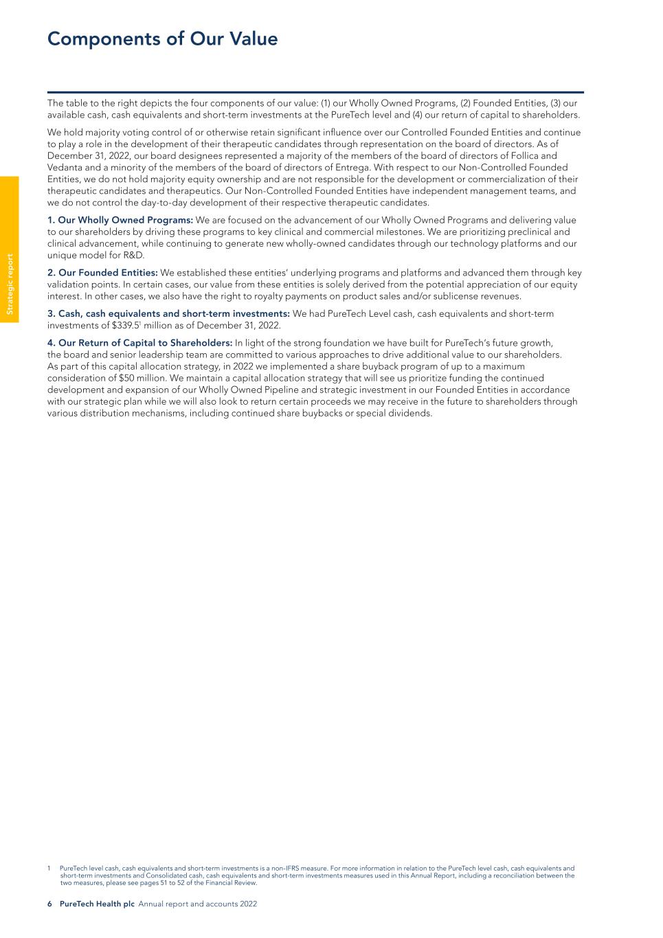 6 PureTech Health plc Annual report and accounts 2022 St ra te g ic r ep o rt The table to the right depicts the four components of our value: (1) our Wholly Owned Programs, (2) Founded Entities, (3) our available cash, cash equivalents and short-term investments at the PureTech level and (4) our return of capital to shareholders. We hold majority voting control of or otherwise retain significant influence over our Controlled Founded Entities and continue to play a role in the development of their therapeutic candidates through representation on the board of directors. As of December 31, 2022, our board designees represented a majority of the members of the board of directors of Follica and Vedanta and a minority of the members of the board of directors of Entrega. With respect to our Non-Controlled Founded Entities, we do not hold majority equity ownership and are not responsible for the development or commercialization of their therapeutic candidates and therapeutics. Our Non-Controlled Founded Entities have independent management teams, and we do not control the day-to-day development of their respective therapeutic candidates. 1. Our Wholly Owned Programs: We are focused on the advancement of our Wholly Owned Programs and delivering value to our shareholders by driving these programs to key clinical and commercial milestones. We are prioritizing preclinical and clinical advancement, while continuing to generate new wholly-owned candidates through our technology platforms and our unique model for R&D. 2. Our Founded Entities: We established these entities’ underlying programs and platforms and advanced them through key validation points. In certain cases, our value from these entities is solely derived from the potential appreciation of our equity interest. In other cases, we also have the right to royalty payments on product sales and/or sublicense revenues. 3. Cash, cash equivalents and short-term investments: We had PureTech Level cash, cash equivalents and short-term investments of $339.51 million as of December 31, 2022. 4. Our Return of Capital to Shareholders: In light of the strong foundation we have built for PureTech’s future growth, the board and senior leadership team are committed to various approaches to drive additional value to our shareholders. As part of this capital allocation strategy, in 2022 we implemented a share buyback program of up to a maximum consideration of $50 million. We maintain a capital allocation strategy that will see us prioritize funding the continued development and expansion of our Wholly Owned Pipeline and strategic investment in our Founded Entities in accordance with our strategic plan while we will also look to return certain proceeds we may receive in the future to shareholders through various distribution mechanisms, including continued share buybacks or special dividends. Components of Our Value 1 PureTech level cash, cash equivalents and short-term investments is a non-IFRS measure. For more information in relation to the PureTech level cash, cash equivalents and short-term investments and Consolidated cash, cash equivalents and short-term investments measures used in this Annual Report, including a reconciliation between the two measures, please see pages 51 to 52 of the Financial Review.