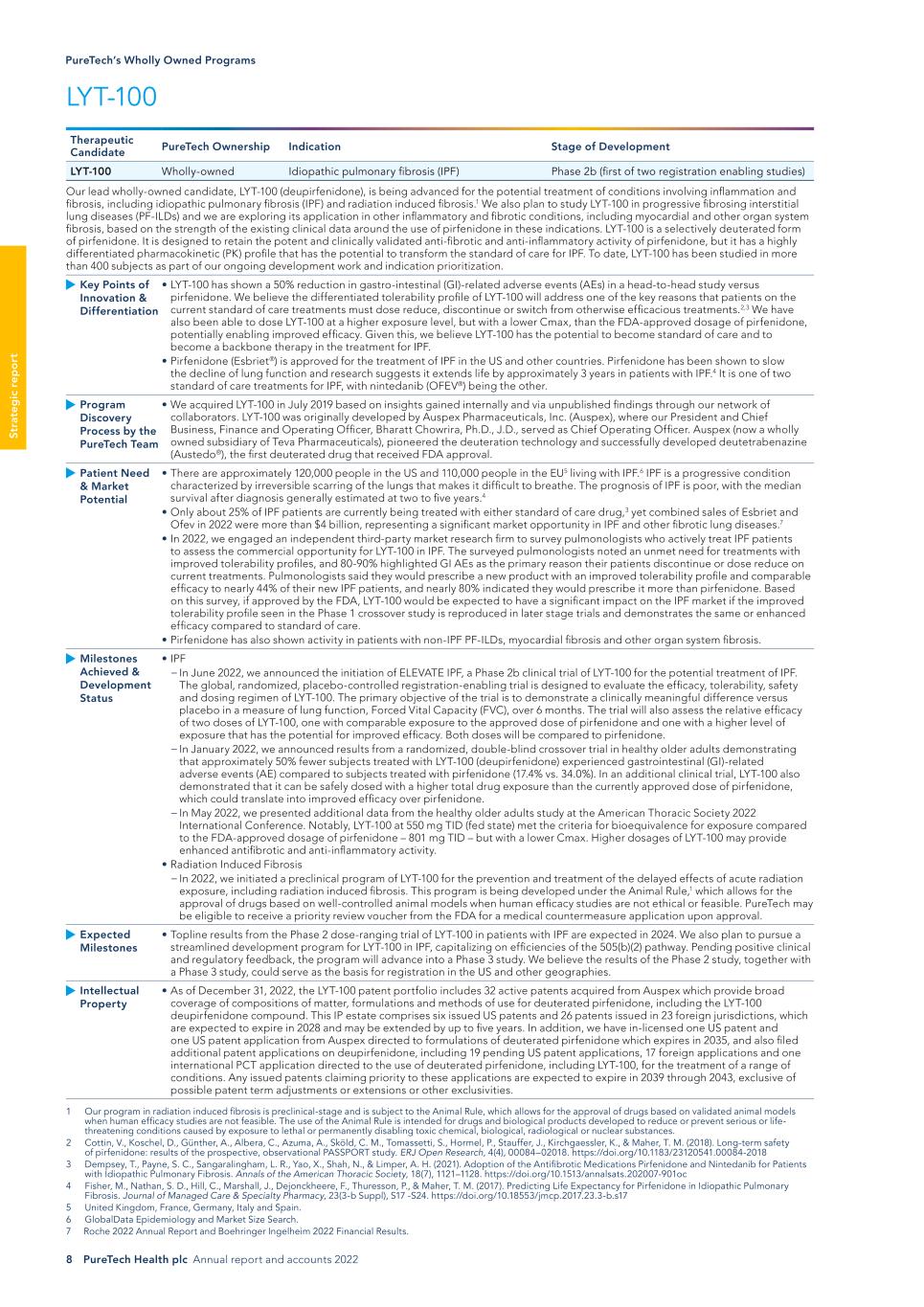 8 PureTech Health plc Annual report and accounts 2022 St ra te g ic r ep o rt LYT-100 Therapeutic Candidate PureTech Ownership Indication Stage of Development LYT-100 Wholly-owned Idiopathic pulmonary fibrosis (IPF) Phase 2b (first of two registration enabling studies) Our lead wholly-owned candidate, LYT-100 (deupirfenidone), is being advanced for the potential treatment of conditions involving inflammation and fibrosis, including idiopathic pulmonary fibrosis (IPF) and radiation induced fibrosis.1 We also plan to study LYT-100 in progressive fibrosing interstitial lung diseases (PF-ILDs) and we are exploring its application in other inflammatory and fibrotic conditions, including myocardial and other organ system fibrosis, based on the strength of the existing clinical data around the use of pirfenidone in these indications. LYT-100 is a selectively deuterated form of pirfenidone. It is designed to retain the potent and clinically validated anti-fibrotic and anti-inflammatory activity of pirfenidone, but it has a highly differentiated pharmacokinetic (PK) profile that has the potential to transform the standard of care for IPF. To date, LYT-100 has been studied in more than 400 subjects as part of our ongoing development work and indication prioritization. Key Points of Innovation & Differentiation • LYT-100 has shown a 50% reduction in gastro-intestinal (GI)-related adverse events (AEs) in a head-to-head study versus pirfenidone. We believe the differentiated tolerability profile of LYT-100 will address one of the key reasons that patients on the current standard of care treatments must dose reduce, discontinue or switch from otherwise efficacious treatments.2,3 We have also been able to dose LYT-100 at a higher exposure level, but with a lower Cmax, than the FDA-approved dosage of pirfenidone, potentially enabling improved efficacy. Given this, we believe LYT-100 has the potential to become standard of care and to become a backbone therapy in the treatment for IPF. • Pirfenidone (Esbriet®) is approved for the treatment of IPF in the US and other countries. Pirfenidone has been shown to slow the decline of lung function and research suggests it extends life by approximately 3 years in patients with IPF.4 It is one of two standard of care treatments for IPF, with nintedanib (OFEV®) being the other. Program Discovery Process by the PureTech Team • We acquired LYT-100 in July 2019 based on insights gained internally and via unpublished findings through our network of collaborators. LYT-100 was originally developed by Auspex Pharmaceuticals, Inc. (Auspex), where our President and Chief Business, Finance and Operating Officer, Bharatt Chowrira, Ph.D., J.D., served as Chief Operating Officer. Auspex (now a wholly owned subsidiary of Teva Pharmaceuticals), pioneered the deuteration technology and successfully developed deutetrabenazine (Austedo®), the first deuterated drug that received FDA approval. Patient Need & Market Potential • There are approximately 120,000 people in the US and 110,000 people in the EU5 living with IPF.6 IPF is a progressive condition characterized by irreversible scarring of the lungs that makes it difficult to breathe. The prognosis of IPF is poor, with the median survival after diagnosis generally estimated at two to five years.4 • Only about 25% of IPF patients are currently being treated with either standard of care drug,3 yet combined sales of Esbriet and Ofev in 2022 were more than $4 billion, representing a significant market opportunity in IPF and other fibrotic lung diseases.7 • In 2022, we engaged an independent third-party market research firm to survey pulmonologists who actively treat IPF patients to assess the commercial opportunity for LYT-100 in IPF. The surveyed pulmonologists noted an unmet need for treatments with improved tolerability profiles, and 80-90% highlighted GI AEs as the primary reason their patients discontinue or dose reduce on current treatments. Pulmonologists said they would prescribe a new product with an improved tolerability profile and comparable efficacy to nearly 44% of their new IPF patients, and nearly 80% indicated they would prescribe it more than pirfenidone. Based on this survey, if approved by the FDA, LYT-100 would be expected to have a significant impact on the IPF market if the improved tolerability profile seen in the Phase 1 crossover study is reproduced in later stage trials and demonstrates the same or enhanced efficacy compared to standard of care. • Pirfenidone has also shown activity in patients with non-IPF PF-ILDs, myocardial fibrosis and other organ system fibrosis. Milestones Achieved & Development Status • IPF − In June 2022, we announced the initiation of ELEVATE IPF, a Phase 2b clinical trial of LYT-100 for the potential treatment of IPF. The global, randomized, placebo-controlled registration-enabling trial is designed to evaluate the efficacy, tolerability, safety and dosing regimen of LYT-100. The primary objective of the trial is to demonstrate a clinically meaningful difference versus placebo in a measure of lung function, Forced Vital Capacity (FVC), over 6 months. The trial will also assess the relative efficacy of two doses of LYT-100, one with comparable exposure to the approved dose of pirfenidone and one with a higher level of exposure that has the potential for improved efficacy. Both doses will be compared to pirfenidone. − In January 2022, we announced results from a randomized, double-blind crossover trial in healthy older adults demonstrating that approximately 50% fewer subjects treated with LYT-100 (deupirfenidone) experienced gastrointestinal (GI)-related adverse events (AE) compared to subjects treated with pirfenidone (17.4% vs. 34.0%). In an additional clinical trial, LYT-100 also demonstrated that it can be safely dosed with a higher total drug exposure than the currently approved dose of pirfenidone, which could translate into improved efficacy over pirfen