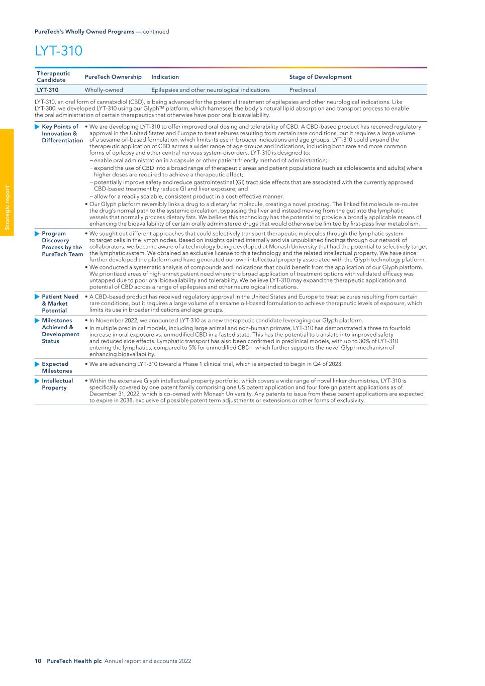 10 PureTech Health plc Annual report and accounts 2022 St ra te g ic r ep o rt LYT-310 Therapeutic Candidate PureTech Ownership Indication Stage of Development LYT-310 Wholly-owned Epilepsies and other neurological indications Preclinical LYT-310, an oral form of cannabidiol (CBD), is being advanced for the potential treatment of epilepsies and other neurological indications. Like LYT-300, we developed LYT-310 using our Glyph™ platform, which harnesses the body’s natural lipid absorption and transport process to enable the oral administration of certain therapeutics that otherwise have poor oral bioavailability. Key Points of Innovation & Differentiation • We are developing LYT-310 to offer improved oral dosing and tolerability of CBD. A CBD-based product has received regulatory approval in the United States and Europe to treat seizures resulting from certain rare conditions, but it requires a large volume of a sesame oil-based formulation, which limits its use in broader indications and age groups. LYT-310 could expand the therapeutic application of CBD across a wider range of age groups and indications, including both rare and more common forms of epilepsy and other central nervous system disorders. LYT-310 is designed to: − enable oral administration in a capsule or other patient-friendly method of administration; − expand the use of CBD into a broad range of therapeutic areas and patient populations (such as adolescents and adults) where higher doses are required to achieve a therapeutic effect; − potentially improve safety and reduce gastrointestinal (GI) tract side effects that are associated with the currently approved CBD-based treatment by reduce GI and liver exposure; and − allow for a readily scalable, consistent product in a cost-effective manner. • Our Glyph platform reversibly links a drug to a dietary fat molecule, creating a novel prodrug. The linked fat molecule re-routes the drug’s normal path to the systemic circulation, bypassing the liver and instead moving from the gut into the lymphatic vessels that normally process dietary fats. We believe this technology has the potential to provide a broadly applicable means of enhancing the bioavailability of certain orally administered drugs that would otherwise be limited by first-pass liver metabolism. Program Discovery Process by the PureTech Team • We sought out different approaches that could selectively transport therapeutic molecules through the lymphatic system to target cells in the lymph nodes. Based on insights gained internally and via unpublished findings through our network of collaborators, we became aware of a technology being developed at Monash University that had the potential to selectively target the lymphatic system. We obtained an exclusive license to this technology and the related intellectual property. We have since further developed the platform and have generated our own intellectual property associated with the Glyph technology platform. • We conducted a systematic analysis of compounds and indications that could benefit from the application of our Glyph platform. We prioritized areas of high unmet patient need where the broad application of treatment options with validated efficacy was untapped due to poor oral bioavailability and tolerability. We believe LYT-310 may expand the therapeutic application and potential of CBD across a range of epilepsies and other neurological indications. Patient Need & Market Potential • A CBD-based product has received regulatory approval in the United States and Europe to treat seizures resulting from certain rare conditions, but it requires a large volume of a sesame oil-based formulation to achieve therapeutic levels of exposure, which limits its use in broader indications and age groups. Milestones Achieved & Development Status • In November 2022, we announced LYT-310 as a new therapeutic candidate leveraging our Glyph platform. • In multiple preclinical models, including large animal and non-human primate, LYT-310 has demonstrated a three to fourfold increase in oral exposure vs. unmodified CBD in a fasted state. This has the potential to translate into improved safety and reduced side effects. Lymphatic transport has also been confirmed in preclinical models, with up to 30% of LYT-310 entering the lymphatics, compared to 5% for unmodified CBD – which further supports the novel Glyph mechanism of enhancing bioavailability. Expected Milestones • We are advancing LYT-310 toward a Phase 1 clinical trial, which is expected to begin in Q4 of 2023. Intellectual Property • Within the extensive Glyph intellectual property portfolio, which covers a wide range of novel linker chemistries, LYT-310 is specifically covered by one patent family comprising one US patent application and four foreign patent applications as of December 31, 2022, which is co-owned with Monash University. Any patents to issue from these patent applications are expected to expire in 2038, exclusive of possible patent term adjustments or extensions or other forms of exclusivity. PureTech’s Wholly Owned Programs — continued