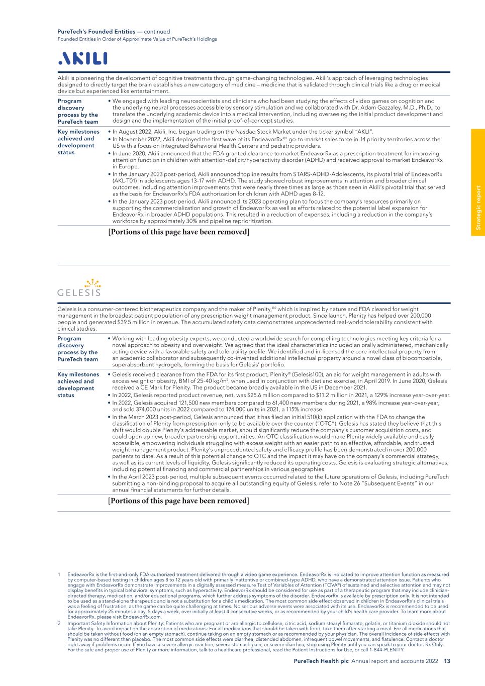 PureTech Health plc Annual report and accounts 2022 13 St ra te g ic r ep o rt Akili is pioneering the development of cognitive treatments through game-changing technologies. Akili’s approach of leveraging technologies designed to directly target the brain establishes a new category of medicine – medicine that is validated through clinical trials like a drug or medical device but experienced like entertainment. Program discovery process by the PureTech team • We engaged with leading neuroscientists and clinicians who had been studying the effects of video games on cognition and the underlying neural processes accessible by sensory stimulation and we collaborated with Dr. Adam Gazzaley, M.D., Ph.D., to translate the underlying academic device into a medical intervention, including overseeing the initial product development and design and the implementation of the initial proof-of-concept studies. Key milestones achieved and development status • In August 2022, Akili, Inc. began trading on the Nasdaq Stock Market under the ticker symbol “AKLI”. • In November 2022, Akili deployed the first wave of its EndeavorRx®1 go-to-market sales force in 14 priority territories across the US with a focus on Integrated Behavioral Health Centers and pediatric providers. • In June 2020, Akili announced that the FDA granted clearance to market EndeavorRx as a prescription treatment for improving attention function in children with attention-deficit/hyperactivity disorder (ADHD) and received approval to market EndeavorRx in Europe. • In the January 2023 post-period, Akili announced topline results from STARS-ADHD-Adolescents, its pivotal trial of EndeavorRx (AKL-T01) in adolescents ages 13-17 with ADHD. The study showed robust improvements in attention and broader clinical outcomes, including attention improvements that were nearly three times as large as those seen in Akili’s pivotal trial that served as the basis for EndeavorRx’s FDA authorization for children with ADHD ages 8-12. • In the January 2023 post-period, Akili announced its 2023 operating plan to focus the company’s resources primarily on supporting the commercialization and growth of EndeavorRx as well as efforts related to the potential label expansion for EndeavorRx in broader ADHD populations. This resulted in a reduction of expenses, including a reduction in the company’s workforce by approximately 30% and pipeline reprioritization. [Portions of this page have been removed] PureTech’s Founded Entities — continued 1 EndeavorRx is the first-and-only FDA-authorized treatment delivered through a video game experience. EndeavorRx is indicated to improve attention function as measured by computer-based testing in children ages 8 to 12 years old with primarily inattentive or combined-type ADHD, who have a demonstrated attention issue. Patients who engage with EndeavorRx demonstrate improvements in a digitally assessed measure Test of Variables of Attention (TOVA®) of sustained and selective attention and may not display benefits in typical behavioral symptoms, such as hyperactivity. EndeavorRx should be considered for use as part of a therapeutic program that may include clinician- directed therapy, medication, and/or educational programs, which further address symptoms of the disorder. EndeavorRx is available by prescription only. It is not intended to be used as a stand-alone therapeutic and is not a substitution for a child’s medication. The most common side effect observed in children in EndeavorRx’s clinical trials was a feeling of frustration, as the game can be quite challenging at times. No serious adverse events were associated with its use. EndeavorRx is recommended to be used for approximately 25 minutes a day, 5 days a week, over initially at least 4 consecutive weeks, or as recommended by your child’s health care provider. To learn more about EndeavorRx, please visit EndeavorRx.com. 2 Important Safety Information about Plenity: Patients who are pregnant or are allergic to cellulose, citric acid, sodium stearyl fumarate, gelatin, or titanium dioxide should not take Plenity. To avoid impact on the absorption of medications: For all medications that should be taken with food, take them after starting a meal. For all medications that should be taken without food (on an empty stomach), continue taking on an empty stomach or as recommended by your physician. The overall incidence of side effects with Plenity was no different than placebo. The most common side effects were diarrhea, distended abdomen, infrequent bowel movements, and flatulence. Contact a doctor right away if problems occur. If you have a severe allergic reaction, severe stomach pain, or severe diarrhea, stop using Plenity until you can speak to your doctor. Rx Only. For the safe and proper use of Plenity or more information, talk to a healthcare professional, read the Patient Instructions for Use, or call 1-844-PLENITY. Founded Entities in Order of Approximate Value of PureTech’s Holdings Gelesis is a consumer-centered biotherapeutics company and the maker of Plenity,®2 which is inspired by nature and FDA cleared for weight management in the broadest patient population of any prescription weight management product. Since launch, Plenity has helped over 200,000 people and generated $39.5 million in revenue. The accumulated safety data demonstrates unprecedented real-world tolerability consistent with clinical studies. Program discovery process by the PureTech team • Working with leading obesity experts, we conducted a worldwide search for compelling technologies meeting key criteria for a novel approach to obesity and overweight. We agreed that the ideal characteristics included an orally administered, mechanically acting device with a favorable safety and tolerability profile. We identified and in-licensed the core intellectual property from an academic collaborator and subsequently co-invented additional intellectual property aro