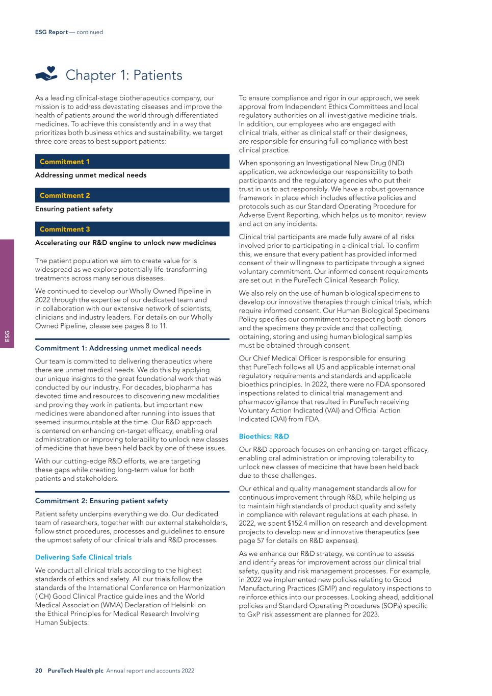E SG 20 PureTech Health plc Annual report and accounts 2022 ESG Report — continued To ensure compliance and rigor in our approach, we seek approval from Independent Ethics Committees and local regulatory authorities on all investigative medicine trials. In addition, our employees who are engaged with clinical trials, either as clinical staff or their designees, are responsible for ensuring full compliance with best clinical practice. When sponsoring an Investigational New Drug (IND) application, we acknowledge our responsibility to both participants and the regulatory agencies who put their trust in us to act responsibly. We have a robust governance framework in place which includes effective policies and protocols such as our Standard Operating Procedure for Adverse Event Reporting, which helps us to monitor, review and act on any incidents. Clinical trial participants are made fully aware of all risks involved prior to participating in a clinical trial. To confirm this, we ensure that every patient has provided informed consent of their willingness to participate through a signed voluntary commitment. Our informed consent requirements are set out in the PureTech Clinical Research Policy. We also rely on the use of human biological specimens to develop our innovative therapies through clinical trials, which require informed consent. Our Human Biological Specimens Policy specifies our commitment to respecting both donors and the specimens they provide and that collecting, obtaining, storing and using human biological samples must be obtained through consent. Our Chief Medical Officer is responsible for ensuring that PureTech follows all US and applicable international regulatory requirements and standards and applicable bioethics principles. In 2022, there were no FDA sponsored inspections related to clinical trial management and pharmacovigilance that resulted in PureTech receiving Voluntary Action Indicated (VAI) and Official Action Indicated (OAI) from FDA. Bioethics: R&D Our R&D approach focuses on enhancing on-target efficacy, enabling oral administration or improving tolerability to unlock new classes of medicine that have been held back due to these challenges. Our ethical and quality management standards allow for continuous improvement through R&D, while helping us to maintain high standards of product quality and safety in compliance with relevant regulations at each phase. In 2022, we spent $152.4 million on research and development projects to develop new and innovative therapeutics (see page 57 for details on R&D expenses). As we enhance our R&D strategy, we continue to assess and identify areas for improvement across our clinical trial safety, quality and risk management processes. For example, in 2022 we implemented new policies relating to Good Manufacturing Practices (GMP) and regulatory inspections to reinforce ethics into our processes. Looking ahead, additional policies and Standard Operating Procedures (SOPs) specific to GxP risk assessment are planned for 2023. As a leading clinical-stage biotherapeutics company, our mission is to address devastating diseases and improve the health of patients around the world through differentiated medicines. To achieve this consistently and in a way that prioritizes both business ethics and sustainability, we target three core areas to best support patients: Commitment 1 Addressing unmet medical needs Commitment 2 Ensuring patient safety Commitment 3 Accelerating our R&D engine to unlock new medicines The patient population we aim to create value for is widespread as we explore potentially life-transforming treatments across many serious diseases. We continued to develop our Wholly Owned Pipeline in 2022 through the expertise of our dedicated team and in collaboration with our extensive network of scientists, clinicians and industry leaders. For details on our Wholly Owned Pipeline, please see pages 8 to 11. Commitment 1: Addressing unmet medical needs Our team is committed to delivering therapeutics where there are unmet medical needs. We do this by applying our unique insights to the great foundational work that was conducted by our industry. For decades, biopharma has devoted time and resources to discovering new modalities and proving they work in patients, but important new medicines were abandoned after running into issues that seemed insurmountable at the time. Our R&D approach is centered on enhancing on-target efficacy, enabling oral administration or improving tolerability to unlock new classes of medicine that have been held back by one of these issues. With our cutting-edge R&D efforts, we are targeting these gaps while creating long-term value for both patients and stakeholders. Commitment 2: Ensuring patient safety Patient safety underpins everything we do. Our dedicated team of researchers, together with our external stakeholders, follow strict procedures, processes and guidelines to ensure the upmost safety of our clinical trials and R&D processes. Delivering Safe Clinical trials We conduct all clinical trials according to the highest standards of ethics and safety. All our trials follow the standards of the International Conference on Harmonization (ICH) Good Clinical Practice guidelines and the World Medical Association (WMA) Declaration of Helsinki on the Ethical Principles for Medical Research Involving Human Subjects. Chapter 1: Patients