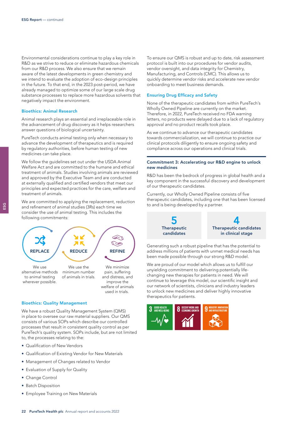 E SG 22 PureTech Health plc Annual report and accounts 2022 ESG Report — continued To ensure our QMS is robust and up to date, risk assessment protocol is built into our procedures for vendor audits, vendor oversight, and data integrity for Chemistry, Manufacturing, and Controls (CMC). This allows us to quickly determine vendor risks and accelerate new vendor onboarding to meet business demands. Ensuring Drug Efficacy and Safety None of the therapeutic candidates from within PureTech’s Wholly Owned Pipeline are currently on the market. Therefore, in 2022, PureTech received no FDA warning letters, no products were delayed due to a lack of regulatory approval and no product recalls took place. As we continue to advance our therapeutic candidates towards commercialization, we will continue to practice our clinical protocols diligently to ensure ongoing safety and compliance across our operations and clinical trials. Commitment 3: Accelerating our R&D engine to unlock new medicines R&D has been the bedrock of progress in global health and a key component in the successful discovery and development of our therapeutic candidates. Currently, our Wholly Owned Pipeline consists of five therapeutic candidates, including one that has been licensed to and is being developed by a partner. 5 Therapeutic candidates 4 Therapeutic candidates in clinical stage Generating such a robust pipeline that has the potential to address millions of patients with unmet medical needs has been made possible through our strong R&D model. We are proud of our model which allows us to fulfill our unyielding commitment to delivering potentially life- changing new therapies for patients in need. We will continue to leverage this model, our scientific insight and our network of scientists, clinicians and industry leaders to unlock new medicines and deliver highly innovative therapeutics for patients. Environmental considerations continue to play a key role in R&D as we strive to reduce or eliminate hazardous chemicals from our R&D process. We also ensure that we remain aware of the latest developments in green chemistry and we intend to evaluate the adoption of eco-design principles in the future. To that end, in the 2023 post-period, we have already managed to optimize some of our large scale drug substance processes to replace more hazardous solvents that negatively impact the environment. Bioethics: Animal Research Animal research plays an essential and irreplaceable role in the advancement of drug discovery as it helps researchers answer questions of biological uncertainty. PureTech conducts animal testing only when necessary to advance the development of therapeutics and is required by regulatory authorities, before human testing of new medicines can take place. We follow the guidelines set out under the USDA Animal Welfare Act and are committed to the humane and ethical treatment of animals. Studies involving animals are reviewed and approved by the Executive Team and are conducted at externally qualified and certified vendors that meet our principles and expected practices for the care, welfare and treatment of animals. We are committed to applying the replacement, reduction and refinement of animal studies (3Rs) each time we consider the use of animal testing. This includes the following commitments: Bioethics: Quality Management We have a robust Quality Management System (QMS) in place to oversee our raw material suppliers. Our QMS consists of various SOPs which describe our controlled processes that result in consistent quality control as per PureTech’s quality system. SOPs include, but are not limited to, the processes relating to the: • Qualification of New Vendors • Qualification of Existing Vendor for New Materials • Management of Changes related to Vendor • Evaluation of Supply for Quality • Change Control • Batch Disposition • Employee Training on New Materials REPLACE REDUCE We use alternative methods to animal testing wherever possible. We use the minimum number of animals in trials. We minimize pain, suffering and distress, and improve the welfare of animals used in trials. REFINE