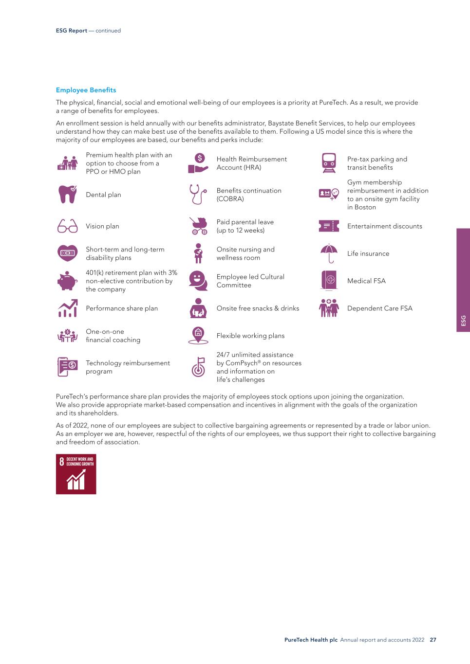 E SG PureTech Health plc Annual report and accounts 2022 27 ESG Report — continued Employee Benefits The physical, financial, social and emotional well-being of our employees is a priority at PureTech. As a result, we provide a range of benefits for employees. An enrollment session is held annually with our benefits administrator, Baystate Benefit Services, to help our employees understand how they can make best use of the benefits available to them. Following a US model since this is where the majority of our employees are based, our benefits and perks include: Premium health plan with an option to choose from a PPO or HMO plan Health Reimbursement Account (HRA) Pre-tax parking and transit benefits Dental plan Benefits continuation (COBRA) Gym membership reimbursement in addition to an onsite gym facility in Boston Vision plan Paid parental leave (up to 12 weeks) Entertainment discounts Short-term and long-term disability plans Onsite nursing and wellness room Life insurance 401(k) retirement plan with 3% non-elective contribution by the company Employee led Cultural Committee Medical FSA Performance share plan Onsite free snacks & drinks Dependent Care FSA One-on-one financial coaching Flexible working plans Technology reimbursement program 24/7 unlimited assistance by ComPsych® on resources and information on life’s challenges PureTech’s performance share plan provides the majority of employees stock options upon joining the organization. We also provide appropriate market-based compensation and incentives in alignment with the goals of the organization and its shareholders. As of 2022, none of our employees are subject to collective bargaining agreements or represented by a trade or labor union. As an employer we are, however, respectful of the rights of our employees, we thus support their right to collective bargaining and freedom of association.