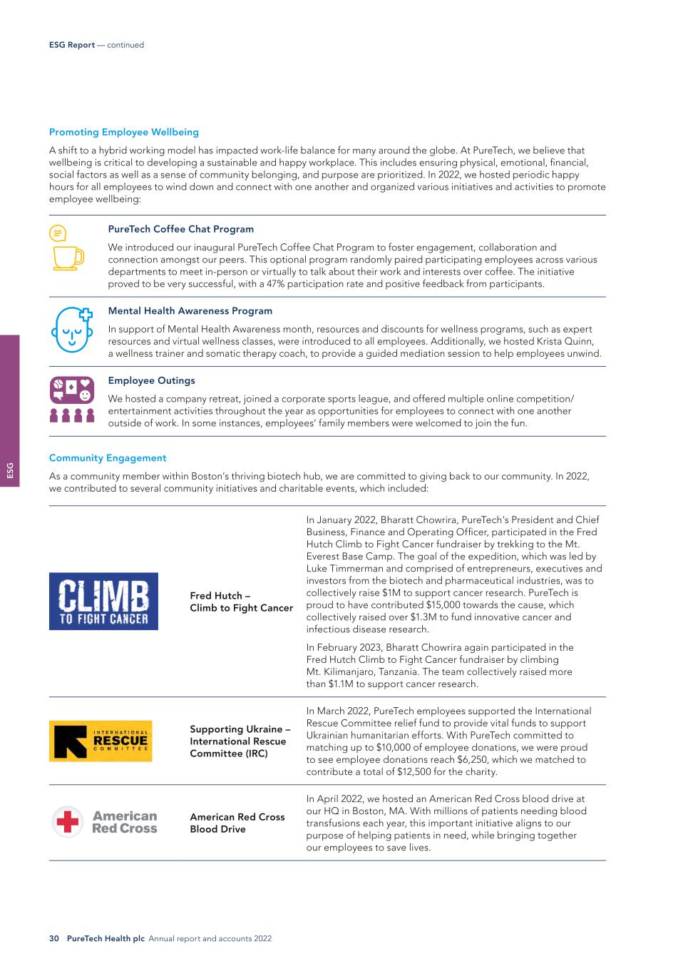 E SG 30 PureTech Health plc Annual report and accounts 2022 ESG Report — continued Promoting Employee Wellbeing A shift to a hybrid working model has impacted work-life balance for many around the globe. At PureTech, we believe that wellbeing is critical to developing a sustainable and happy workplace. This includes ensuring physical, emotional, financial, social factors as well as a sense of community belonging, and purpose are prioritized. In 2022, we hosted periodic happy hours for all employees to wind down and connect with one another and organized various initiatives and activities to promote employee wellbeing: PureTech Coffee Chat Program We introduced our inaugural PureTech Coffee Chat Program to foster engagement, collaboration and connection amongst our peers. This optional program randomly paired participating employees across various departments to meet in-person or virtually to talk about their work and interests over coffee. The initiative proved to be very successful, with a 47% participation rate and positive feedback from participants. Mental Health Awareness Program In support of Mental Health Awareness month, resources and discounts for wellness programs, such as expert resources and virtual wellness classes, were introduced to all employees. Additionally, we hosted Krista Quinn, a wellness trainer and somatic therapy coach, to provide a guided mediation session to help employees unwind. Employee Outings We hosted a company retreat, joined a corporate sports league, and offered multiple online competition/ entertainment activities throughout the year as opportunities for employees to connect with one another outside of work. In some instances, employees’ family members were welcomed to join the fun. Community Engagement As a community member within Boston’s thriving biotech hub, we are committed to giving back to our community. In 2022, we contributed to several community initiatives and charitable events, which included: Fred Hutch – Climb to Fight Cancer In January 2022, Bharatt Chowrira, PureTech’s President and Chief Business, Finance and Operating Officer, participated in the Fred Hutch Climb to Fight Cancer fundraiser by trekking to the Mt. Everest Base Camp. The goal of the expedition, which was led by Luke Timmerman and comprised of entrepreneurs, executives and investors from the biotech and pharmaceutical industries, was to collectively raise $1M to support cancer research. PureTech is proud to have contributed $15,000 towards the cause, which collectively raised over $1.3M to fund innovative cancer and infectious disease research. In February 2023, Bharatt Chowrira again participated in the Fred Hutch Climb to Fight Cancer fundraiser by climbing Mt. Kilimanjaro, Tanzania. The team collectively raised more than $1.1M to support cancer research. Supporting Ukraine – International Rescue Committee (IRC) In March 2022, PureTech employees supported the International Rescue Committee relief fund to provide vital funds to support Ukrainian humanitarian efforts. With PureTech committed to matching up to $10,000 of employee donations, we were proud to see employee donations reach $6,250, which we matched to contribute a total of $12,500 for the charity. American Red Cross Blood Drive In April 2022, we hosted an American Red Cross blood drive at our HQ in Boston, MA. With millions of patients needing blood transfusions each year, this important initiative aligns to our purpose of helping patients in need, while bringing together our employees to save lives.