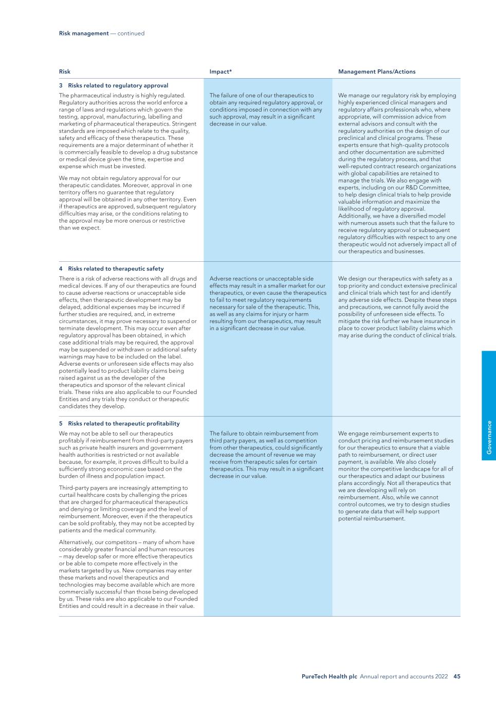 PureTech Health plc Annual report and accounts 2022 45 G o ve rn an ce Risk Impact* Management Plans/Actions 3 Risks related to regulatory approval The pharmaceutical industry is highly regulated. Regulatory authorities across the world enforce a range of laws and regulations which govern the testing, approval, manufacturing, labelling and marketing of pharmaceutical therapeutics. Stringent standards are imposed which relate to the quality, safety and efficacy of these therapeutics. These requirements are a major determinant of whether it is commercially feasible to develop a drug substance or medical device given the time, expertise and expense which must be invested. We may not obtain regulatory approval for our therapeutic candidates. Moreover, approval in one territory offers no guarantee that regulatory approval will be obtained in any other territory. Even if therapeutics are approved, subsequent regulatory difficulties may arise, or the conditions relating to the approval may be more onerous or restrictive than we expect. The failure of one of our therapeutics to obtain any required regulatory approval, or conditions imposed in connection with any such approval, may result in a significant decrease in our value. We manage our regulatory risk by employing highly experienced clinical managers and regulatory affairs professionals who, where appropriate, will commission advice from external advisors and consult with the regulatory authorities on the design of our preclinical and clinical programs. These experts ensure that high-quality protocols and other documentation are submitted during the regulatory process, and that well-reputed contract research organizations with global capabilities are retained to manage the trials. We also engage with experts, including on our R&D Committee, to help design clinical trials to help provide valuable information and maximize the likelihood of regulatory approval. Additionally, we have a diversified model with numerous assets such that the failure to receive regulatory approval or subsequent regulatory difficulties with respect to any one therapeutic would not adversely impact all of our therapeutics and businesses. 4 Risks related to therapeutic safety There is a risk of adverse reactions with all drugs and medical devices. If any of our therapeutics are found to cause adverse reactions or unacceptable side effects, then therapeutic development may be delayed, additional expenses may be incurred if further studies are required, and, in extreme circumstances, it may prove necessary to suspend or terminate development. This may occur even after regulatory approval has been obtained, in which case additional trials may be required, the approval may be suspended or withdrawn or additional safety warnings may have to be included on the label. Adverse events or unforeseen side effects may also potentially lead to product liability claims being raised against us as the developer of the therapeutics and sponsor of the relevant clinical trials. These risks are also applicable to our Founded Entities and any trials they conduct or therapeutic candidates they develop. Adverse reactions or unacceptable side effects may result in a smaller market for our therapeutics, or even cause the therapeutics to fail to meet regulatory requirements necessary for sale of the therapeutic. This, as well as any claims for injury or harm resulting from our therapeutics, may result in a significant decrease in our value. We design our therapeutics with safety as a top priority and conduct extensive preclinical and clinical trials which test for and identify any adverse side effects. Despite these steps and precautions, we cannot fully avoid the possibility of unforeseen side effects. To mitigate the risk further we have insurance in place to cover product liability claims which may arise during the conduct of clinical trials. 5 Risks related to therapeutic profitability We may not be able to sell our therapeutics profitably if reimbursement from third-party payers such as private health insurers and government health authorities is restricted or not available because, for example, it proves difficult to build a sufficiently strong economic case based on the burden of illness and population impact. Third-party payers are increasingly attempting to curtail healthcare costs by challenging the prices that are charged for pharmaceutical therapeutics and denying or limiting coverage and the level of reimbursement. Moreover, even if the therapeutics can be sold profitably, they may not be accepted by patients and the medical community. Alternatively, our competitors – many of whom have considerably greater financial and human resources – may develop safer or more effective therapeutics or be able to compete more effectively in the markets targeted by us. New companies may enter these markets and novel therapeutics and technologies may become available which are more commercially successful than those being developed by us. These risks are also applicable to our Founded Entities and could result in a decrease in their value. The failure to obtain reimbursement from third party payers, as well as competition from other therapeutics, could significantly decrease the amount of revenue we may receive from therapeutic sales for certain therapeutics. This may result in a significant decrease in our value. We engage reimbursement experts to conduct pricing and reimbursement studies for our therapeutics to ensure that a viable path to reimbursement, or direct user payment, is available. We also closely monitor the competitive landscape for all of our therapeutics and adapt our business plans accordingly. Not all therapeutics that we are developing will rely on reimbursement. Also, while we cannot control outcomes, we try to design studies to generate data that will help support potential reimbursement. Risk management — continued