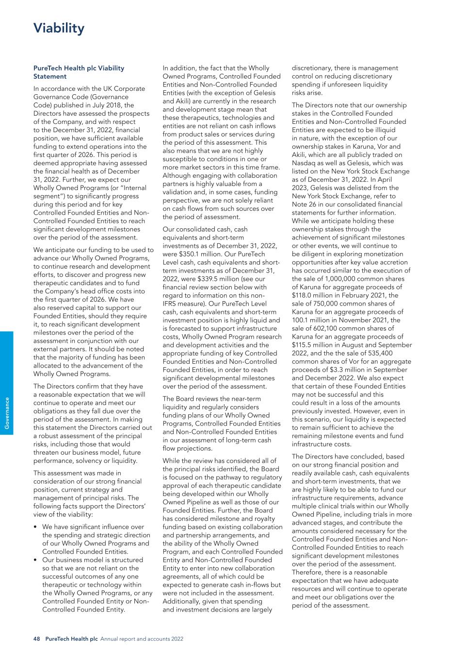 48 PureTech Health plc Annual report and accounts 2022 G o ve rn an ce Viability PureTech Health plc Viability Statement In accordance with the UK Corporate Governance Code (Governance Code) published in July 2018, the Directors have assessed the prospects of the Company, and with respect to the December 31, 2022, financial position, we have sufficient available funding to extend operations into the first quarter of 2026. This period is deemed appropriate having assessed the financial health as of December 31, 2022. Further, we expect our Wholly Owned Programs (or “Internal segment”) to significantly progress during this period and for key Controlled Founded Entities and Non- Controlled Founded Entities to reach significant development milestones over the period of the assessment. We anticipate our funding to be used to advance our Wholly Owned Programs, to continue research and development efforts, to discover and progress new therapeutic candidates and to fund the Company’s head office costs into the first quarter of 2026. We have also reserved capital to support our Founded Entities, should they require it, to reach significant development milestones over the period of the assessment in conjunction with our external partners. It should be noted that the majority of funding has been allocated to the advancement of the Wholly Owned Programs. The Directors confirm that they have a reasonable expectation that we will continue to operate and meet our obligations as they fall due over the period of the assessment. In making this statement the Directors carried out a robust assessment of the principal risks, including those that would threaten our business model, future performance, solvency or liquidity. This assessment was made in consideration of our strong financial position, current strategy and management of principal risks. The following facts support the Directors’ view of the viability: • We have significant influence over the spending and strategic direction of our Wholly Owned Programs and Controlled Founded Entities. • Our business model is structured so that we are not reliant on the successful outcomes of any one therapeutic or technology within the Wholly Owned Programs, or any Controlled Founded Entity or Non- Controlled Founded Entity. In addition, the fact that the Wholly Owned Programs, Controlled Founded Entities and Non-Controlled Founded Entities (with the exception of Gelesis and Akili) are currently in the research and development stage mean that these therapeutics, technologies and entities are not reliant on cash inflows from product sales or services during the period of this assessment. This also means that we are not highly susceptible to conditions in one or more market sectors in this time frame. Although engaging with collaboration partners is highly valuable from a validation and, in some cases, funding perspective, we are not solely reliant on cash flows from such sources over the period of assessment. Our consolidated cash, cash equivalents and short-term investments as of December 31, 2022, were $350.1 million. Our PureTech Level cash, cash equivalents and short- term investments as of December 31, 2022, were $339.5 million (see our financial review section below with regard to information on this non- IFRS measure). Our PureTech Level cash, cash equivalents and short-term investment position is highly liquid and is forecasted to support infrastructure costs, Wholly Owned Program research and development activities and the appropriate funding of key Controlled Founded Entities and Non-Controlled Founded Entities, in order to reach significant developmental milestones over the period of the assessment. The Board reviews the near-term liquidity and regularly considers funding plans of our Wholly Owned Programs, Controlled Founded Entities and Non-Controlled Founded Entities in our assessment of long-term cash flow projections. While the review has considered all of the principal risks identified, the Board is focused on the pathway to regulatory approval of each therapeutic candidate being developed within our Wholly Owned Pipeline as well as those of our Founded Entities. Further, the Board has considered milestone and royalty funding based on existing collaboration and partnership arrangements, and the ability of the Wholly Owned Program, and each Controlled Founded Entity and Non-Controlled Founded Entity to enter into new collaboration agreements, all of which could be expected to generate cash in-flows but were not included in the assessment. Additionally, given that spending and investment decisions are largely discretionary, there is management control on reducing discretionary spending if unforeseen liquidity risks arise. The Directors note that our ownership stakes in the Controlled Founded Entities and Non-Controlled Founded Entities are expected to be illiquid in nature, with the exception of our ownership stakes in Karuna, Vor and Akili, which are all publicly traded on Nasdaq as well as Gelesis, which was listed on the New York Stock Exchange as of December 31, 2022. In April 2023, Gelesis was delisted from the New York Stock Exchange, refer to Note 26 in our consolidated financial statements for further information. While we anticipate holding these ownership stakes through the achievement of significant milestones or other events, we will continue to be diligent in exploring monetization opportunities after key value accretion has occurred similar to the execution of the sale of 1,000,000 common shares of Karuna for aggregate proceeds of $118.0 million in February 2021, the sale of 750,000 common shares of Karuna for an aggregate proceeds of 100.1 million in November 2021, the sale of 602,100 common shares of Karuna for an aggregate proceeds of $115.5 million in August and September 2022, and the the sale of 535,400 common shares of Vor for an aggregate proceeds of $3.3 million in September and December 2022. We also expect that ce