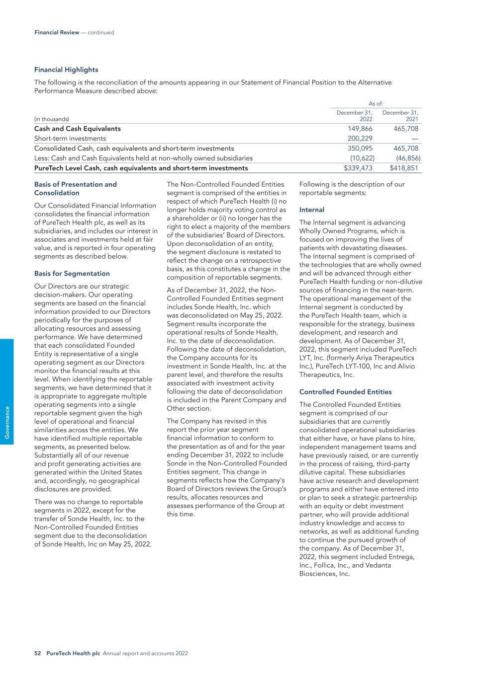52 PureTech Health plc Annual report and accounts 2022 G o ve rn an ce Financial Review — continued Financial Highlights The following is the reconciliation of the amounts appearing in our Statement of Financial Position to the Alternative Performance Measure described above: As of: (in thousands) December 31, 2022 December 31, 2021 Cash and Cash Equivalents 149,866 465,708 Short-term investments 200,229 — Consolidated Cash, cash equivalents and short-term investments 350,095 465,708 Less: Cash and Cash Equivalents held at non-wholly owned subsidiaries (10,622) (46,856) PureTech Level Cash, cash equivalents and short-term investments $339,473 $418,851 Basis of Presentation and Consolidation Our Consolidated Financial Information consolidates the financial information of PureTech Health plc, as well as its subsidiaries, and includes our interest in associates and investments held at fair value, and is reported in four operating segments as described below. Basis for Segmentation Our Directors are our strategic decision-makers. Our operating segments are based on the financial information provided to our Directors periodically for the purposes of allocating resources and assessing performance. We have determined that each consolidated Founded Entity is representative of a single operating segment as our Directors monitor the financial results at this level. When identifying the reportable segments, we have determined that it is appropriate to aggregate multiple operating segments into a single reportable segment given the high level of operational and financial similarities across the entities. We have identified multiple reportable segments, as presented below. Substantially all of our revenue and profit generating activities are generated within the United States and, accordingly, no geographical disclosures are provided. There was no change to reportable segments in 2022, except for the transfer of Sonde Health, Inc. to the Non-Controlled Founded Entities segment due to the deconsolidation of Sonde Health, Inc on May 25, 2022. The Non-Controlled Founded Entities segment is comprised of the entities in respect of which PureTech Health (i) no longer holds majority voting control as a shareholder or (ii) no longer has the right to elect a majority of the members of the subsidiaries’ Board of Directors. Upon deconsolidation of an entity, the segment disclosure is restated to reflect the change on a retrospective basis, as this constitutes a change in the composition of reportable segments. As of December 31, 2022, the Non- Controlled Founded Entities segment includes Sonde Health, Inc. which was deconsolidated on May 25, 2022. Segment results incorporate the operational results of Sonde Health, Inc. to the date of deconsolidation. Following the date of deconsolidation, the Company accounts for its investment in Sonde Health, Inc. at the parent level, and therefore the results associated with investment activity following the date of deconsolidation is included in the Parent Company and Other section. The Company has revised in this report the prior year segment financial information to conform to the presentation as of and for the year ending December 31, 2022 to include Sonde in the Non-Controlled Founded Entities segment. This change in segments reflects how the Company’s Board of Directors reviews the Group’s results, allocates resources and assesses performance of the Group at this time. Following is the description of our reportable segments: Internal The Internal segment is advancing Wholly Owned Programs, which is focused on improving the lives of patients with devastating diseases. The Internal segment is comprised of the technologies that are wholly owned and will be advanced through either PureTech Health funding or non-dilutive sources of financing in the near-term. The operational management of the Internal segment is conducted by the PureTech Health team, which is responsible for the strategy, business development, and research and development. As of December 31, 2022, this segment included PureTech LYT, Inc. (formerly Ariya Therapeutics Inc.), PureTech LYT-100, Inc and Alivio Therapeutics, Inc. Controlled Founded Entities The Controlled Founded Entities segment is comprised of our subsidiaries that are currently consolidated operational subsidiaries that either have, or have plans to hire, independent management teams and have previously raised, or are currently in the process of raising, third-party dilutive capital. These subsidiaries have active research and development programs and either have entered into or plan to seek a strategic partnership with an equity or debt investment partner, who will provide additional industry knowledge and access to networks, as well as additional funding to continue the pursued growth of the company. As of December 31, 2022, this segment included Entrega, Inc., Follica, Inc., and Vedanta Biosciences, Inc.
