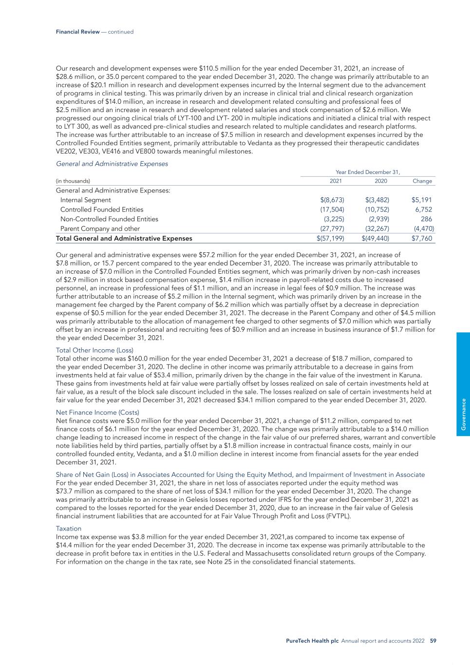 PureTech Health plc Annual report and accounts 2022 59 G o ve rn an ce Financial Review — continued Our research and development expenses were $110.5 million for the year ended December 31, 2021, an increase of $28.6 million, or 35.0 percent compared to the year ended December 31, 2020. The change was primarily attributable to an increase of $20.1 million in research and development expenses incurred by the Internal segment due to the advancement of programs in clinical testing. This was primarily driven by an increase in clinical trial and clinical research organization expenditures of $14.0 million, an increase in research and development related consulting and professional fees of $2.5 million and an increase in research and development related salaries and stock compensation of $2.6 million. We progressed our ongoing clinical trials of LYT-100 and LYT- 200 in multiple indications and initiated a clinical trial with respect to LYT 300, as well as advanced pre-clinical studies and research related to multiple candidates and research platforms. The increase was further attributable to an increase of $7.5 million in research and development expenses incurred by the Controlled Founded Entities segment, primarily attributable to Vedanta as they progressed their therapeutic candidates VE202, VE303, VE416 and VE800 towards meaningful milestones. General and Administrative Expenses Year Ended December 31, (in thousands) 2021 2020 Change General and Administrative Expenses: Internal Segment $(8,673) $(3,482) $5,191 Controlled Founded Entities (17,504) (10,752) 6,752 Non-Controlled Founded Entities (3,225) (2,939) 286 Parent Company and other (27,797) (32,267) (4,470) Total General and Administrative Expenses $(57,199) $(49,440) $7,760 Our general and administrative expenses were $57.2 million for the year ended December 31, 2021, an increase of $7.8 million, or 15.7 percent compared to the year ended December 31, 2020. The increase was primarily attributable to an increase of $7.0 million in the Controlled Founded Entities segment, which was primarily driven by non-cash increases of $2.9 million in stock based compensation expense, $1.4 million increase in payroll-related costs due to increased personnel, an increase in professional fees of $1.1 million, and an increase in legal fees of $0.9 million. The increase was further attributable to an increase of $5.2 million in the Internal segment, which was primarily driven by an increase in the management fee charged by the Parent company of $6.2 million which was partially offset by a decrease in depreciation expense of $0.5 million for the year ended December 31, 2021. The decrease in the Parent Company and other of $4.5 million was primarily attributable to the allocation of management fee charged to other segments of $7.0 million which was partially offset by an increase in professional and recruiting fees of $0.9 million and an increase in business insurance of $1.7 million for the year ended December 31, 2021. Total Other Income (Loss) Total other income was $160.0 million for the year ended December 31, 2021 a decrease of $18.7 million, compared to the year ended December 31, 2020. The decline in other income was primarily attributable to a decrease in gains from investments held at fair value of $53.4 million, primarily driven by the change in the fair value of the investment in Karuna. These gains from investments held at fair value were partially offset by losses realized on sale of certain investments held at fair value, as a result of the block sale discount included in the sale. The losses realized on sale of certain investments held at fair value for the year ended December 31, 2021 decreased $34.1 million compared to the year ended December 31, 2020. Net Finance Income (Costs) Net finance costs were $5.0 million for the year ended December 31, 2021, a change of $11.2 million, compared to net finance costs of $6.1 million for the year ended December 31, 2020. The change was primarily attributable to a $14.0 million change leading to increased income in respect of the change in the fair value of our preferred shares, warrant and convertible note liabilities held by third parties, partially offset by a $1.8 million increase in contractual finance costs, mainly in our controlled founded entity, Vedanta, and a $1.0 million decline in interest income from financial assets for the year ended December 31, 2021. Share of Net Gain (Loss) in Associates Accounted for Using the Equity Method, and Impairment of Investment in Associate For the year ended December 31, 2021, the share in net loss of associates reported under the equity method was $73.7 million as compared to the share of net loss of $34.1 million for the year ended December 31, 2020. The change was primarily attributable to an increase in Gelesis losses reported under IFRS for the year ended December 31, 2021 as compared to the losses reported for the year ended December 31, 2020, due to an increase in the fair value of Gelesis financial instrument liabilities that are accounted for at Fair Value Through Profit and Loss (FVTPL). Taxation Income tax expense was $3.8 million for the year ended December 31, 2021,as compared to income tax expense of $14.4 million for the year ended December 31, 2020. The decrease in income tax expense was primarily attributable to the decrease in profit before tax in entities in the U.S. Federal and Massachusetts consolidated return groups of the Company. For information on the change in the tax rate, see Note 25 in the consolidated financial statements.
