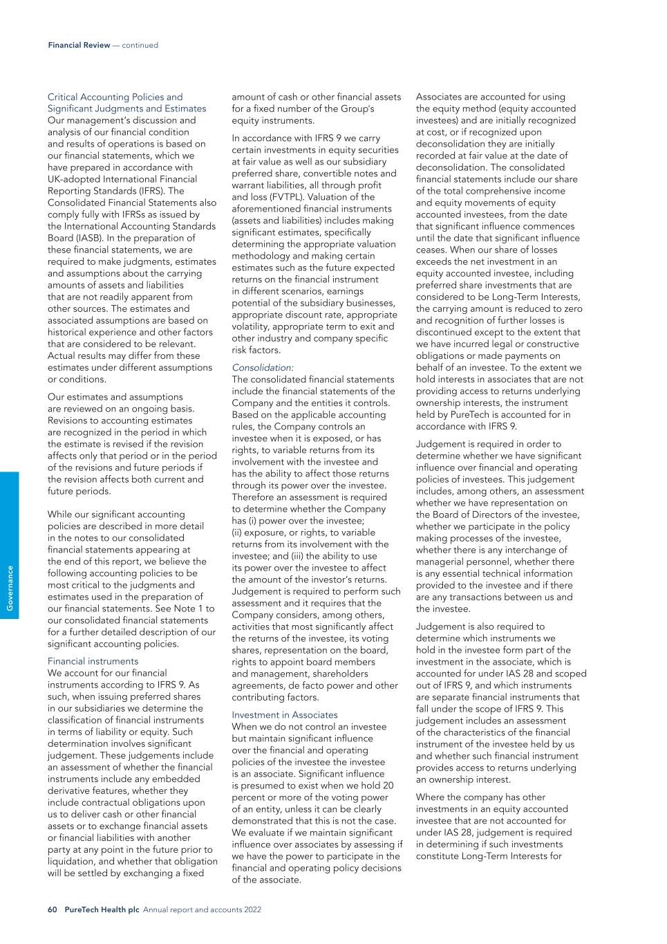 60 PureTech Health plc Annual report and accounts 2022 G o ve rn an ce Financial Review — continued Critical Accounting Policies and Significant Judgments and Estimates Our management’s discussion and analysis of our financial condition and results of operations is based on our financial statements, which we have prepared in accordance with UK-adopted International Financial Reporting Standards (IFRS). The Consolidated Financial Statements also comply fully with IFRSs as issued by the International Accounting Standards Board (IASB). In the preparation of these financial statements, we are required to make judgments, estimates and assumptions about the carrying amounts of assets and liabilities that are not readily apparent from other sources. The estimates and associated assumptions are based on historical experience and other factors that are considered to be relevant. Actual results may differ from these estimates under different assumptions or conditions. Our estimates and assumptions are reviewed on an ongoing basis. Revisions to accounting estimates are recognized in the period in which the estimate is revised if the revision affects only that period or in the period of the revisions and future periods if the revision affects both current and future periods. While our significant accounting policies are described in more detail in the notes to our consolidated financial statements appearing at the end of this report, we believe the following accounting policies to be most critical to the judgments and estimates used in the preparation of our financial statements. See Note 1 to our consolidated financial statements for a further detailed description of our significant accounting policies. Financial instruments We account for our financial instruments according to IFRS 9. As such, when issuing preferred shares in our subsidiaries we determine the classification of financial instruments in terms of liability or equity. Such determination involves significant judgement. These judgements include an assessment of whether the financial instruments include any embedded derivative features, whether they include contractual obligations upon us to deliver cash or other financial assets or to exchange financial assets or financial liabilities with another party at any point in the future prior to liquidation, and whether that obligation will be settled by exchanging a fixed amount of cash or other financial assets for a fixed number of the Group's equity instruments. In accordance with IFRS 9 we carry certain investments in equity securities at fair value as well as our subsidiary preferred share, convertible notes and warrant liabilities, all through profit and loss (FVTPL). Valuation of the aforementioned financial instruments (assets and liabilities) includes making significant estimates, specifically determining the appropriate valuation methodology and making certain estimates such as the future expected returns on the financial instrument in different scenarios, earnings potential of the subsidiary businesses, appropriate discount rate, appropriate volatility, appropriate term to exit and other industry and company specific risk factors. Consolidation: The consolidated financial statements include the financial statements of the Company and the entities it controls. Based on the applicable accounting rules, the Company controls an investee when it is exposed, or has rights, to variable returns from its involvement with the investee and has the ability to affect those returns through its power over the investee. Therefore an assessment is required to determine whether the Company has (i) power over the investee; (ii) exposure, or rights, to variable returns from its involvement with the investee; and (iii) the ability to use its power over the investee to affect the amount of the investor’s returns. Judgement is required to perform such assessment and it requires that the Company considers, among others, activities that most significantly affect the returns of the investee, its voting shares, representation on the board, rights to appoint board members and management, shareholders agreements, de facto power and other contributing factors. Investment in Associates When we do not control an investee but maintain significant influence over the financial and operating policies of the investee the investee is an associate. Significant influence is presumed to exist when we hold 20 percent or more of the voting power of an entity, unless it can be clearly demonstrated that this is not the case. We evaluate if we maintain significant influence over associates by assessing if we have the power to participate in the financial and operating policy decisions of the associate. Associates are accounted for using the equity method (equity accounted investees) and are initially recognized at cost, or if recognized upon deconsolidation they are initially recorded at fair value at the date of deconsolidation. The consolidated financial statements include our share of the total comprehensive income and equity movements of equity accounted investees, from the date that significant influence commences until the date that significant influence ceases. When our share of losses exceeds the net investment in an equity accounted investee, including preferred share investments that are considered to be Long-Term Interests, the carrying amount is reduced to zero and recognition of further losses is discontinued except to the extent that we have incurred legal or constructive obligations or made payments on behalf of an investee. To the extent we hold interests in associates that are not providing access to returns underlying ownership interests, the instrument held by PureTech is accounted for in accordance with IFRS 9. Judgement is required in order to determine whether we have significant influence over financial and operating policies of investees. This judgement includes, among others, an assessment whethe