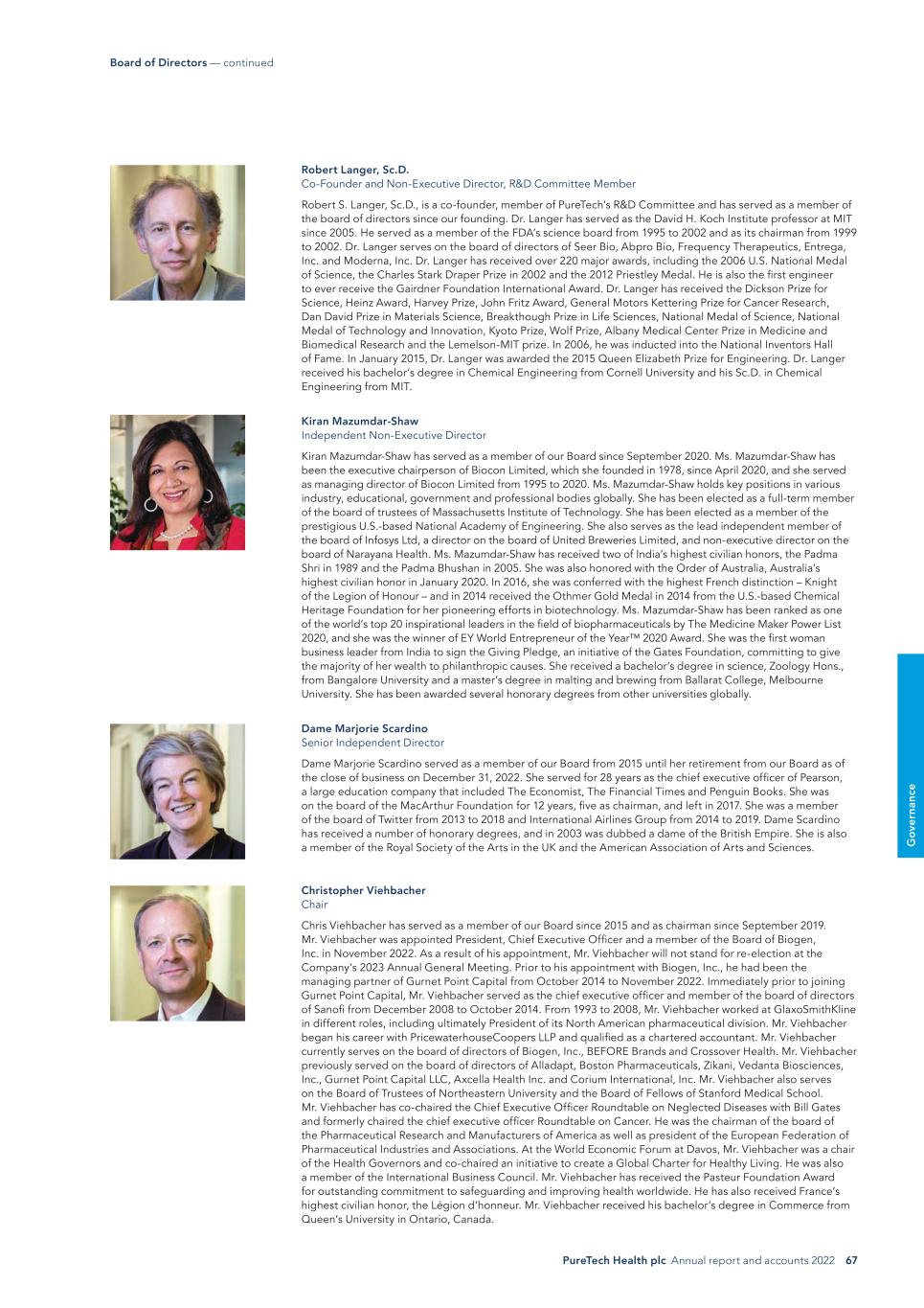 PureTech Health plc Annual report and accounts 2022 67 G o ve rn an ce Robert Langer, Sc.D. Co-Founder and Non-Executive Director, R&D Committee Member Robert S. Langer, Sc.D., is a co-founder, member of PureTech’s R&D Committee and has served as a member of the board of directors since our founding. Dr. Langer has served as the David H. Koch Institute professor at MIT since 2005. He served as a member of the FDA’s science board from 1995 to 2002 and as its chairman from 1999 to 2002. Dr. Langer serves on the board of directors of Seer Bio, Abpro Bio, Frequency Therapeutics, Entrega, Inc. and Moderna, Inc. Dr. Langer has received over 220 major awards, including the 2006 U.S. National Medal of Science, the Charles Stark Draper Prize in 2002 and the 2012 Priestley Medal. He is also the first engineer to ever receive the Gairdner Foundation International Award. Dr. Langer has received the Dickson Prize for Science, Heinz Award, Harvey Prize, John Fritz Award, General Motors Kettering Prize for Cancer Research, Dan David Prize in Materials Science, Breakthough Prize in Life Sciences, National Medal of Science, National Medal of Technology and Innovation, Kyoto Prize, Wolf Prize, Albany Medical Center Prize in Medicine and Biomedical Research and the Lemelson-MIT prize. In 2006, he was inducted into the National Inventors Hall of Fame. In January 2015, Dr. Langer was awarded the 2015 Queen Elizabeth Prize for Engineering. Dr. Langer received his bachelor’s degree in Chemical Engineering from Cornell University and his Sc.D. in Chemical Engineering from MIT. Kiran Mazumdar-Shaw Independent Non-Executive Director Kiran Mazumdar-Shaw has served as a member of our Board since September 2020. Ms. Mazumdar-Shaw has been the executive chairperson of Biocon Limited, which she founded in 1978, since April 2020, and she served as managing director of Biocon Limited from 1995 to 2020. Ms. Mazumdar-Shaw holds key positions in various industry, educational, government and professional bodies globally. She has been elected as a full-term member of the board of trustees of Massachusetts Institute of Technology. She has been elected as a member of the prestigious U.S.-based National Academy of Engineering. She also serves as the lead independent member of the board of Infosys Ltd, a director on the board of United Breweries Limited, and non-executive director on the board of Narayana Health. Ms. Mazumdar-Shaw has received two of India’s highest civilian honors, the Padma Shri in 1989 and the Padma Bhushan in 2005. She was also honored with the Order of Australia, Australia’s highest civilian honor in January 2020. In 2016, she was conferred with the highest French distinction – Knight of the Legion of Honour – and in 2014 received the Othmer Gold Medal in 2014 from the U.S.-based Chemical Heritage Foundation for her pioneering efforts in biotechnology. Ms. Mazumdar-Shaw has been ranked as one of the world’s top 20 inspirational leaders in the field of biopharmaceuticals by The Medicine Maker Power List 2020, and she was the winner of EY World Entrepreneur of the Year™ 2020 Award. She was the first woman business leader from India to sign the Giving Pledge, an initiative of the Gates Foundation, committing to give the majority of her wealth to philanthropic causes. She received a bachelor’s degree in science, Zoology Hons., from Bangalore University and a master’s degree in malting and brewing from Ballarat College, Melbourne University. She has been awarded several honorary degrees from other universities globally. Dame Marjorie Scardino Senior Independent Director Dame Marjorie Scardino served as a member of our Board from 2015 until her retirement from our Board as of the close of business on December 31, 2022. She served for 28 years as the chief executive officer of Pearson, a large education company that included The Economist, The Financial Times and Penguin Books. She was on the board of the MacArthur Foundation for 12 years, five as chairman, and left in 2017. She was a member of the board of Twitter from 2013 to 2018 and International Airlines Group from 2014 to 2019. Dame Scardino has received a number of honorary degrees, and in 2003 was dubbed a dame of the British Empire. She is also a member of the Royal Society of the Arts in the UK and the American Association of Arts and Sciences. Christopher Viehbacher Chair Chris Viehbacher has served as a member of our Board since 2015 and as chairman since September 2019. Mr. Viehbacher was appointed President, Chief Executive Officer and a member of the Board of Biogen, Inc. in November 2022. As a result of his appointment, Mr. Viehbacher will not stand for re-election at the Company’s 2023 Annual General Meeting. Prior to his appointment with Biogen, Inc., he had been the managing partner of Gurnet Point Capital from October 2014 to November 2022. Immediately prior to joining Gurnet Point Capital, Mr. Viehbacher served as the chief executive officer and member of the board of directors of Sanofi from December 2008 to October 2014. From 1993 to 2008, Mr. Viehbacher worked at GlaxoSmithKline in different roles, including ultimately President of its North American pharmaceutical division. Mr. Viehbacher began his career with PricewaterhouseCoopers LLP and qualified as a chartered accountant. Mr. Viehbacher currently serves on the board of directors of Biogen, Inc., BEFORE Brands and Crossover Health. Mr. Viehbacher previously served on the board of directors of Alladapt, Boston Pharmaceuticals, Zikani, Vedanta Biosciences, Inc., Gurnet Point Capital LLC, Axcella Health Inc. and Corium International, Inc. Mr. Viehbacher also serves on the Board of Trustees of Northeastern University and the Board of Fellows of Stanford Medical School. Mr. Viehbacher has co-chaired the Chief Executive Officer Roundtable on Neglected Diseases with Bill Gates and formerly chaired the chief executive officer Roundtable on Cancer. He was the chairman of