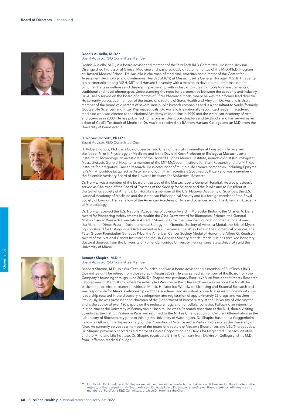 68 PureTech Health plc Annual report and accounts 2022 G o ve rn an ce Dennis Ausiello, M.D.** Board Advisor, R&D Committee Member Dennis Ausiello, M.D., is a board advisor and member of the PureTech R&D Committee. He is the Jackson Distinguished Professor of Clinical Medicine and was previously director, emeritus of the M.D./Ph.D. Program at Harvard Medical School. Dr. Ausiello is chairman of medicine, emeritus and director of the Center for Assessment Technology and Continuous Health (CATCH) at Massachusetts General Hospital (MGH). This center is a partnership among MGH, MIT and Harvard University with a mission to develop real-time assessment of human traits in wellness and disease. In partnership with industry, it is creating tools for measurements of traditional and novel phenotypes. Understanding the need for partnerships between the academy and industry, Dr. Ausiello served on the board of directors of Pfizer Pharmaceuticals, where he was their former lead director. He currently serves as a member of the board of directors of Seres Health and Alnylam. Dr. Ausiello is also a member of the board of directors of several non-public biotech companies and is a consultant to Verily (formerly Google Life Sciences) and Pfizer Pharmaceuticals. Dr. Ausiello is a nationally recognized leader in academic medicine who was elected to the National Academy of Medicine in 1999 and the American Academy of Arts and Sciences in 2003. He has published numerous articles, book chapters and textbooks and has served as an editor of Cecil’s Textbook of Medicine. Dr. Ausiello received his BA from Harvard College and an M.D. from the University of Pennsylvania. H. Robert Horvitz, Ph.D.** Board Advisor, R&D Committee Chair H. Robert Horvitz, Ph.D., is a board observer and Chair of the R&D Committee at PureTech. He received the Nobel Prize in Physiology or Medicine and is the David H Koch Professor of Biology at Massachusetts Institute of Technology, an investigator of the Howard Hughes Medical Institute, neurobiologist (Neurology) at Massachusetts General Hospital, a member of the MIT McGovern Institute for Brain Research and the MIT Koch Institute for Integrative Cancer Research. He is cofounder of multiple life science companies, including Epizyme (EPZM), Mitobridge (acquired by Astellas) and Idun Pharmaceuticals (acquired by Pfizer) and was a member of the Scientific Advisory Board of the Novartis Institutes for BioMedical Research. Dr. Horvitz was a member of the board of trustees of the Massachusetts General Hospital. He also previously served as Chairman of the Board of Trustees of the Society for Science and the Public and as President of the Genetics Society of America. Dr. Horvitz is a member of the U.S. National Academy of Sciences, the U.S. National Academy of Medicine and the American Philosophical Society and is a foreign member of the Royal Society of London. He is a fellow of the American Academy of Arts and Sciences and of the American Academy of Microbiology. Dr. Horvitz received the U.S. National Academies of Science Award in Molecular Biology; the Charles A. Dana Award for Pioneering Achievements in Health; the Ciba-Drew Award for Biomedical Science; the General Motors Cancer Research Foundation Alfred P. Sloan, Jr. Prize; the Gairdner Foundation International Award; the March of Dimes Prize in Developmental Biology; the Genetics Society of America Medal; the Bristol-Myers Squibb Award for Distinguished Achievement in Neuroscience; the Wiley Prize in the Biomedical Sciences; the Peter Gruber Foundation Genetics Prize; the American Cancer Society Medal of Honor; the Alfred G. Knudson Award of the National Cancer Institute; and the UK Genetics Society Mendel Medal. He has received honorary doctoral degrees from the University of Rome, Cambridge University, Pennsylvania State University and the University of Miami. Bennett Shapiro, M.D.** Board Advisor, R&D Committee Member Bennett Shapiro, M.D., is a PureTech co-founder, and was a board advisor and a member of PureTech’s R&D Committee until he retired from those roles in August 2022. He also served as member of the Board from the Company’s founding through June 2020. Dr. Shapiro was previously Executive Vice President at Merck Research Laboratories of Merck & Co. where he initially led Worldwide Basic Research and was responsible for all the basic and preclinical research activities at Merck. He later led Worldwide Licensing and External Research and was responsible for Merck’s relationships with the academic and industrial biomedical research community. His leadership resulted in the discovery, development and registration of approximately 25 drugs and vaccines. Previously, he was professor and chairman of the Department of Biochemistry at the University of Washington and is the author of over 120 papers on the molecular regulation of cellular behavior. Following an internship in Medicine at the University of Pennsylvania Hospital, he was a Research Associate at the NIH, then a Visiting Scientist at the Institut Pasteur in Paris and returned to the NIH as Chief-Section on Cellular Differentiation in the Laboratory of Biochemistry prior to joining the University of Washington. Dr. Shapiro has been a Guggenheim Fellow, a Fellow of the Japan Society for the Promotion of Science and a Visiting Professor at the University of Nice. He currently serves as a member of the board of directors of Vedanta Biosciences and VBL Therapeutics. Dr. Shapiro previously served as a director of Celera Corporation, the Drugs for Neglected Diseases initiative and the Mind and Life Institute. Dr. Shapiro received a B.S. in Chemistry from Dickinson College and his M.D. from Jefferson Medical College. Board of Directors — continued ** Dr. Horvitz, Dr. Ausiello and Dr. Shapiro are not members of the PureTech Board. As a Board Observer, Dr. Horvitz attends the majority of Board meetings. As Board Advisors, Dr. Ausiello and Dr. Shapiro attend select Board meetin