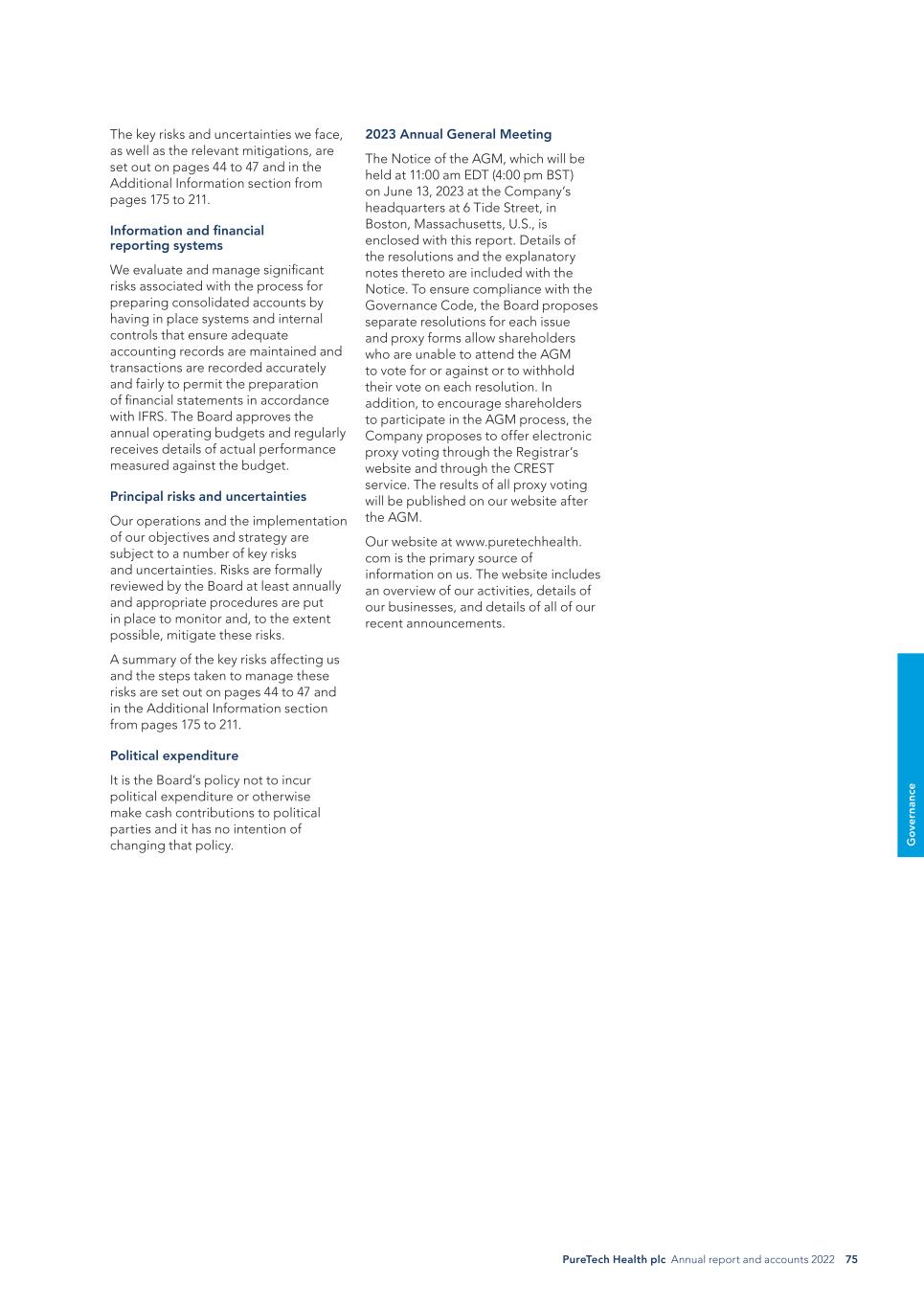 PureTech Health plc Annual report and accounts 2022 75 G o ve rn an ce The key risks and uncertainties we face, as well as the relevant mitigations, are set out on pages 44 to 47 and in the Additional Information section from pages 175 to 211. Information and financial reporting systems We evaluate and manage significant risks associated with the process for preparing consolidated accounts by having in place systems and internal controls that ensure adequate accounting records are maintained and transactions are recorded accurately and fairly to permit the preparation of financial statements in accordance with IFRS. The Board approves the annual operating budgets and regularly receives details of actual performance measured against the budget. Principal risks and uncertainties Our operations and the implementation of our objectives and strategy are subject to a number of key risks and uncertainties. Risks are formally reviewed by the Board at least annually and appropriate procedures are put in place to monitor and, to the extent possible, mitigate these risks. A summary of the key risks affecting us and the steps taken to manage these risks are set out on pages 44 to 47 and in the Additional Information section from pages 175 to 211. Political expenditure It is the Board’s policy not to incur political expenditure or otherwise make cash contributions to political parties and it has no intention of changing that policy. 2023 Annual General Meeting The Notice of the AGM, which will be held at 11:00 am EDT (4:00 pm BST) on June 13, 2023 at the Company’s headquarters at 6 Tide Street, in Boston, Massachusetts, U.S., is enclosed with this report. Details of the resolutions and the explanatory notes thereto are included with the Notice. To ensure compliance with the Governance Code, the Board proposes separate resolutions for each issue and proxy forms allow shareholders who are unable to attend the AGM to vote for or against or to withhold their vote on each resolution. In addition, to encourage shareholders to participate in the AGM process, the Company proposes to offer electronic proxy voting through the Registrar’s website and through the CREST service. The results of all proxy voting will be published on our website after the AGM. Our website at www.puretechhealth. com is the primary source of information on us. The website includes an overview of our activities, details of our businesses, and details of all of our recent announcements.