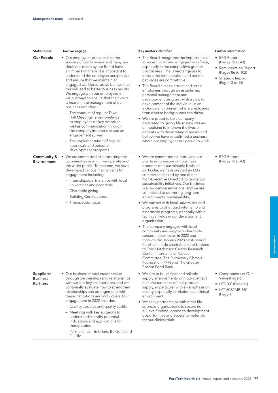 PureTech Health plc Annual report and accounts 2022 77 G o ve rn an ce Stakeholder How we engage Key matters identified Further information Our People • Our employees are crucial to the success of our business and many key decisions made by our Board have an impact on them. It is important to understand the employee perspective and ensure that we maintain an engaged workforce, as we believe that this will lead to better business results. We engage with our employees in various ways to ensure that their voice is heard in the management of our business including: – The conduct of regular Town Hall Meetings, email briefings to employees on key events as well as communication through the company intranet site and an engagement survey – The implementation of regular appraisals and personal development programs • The Board recognizes the importance of an incentivized and engaged workforce, especially in the competitive greater Boston area. The Board engages to ensure the remuneration and benefit packages are competitive. • The Board aims to attract and retain employees through an established personal management and development program, with a view to development of the individual in an inclusive environment where employees from diverse backgrounds can thrive. • We are proud to be a company dedicated to giving life to new classes of medicine to improve the lives of patients with devastating diseases and believe we have established a business where our employees are proud to work. • ESG Report (Pages 15 to 43) • Remuneration Report (Pages 86 to 102) • Strategic Report (Pages 3 to 14) Community & Environment • We are committed to supporting the communities in which we operate and the wider public. To that end, we have developed various mechanisms for engagement including: – Internships/partnerships with local universities and programs – Charitable giving – Building Certifications – Therapeutic Focus • We are committed to improving our practices to ensure our business operates on a sustainable basis. In particular, we have created an ESG committee chaired by one of our Non-Executive Directors to guide our sustainability initiatives. Our business is a low carbon emissions, and we are committed to delivering long-term environmental sustainability. • We partner with local universities and programs to offer paid internship and externship programs, generally within technical fields in our development organization. • The company engages with local community and supports charitable causes. In particular, in 2022 and through the January 2023 post-period, PureTech made charitable contributions to Fred Hutchinson Cancer Research Center, International Rescue Committee, The Pulmonary Fibrosis Foundation (PFF) and The Greater Boston Food Bank. • ESG Report (Pages 15 to 43) Suppliers/ Business Partners • Our business model creates value through partnerships and relationships with various key collaborators, and we continually evaluate how to strengthen relationships and arrangements with these institutions and individuals. Our engagement in 2022 included: – Quality updates and quality audits – Meetings with key surgeons to understand/identify potential indications and applications for therapeutics – Partnerships – Imbrium, BeiGene and Eli Lilly • We aim to build clear and reliable supply arrangements with our contract manufacturers for clinical product supply, in particular with an emphasis on quality, especially in relation to a clinical environment. • We seek partnerships with other life sciences organizations to secure non- dilutive funding, access to development opportunities and access to materials for our clinical trials. • Components of Our Value (Page 6) • LYT-200 (Page 11) • LYT-503/IMB-150 (Page 4) Management team — continued