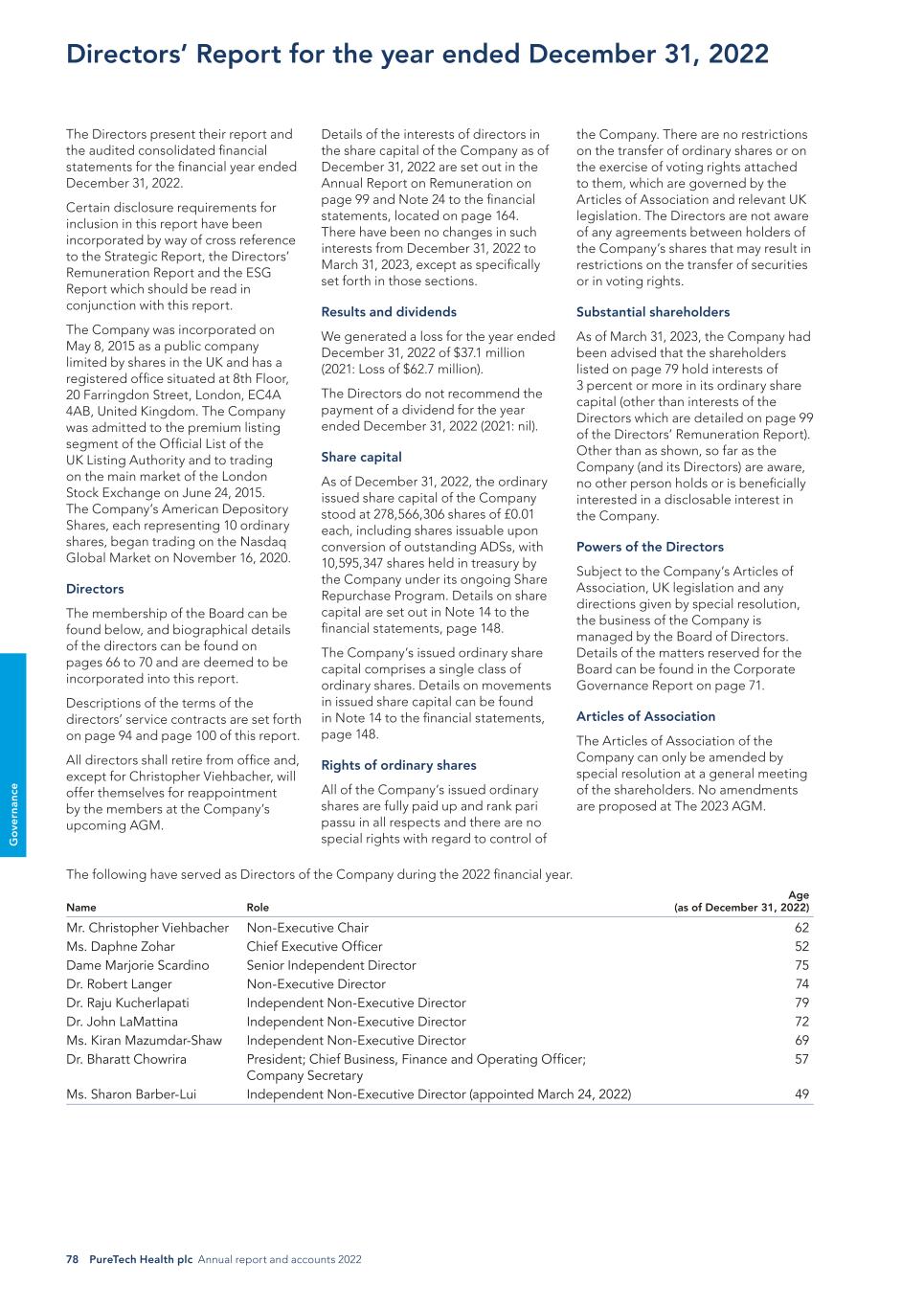 78 PureTech Health plc Annual report and accounts 2022 G o ve rn an ce the Company. There are no restrictions on the transfer of ordinary shares or on the exercise of voting rights attached to them, which are governed by the Articles of Association and relevant UK legislation. The Directors are not aware of any agreements between holders of the Company’s shares that may result in restrictions on the transfer of securities or in voting rights. Substantial shareholders As of March 31, 2023, the Company had been advised that the shareholders listed on page 79 hold interests of 3 percent or more in its ordinary share capital (other than interests of the Directors which are detailed on page 99 of the Directors’ Remuneration Report). Other than as shown, so far as the Company (and its Directors) are aware, no other person holds or is beneficially interested in a disclosable interest in the Company. Powers of the Directors Subject to the Company’s Articles of Association, UK legislation and any directions given by special resolution, the business of the Company is managed by the Board of Directors. Details of the matters reserved for the Board can be found in the Corporate Governance Report on page 71. Articles of Association The Articles of Association of the Company can only be amended by special resolution at a general meeting of the shareholders. No amendments are proposed at The 2023 AGM. Details of the interests of directors in the share capital of the Company as of December 31, 2022 are set out in the Annual Report on Remuneration on page 99 and Note 24 to the financial statements, located on page 164. There have been no changes in such interests from December 31, 2022 to March 31, 2023, except as specifically set forth in those sections. Results and dividends We generated a loss for the year ended December 31, 2022 of $37.1 million (2021: Loss of $62.7 million). The Directors do not recommend the payment of a dividend for the year ended December 31, 2022 (2021: nil). Share capital As of December 31, 2022, the ordinary issued share capital of the Company stood at 278,566,306 shares of £0.01 each, including shares issuable upon conversion of outstanding ADSs, with 10,595,347 shares held in treasury by the Company under its ongoing Share Repurchase Program. Details on share capital are set out in Note 14 to the financial statements, page 148. The Company’s issued ordinary share capital comprises a single class of ordinary shares. Details on movements in issued share capital can be found in Note 14 to the financial statements, page 148. Rights of ordinary shares All of the Company’s issued ordinary shares are fully paid up and rank pari passu in all respects and there are no special rights with regard to control of The Directors present their report and the audited consolidated financial statements for the financial year ended December 31, 2022. Certain disclosure requirements for inclusion in this report have been incorporated by way of cross reference to the Strategic Report, the Directors’ Remuneration Report and the ESG Report which should be read in conjunction with this report. The Company was incorporated on May 8, 2015 as a public company limited by shares in the UK and has a registered office situated at 8th Floor, 20 Farringdon Street, London, EC4A 4AB, United Kingdom. The Company was admitted to the premium listing segment of the Official List of the UK Listing Authority and to trading on the main market of the London Stock Exchange on June 24, 2015. The Company’s American Depository Shares, each representing 10 ordinary shares, began trading on the Nasdaq Global Market on November 16, 2020. Directors The membership of the Board can be found below, and biographical details of the directors can be found on pages 66 to 70 and are deemed to be incorporated into this report. Descriptions of the terms of the directors’ service contracts are set forth on page 94 and page 100 of this report. All directors shall retire from office and, except for Christopher Viehbacher, will offer themselves for reappointment by the members at the Company’s upcoming AGM. Directors’ Report for the year ended December 31, 2022 The following have served as Directors of the Company during the 2022 financial year. Name Role Age (as of December 31, 2022) Mr. Christopher Viehbacher Non-Executive Chair 62 Ms. Daphne Zohar Chief Executive Officer 52 Dame Marjorie Scardino Senior Independent Director 75 Dr. Robert Langer Non-Executive Director 74 Dr. Raju Kucherlapati Independent Non-Executive Director 79 Dr. John LaMattina Independent Non-Executive Director 72 Ms. Kiran Mazumdar-Shaw Independent Non-Executive Director 69 Dr. Bharatt Chowrira President; Chief Business, Finance and Operating Officer; Company Secretary 57 Ms. Sharon Barber-Lui Independent Non-Executive Director (appointed March 24, 2022) 49