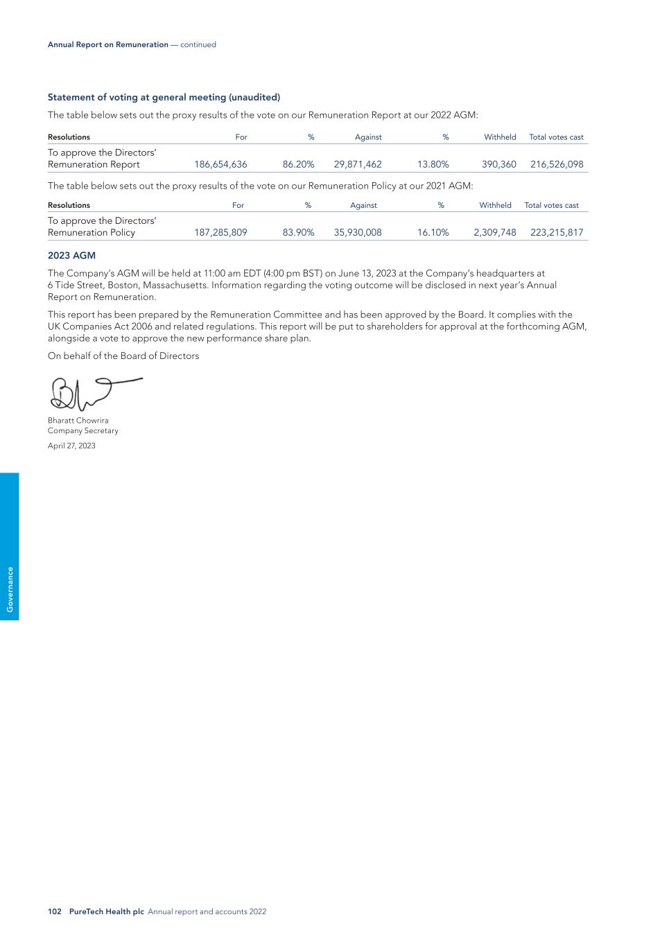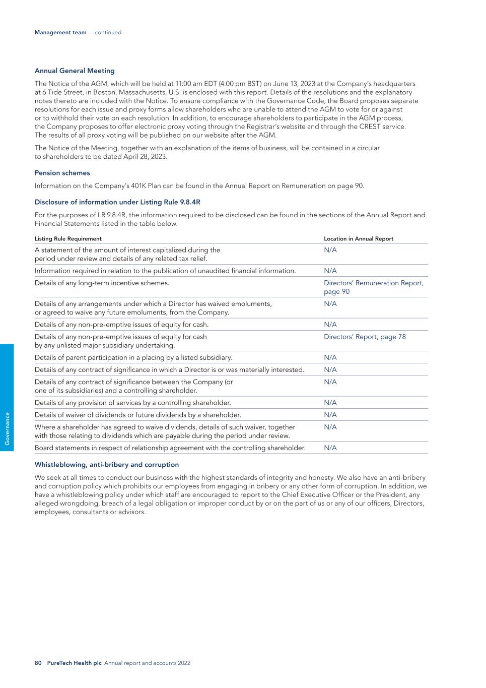 80 PureTech Health plc Annual report and accounts 2022 G o ve rn an ce Annual General Meeting The Notice of the AGM, which will be held at 11:00 am EDT (4:00 pm BST) on June 13, 2023 at the Company’s headquarters at 6 Tide Street, in Boston, Massachusetts, U.S. is enclosed with this report. Details of the resolutions and the explanatory notes thereto are included with the Notice. To ensure compliance with the Governance Code, the Board proposes separate resolutions for each issue and proxy forms allow shareholders who are unable to attend the AGM to vote for or against or to withhold their vote on each resolution. In addition, to encourage shareholders to participate in the AGM process, the Company proposes to offer electronic proxy voting through the Registrar’s website and through the CREST service. The results of all proxy voting will be published on our website after the AGM. The Notice of the Meeting, together with an explanation of the items of business, will be contained in a circular to shareholders to be dated April 28, 2023. Pension schemes Information on the Company’s 401K Plan can be found in the Annual Report on Remuneration on page 90. Disclosure of information under Listing Rule 9.8.4R For the purposes of LR 9.8.4R, the information required to be disclosed can be found in the sections of the Annual Report and Financial Statements listed in the table below. Listing Rule Requirement Location in Annual Report A statement of the amount of interest capitalized during the period under review and details of any related tax relief. N/A Information required in relation to the publication of unaudited financial information. N/A Details of any long-term incentive schemes. Directors’ Remuneration Report, page 90 Details of any arrangements under which a Director has waived emoluments, or agreed to waive any future emoluments, from the Company. N/A Details of any non-pre-emptive issues of equity for cash. N/A Details of any non-pre-emptive issues of equity for cash by any unlisted major subsidiary undertaking. Directors’ Report, page 78 Details of parent participation in a placing by a listed subsidiary. N/A Details of any contract of significance in which a Director is or was materially interested. N/A Details of any contract of significance between the Company (or one of its subsidiaries) and a controlling shareholder. N/A Details of any provision of services by a controlling shareholder. N/A Details of waiver of dividends or future dividends by a shareholder. N/A Where a shareholder has agreed to waive dividends, details of such waiver, together with those relating to dividends which are payable during the period under review. N/A Board statements in respect of relationship agreement with the controlling shareholder. N/A Whistleblowing, anti-bribery and corruption We seek at all times to conduct our business with the highest standards of integrity and honesty. We also have an anti-bribery and corruption policy which prohibits our employees from engaging in bribery or any other form of corruption. In addition, we have a whistleblowing policy under which staff are encouraged to report to the Chief Executive Officer or the President, any alleged wrongdoing, breach of a legal obligation or improper conduct by or on the part of us or any of our officers, Directors, employees, consultants or advisors. Management team — continued