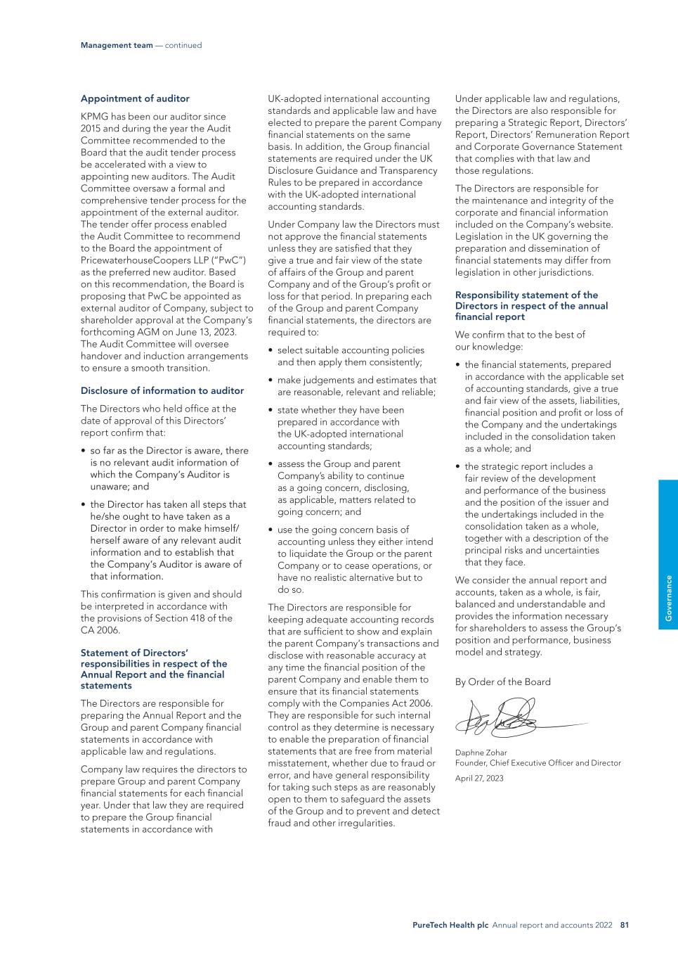 PureTech Health plc Annual report and accounts 2022 81 G o ve rn an ce Under applicable law and regulations, the Directors are also responsible for preparing a Strategic Report, Directors’ Report, Directors’ Remuneration Report and Corporate Governance Statement that complies with that law and those regulations. The Directors are responsible for the maintenance and integrity of the corporate and financial information included on the Company’s website. Legislation in the UK governing the preparation and dissemination of financial statements may differ from legislation in other jurisdictions. Responsibility statement of the Directors in respect of the annual financial report We confirm that to the best of our knowledge: • the financial statements, prepared in accordance with the applicable set of accounting standards, give a true and fair view of the assets, liabilities, financial position and profit or loss of the Company and the undertakings included in the consolidation taken as a whole; and • the strategic report includes a fair review of the development and performance of the business and the position of the issuer and the undertakings included in the consolidation taken as a whole, together with a description of the principal risks and uncertainties that they face. We consider the annual report and accounts, taken as a whole, is fair, balanced and understandable and provides the information necessary for shareholders to assess the Group’s position and performance, business model and strategy. By Order of the Board Daphne Zohar Founder, Chief Executive Officer and Director April 27, 2023 UK-adopted international accounting standards and applicable law and have elected to prepare the parent Company financial statements on the same basis. In addition, the Group financial statements are required under the UK Disclosure Guidance and Transparency Rules to be prepared in accordance with the UK-adopted international accounting standards. Under Company law the Directors must not approve the financial statements unless they are satisfied that they give a true and fair view of the state of affairs of the Group and parent Company and of the Group’s profit or loss for that period. In preparing each of the Group and parent Company financial statements, the directors are required to: • select suitable accounting policies and then apply them consistently; • make judgements and estimates that are reasonable, relevant and reliable; • state whether they have been prepared in accordance with the UK-adopted international accounting standards; • assess the Group and parent Company’s ability to continue as a going concern, disclosing, as applicable, matters related to going concern; and • use the going concern basis of accounting unless they either intend to liquidate the Group or the parent Company or to cease operations, or have no realistic alternative but to do so. The Directors are responsible for keeping adequate accounting records that are sufficient to show and explain the parent Company’s transactions and disclose with reasonable accuracy at any time the financial position of the parent Company and enable them to ensure that its financial statements comply with the Companies Act 2006. They are responsible for such internal control as they determine is necessary to enable the preparation of financial statements that are free from material misstatement, whether due to fraud or error, and have general responsibility for taking such steps as are reasonably open to them to safeguard the assets of the Group and to prevent and detect fraud and other irregularities. Appointment of auditor KPMG has been our auditor since 2015 and during the year the Audit Committee recommended to the Board that the audit tender process be accelerated with a view to appointing new auditors. The Audit Committee oversaw a formal and comprehensive tender process for the appointment of the external auditor. The tender offer process enabled the Audit Committee to recommend to the Board the appointment of PricewaterhouseCoopers LLP (“PwC”) as the preferred new auditor. Based on this recommendation, the Board is proposing that PwC be appointed as external auditor of Company, subject to shareholder approval at the Company’s forthcoming AGM on June 13, 2023. The Audit Committee will oversee handover and induction arrangements to ensure a smooth transition. Disclosure of information to auditor The Directors who held office at the date of approval of this Directors’ report confirm that: • so far as the Director is aware, there is no relevant audit information of which the Company’s Auditor is unaware; and • the Director has taken all steps that he/she ought to have taken as a Director in order to make himself/ herself aware of any relevant audit information and to establish that the Company’s Auditor is aware of that information. This confirmation is given and should be interpreted in accordance with the provisions of Section 418 of the CA 2006. Statement of Directors’ responsibilities in respect of the Annual Report and the financial statements The Directors are responsible for preparing the Annual Report and the Group and parent Company financial statements in accordance with applicable law and regulations. Company law requires the directors to prepare Group and parent Company financial statements for each financial year. Under that law they are required to prepare the Group financial statements in accordance with Management team — continued