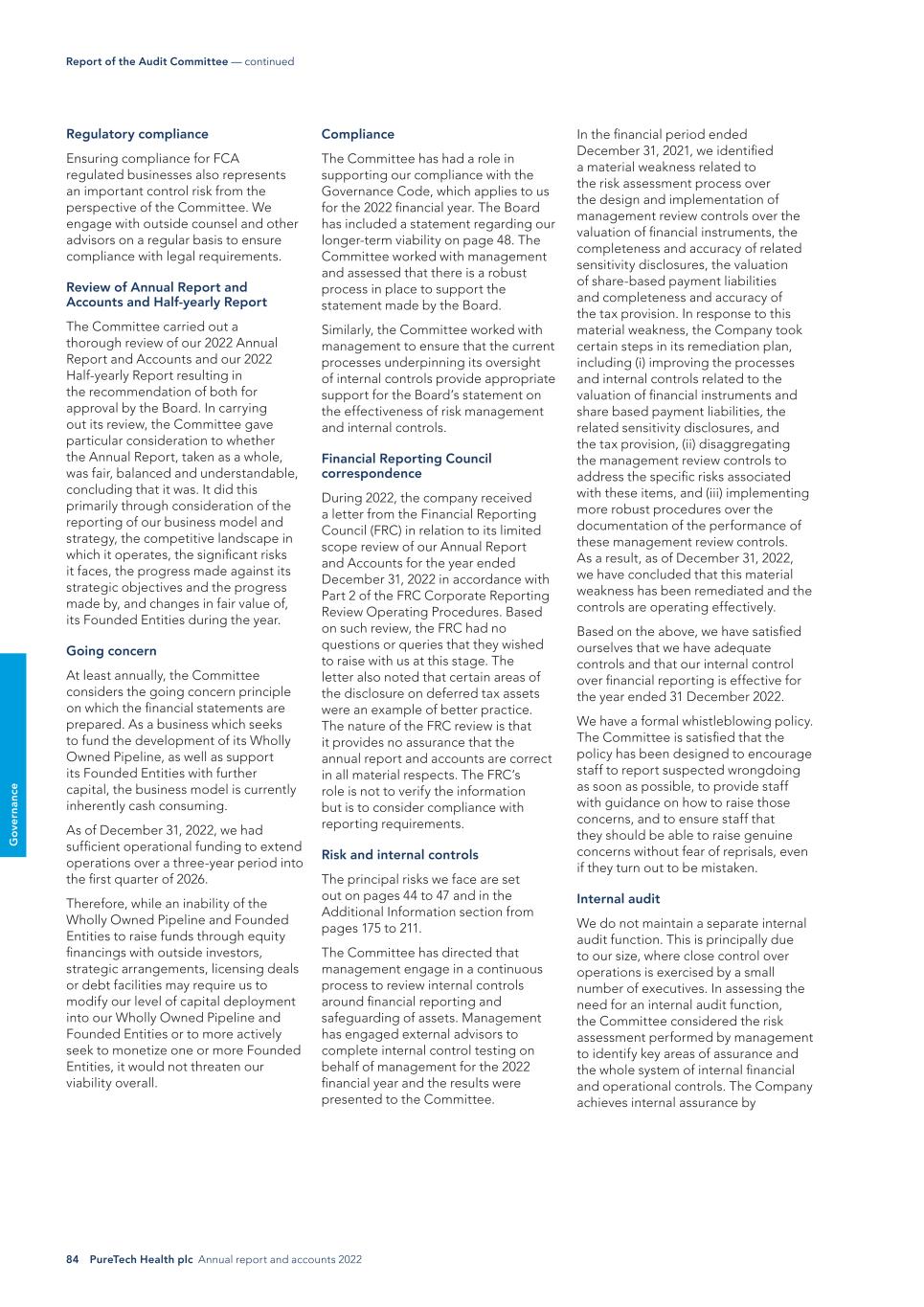 84 PureTech Health plc Annual report and accounts 2022 G o ve rn an ce In the financial period ended December 31, 2021, we identified a material weakness related to the risk assessment process over the design and implementation of management review controls over the valuation of financial instruments, the completeness and accuracy of related sensitivity disclosures, the valuation of share-based payment liabilities and completeness and accuracy of the tax provision. In response to this material weakness, the Company took certain steps in its remediation plan, including (i) improving the processes and internal controls related to the valuation of financial instruments and share based payment liabilities, the related sensitivity disclosures, and the tax provision, (ii) disaggregating the management review controls to address the specific risks associated with these items, and (iii) implementing more robust procedures over the documentation of the performance of these management review controls. As a result, as of December 31, 2022, we have concluded that this material weakness has been remediated and the controls are operating effectively. Based on the above, we have satisfied ourselves that we have adequate controls and that our internal control over financial reporting is effective for the year ended 31 December 2022. We have a formal whistleblowing policy. The Committee is satisfied that the policy has been designed to encourage staff to report suspected wrongdoing as soon as possible, to provide staff with guidance on how to raise those concerns, and to ensure staff that they should be able to raise genuine concerns without fear of reprisals, even if they turn out to be mistaken. Internal audit We do not maintain a separate internal audit function. This is principally due to our size, where close control over operations is exercised by a small number of executives. In assessing the need for an internal audit function, the Committee considered the risk assessment performed by management to identify key areas of assurance and the whole system of internal financial and operational controls. The Company achieves internal assurance by Compliance The Committee has had a role in supporting our compliance with the Governance Code, which applies to us for the 2022 financial year. The Board has included a statement regarding our longer-term viability on page 48. The Committee worked with management and assessed that there is a robust process in place to support the statement made by the Board. Similarly, the Committee worked with management to ensure that the current processes underpinning its oversight of internal controls provide appropriate support for the Board’s statement on the effectiveness of risk management and internal controls. Financial Reporting Council correspondence During 2022, the company received a letter from the Financial Reporting Council (FRC) in relation to its limited scope review of our Annual Report and Accounts for the year ended December 31, 2022 in accordance with Part 2 of the FRC Corporate Reporting Review Operating Procedures. Based on such review, the FRC had no questions or queries that they wished to raise with us at this stage. The letter also noted that certain areas of the disclosure on deferred tax assets were an example of better practice. The nature of the FRC review is that it provides no assurance that the annual report and accounts are correct in all material respects. The FRC’s role is not to verify the information but is to consider compliance with reporting requirements. Risk and internal controls The principal risks we face are set out on pages 44 to 47 and in the Additional Information section from pages 175 to 211. The Committee has directed that management engage in a continuous process to review internal controls around financial reporting and safeguarding of assets. Management has engaged external advisors to complete internal control testing on behalf of management for the 2022 financial year and the results were presented to the Committee. Regulatory compliance Ensuring compliance for FCA regulated businesses also represents an important control risk from the perspective of the Committee. We engage with outside counsel and other advisors on a regular basis to ensure compliance with legal requirements. Review of Annual Report and Accounts and Half-yearly Report The Committee carried out a thorough review of our 2022 Annual Report and Accounts and our 2022 Half-yearly Report resulting in the recommendation of both for approval by the Board. In carrying out its review, the Committee gave particular consideration to whether the Annual Report, taken as a whole, was fair, balanced and understandable, concluding that it was. It did this primarily through consideration of the reporting of our business model and strategy, the competitive landscape in which it operates, the significant risks it faces, the progress made against its strategic objectives and the progress made by, and changes in fair value of, its Founded Entities during the year. Going concern At least annually, the Committee considers the going concern principle on which the financial statements are prepared. As a business which seeks to fund the development of its Wholly Owned Pipeline, as well as support its Founded Entities with further capital, the business model is currently inherently cash consuming. As of December 31, 2022, we had sufficient operational funding to extend operations over a three-year period into the first quarter of 2026. Therefore, while an inability of the Wholly Owned Pipeline and Founded Entities to raise funds through equity financings with outside investors, strategic arrangements, licensing deals or debt facilities may require us to modify our level of capital deployment into our Wholly Owned Pipeline and Founded Entities or to more actively seek to monetize one or more Founded Entities, it would not threaten our viability overall. Report of the Audit Co