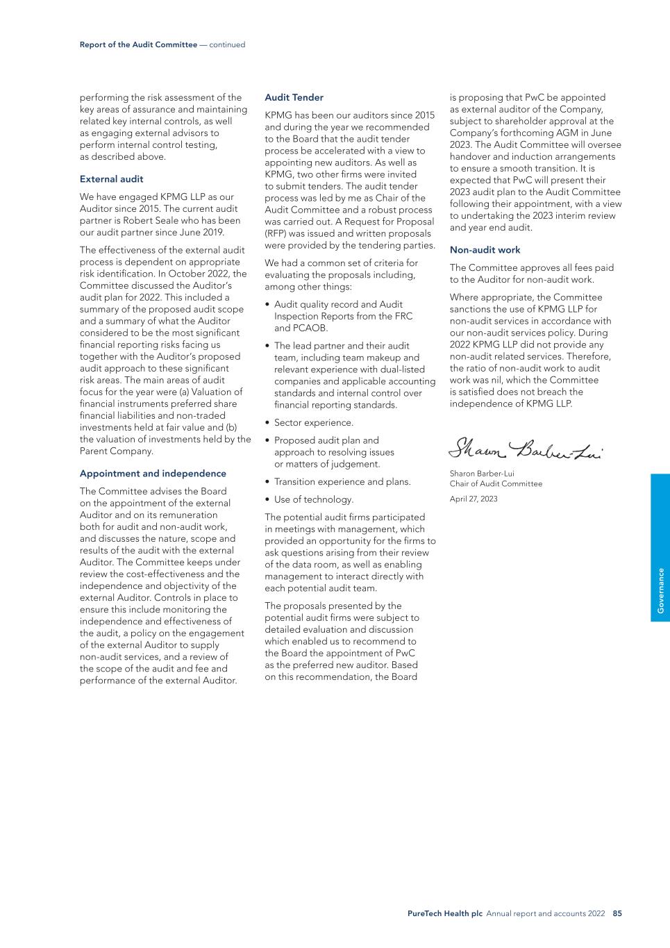 PureTech Health plc Annual report and accounts 2022 85 G o ve rn an ce performing the risk assessment of the key areas of assurance and maintaining related key internal controls, as well as engaging external advisors to perform internal control testing, as described above. External audit We have engaged KPMG LLP as our Auditor since 2015. The current audit partner is Robert Seale who has been our audit partner since June 2019. The effectiveness of the external audit process is dependent on appropriate risk identification. In October 2022, the Committee discussed the Auditor’s audit plan for 2022. This included a summary of the proposed audit scope and a summary of what the Auditor considered to be the most significant financial reporting risks facing us together with the Auditor’s proposed audit approach to these significant risk areas. The main areas of audit focus for the year were (a) Valuation of financial instruments preferred share financial liabilities and non-traded investments held at fair value and (b) the valuation of investments held by the Parent Company. Appointment and independence The Committee advises the Board on the appointment of the external Auditor and on its remuneration both for audit and non-audit work, and discusses the nature, scope and results of the audit with the external Auditor. The Committee keeps under review the cost-effectiveness and the independence and objectivity of the external Auditor. Controls in place to ensure this include monitoring the independence and effectiveness of the audit, a policy on the engagement of the external Auditor to supply non-audit services, and a review of the scope of the audit and fee and performance of the external Auditor. Report of the Audit Committee — continued Audit Tender KPMG has been our auditors since 2015 and during the year we recommended to the Board that the audit tender process be accelerated with a view to appointing new auditors. As well as KPMG, two other firms were invited to submit tenders. The audit tender process was led by me as Chair of the Audit Committee and a robust process was carried out. A Request for Proposal (RFP) was issued and written proposals were provided by the tendering parties. We had a common set of criteria for evaluating the proposals including, among other things: • Audit quality record and Audit Inspection Reports from the FRC and PCAOB. • The lead partner and their audit team, including team makeup and relevant experience with dual-listed companies and applicable accounting standards and internal control over financial reporting standards. • Sector experience. • Proposed audit plan and approach to resolving issues or matters of judgement. • Transition experience and plans. • Use of technology. The potential audit firms participated in meetings with management, which provided an opportunity for the firms to ask questions arising from their review of the data room, as well as enabling management to interact directly with each potential audit team. The proposals presented by the potential audit firms were subject to detailed evaluation and discussion which enabled us to recommend to the Board the appointment of PwC as the preferred new auditor. Based on this recommendation, the Board is proposing that PwC be appointed as external auditor of the Company, subject to shareholder approval at the Company’s forthcoming AGM in June 2023. The Audit Committee will oversee handover and induction arrangements to ensure a smooth transition. It is expected that PwC will present their 2023 audit plan to the Audit Committee following their appointment, with a view to undertaking the 2023 interim review and year end audit. Non-audit work The Committee approves all fees paid to the Auditor for non-audit work. Where appropriate, the Committee sanctions the use of KPMG LLP for non-audit services in accordance with our non-audit services policy. During 2022 KPMG LLP did not provide any non-audit related services. Therefore, the ratio of non-audit work to audit work was nil, which the Committee is satisfied does not breach the independence of KPMG LLP. Sharon Barber-Lui Chair of Audit Committee April 27, 2023
