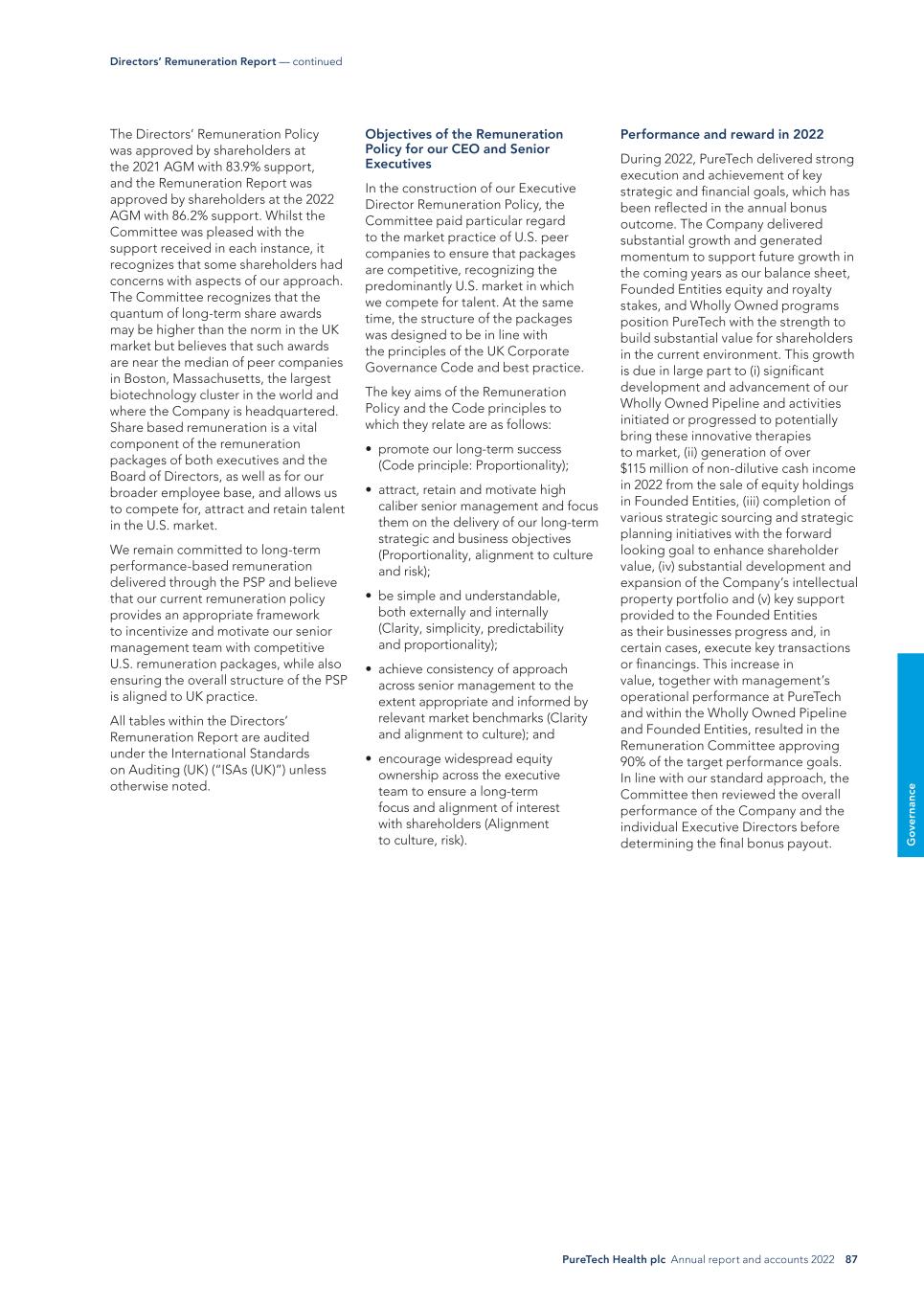 PureTech Health plc Annual report and accounts 2022 87 G o ve rn an ce Performance and reward in 2022 During 2022, PureTech delivered strong execution and achievement of key strategic and financial goals, which has been reflected in the annual bonus outcome. The Company delivered substantial growth and generated momentum to support future growth in the coming years as our balance sheet, Founded Entities equity and royalty stakes, and Wholly Owned programs position PureTech with the strength to build substantial value for shareholders in the current environment. This growth is due in large part to (i) significant development and advancement of our Wholly Owned Pipeline and activities initiated or progressed to potentially bring these innovative therapies to market, (ii) generation of over $115 million of non-dilutive cash income in 2022 from the sale of equity holdings in Founded Entities, (iii) completion of various strategic sourcing and strategic planning initiatives with the forward looking goal to enhance shareholder value, (iv) substantial development and expansion of the Company’s intellectual property portfolio and (v) key support provided to the Founded Entities as their businesses progress and, in certain cases, execute key transactions or financings. This increase in value, together with management’s operational performance at PureTech and within the Wholly Owned Pipeline and Founded Entities, resulted in the Remuneration Committee approving 90% of the target performance goals. In line with our standard approach, the Committee then reviewed the overall performance of the Company and the individual Executive Directors before determining the final bonus payout. Objectives of the Remuneration Policy for our CEO and Senior Executives In the construction of our Executive Director Remuneration Policy, the Committee paid particular regard to the market practice of U.S. peer companies to ensure that packages are competitive, recognizing the predominantly U.S. market in which we compete for talent. At the same time, the structure of the packages was designed to be in line with the principles of the UK Corporate Governance Code and best practice. The key aims of the Remuneration Policy and the Code principles to which they relate are as follows: • promote our long-term success (Code principle: Proportionality); • attract, retain and motivate high caliber senior management and focus them on the delivery of our long-term strategic and business objectives (Proportionality, alignment to culture and risk); • be simple and understandable, both externally and internally (Clarity, simplicity, predictability and proportionality); • achieve consistency of approach across senior management to the extent appropriate and informed by relevant market benchmarks (Clarity and alignment to culture); and • encourage widespread equity ownership across the executive team to ensure a long-term focus and alignment of interest with shareholders (Alignment to culture, risk). The Directors’ Remuneration Policy was approved by shareholders at the 2021 AGM with 83.9% support, and the Remuneration Report was approved by shareholders at the 2022 AGM with 86.2% support. Whilst the Committee was pleased with the support received in each instance, it recognizes that some shareholders had concerns with aspects of our approach. The Committee recognizes that the quantum of long-term share awards may be higher than the norm in the UK market but believes that such awards are near the median of peer companies in Boston, Massachusetts, the largest biotechnology cluster in the world and where the Company is headquartered. Share based remuneration is a vital component of the remuneration packages of both executives and the Board of Directors, as well as for our broader employee base, and allows us to compete for, attract and retain talent in the U.S. market. We remain committed to long-term performance-based remuneration delivered through the PSP and believe that our current remuneration policy provides an appropriate framework to incentivize and motivate our senior management team with competitive U.S. remuneration packages, while also ensuring the overall structure of the PSP is aligned to UK practice. All tables within the Directors’ Remuneration Report are audited under the International Standards on Auditing (UK) (“ISAs (UK)”) unless otherwise noted. Directors’ Remuneration Report — continued