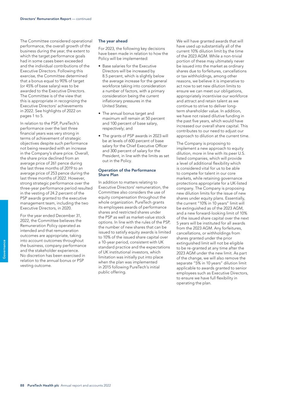 88 PureTech Health plc Annual report and accounts 2022 G o ve rn an ce We will have granted awards that will have used up substantially all of the current 10% dilution limit by the time of the 2023 AGM. While a non-trivial portion of these may ultimately never be issued into the market as ordinary shares due to forfeitures, cancellations or tax withholdings, among other reasons, we believe it is imperative to act now to set new dilution limits to ensure we can meet our obligations, appropriately incentivise our workforce and attract and retain talent as we continue to strive to deliver long- term shareholder value. In addition, we have not raised dilutive funding in the past five years, which would have increased our overall share capital. This contributes to our need to adjust our approach to dilution at the current time. The Company is proposing to implement a new approach to equity dilution, more in line with its peer U.S. listed companies, which will provide a level of additional flexibility which is considered vital for us to be able to compete for talent in our core markets, while retaining governance protections appropriate for a UK-listed company. The Company is proposing new dilution limits for the issue of new shares under equity plans. Essentially, the current “10% in 10 years” limit will be extinguished as of the 2023 AGM, and a new forward-looking limit of 10% of the issued share capital over the next 5 years will be instituted for all awards from the 2023 AGM. Any forfeitures, cancellations, or withholdings from shares granted under the prior extinguished limit will not be eligible to be re-granted at any time after the 2023 AGM under the new limit. As part of the change, we will also remove the separate “5% in 10 years” dilution limit applicable to awards granted to senior employees such as Executive Directors, to ensure we have full flexibility in operating the plan. The year ahead For 2023, the following key decisions have been made in relation to how the Policy will be implemented: • Base salaries for the Executive Directors will be increased by 8.5 percent, which is slightly below the average increase for the general workforce taking into consideration a number of factors, with a primary consideration being the current inflationary pressures in the United States; • The annual bonus target and maximum will remain at 50 percent and 100 percent of base salary, respectively; and • The grants of PSP awards in 2023 will be at levels of 600 percent of base salary for the Chief Executive Officer and 300 percent of salary for the President, in line with the limits as set out in the Policy. Operation of the Performance Share Plan In addition to matters relating to Executive Directors’ remuneration, the Committee also considers the use of equity compensation throughout the whole organization. PureTech grants its employees awards of performance shares and restricted shares under the PSP as well as market-value stock options. In line with the rules of the PSP, the number of new shares that can be issued to satisfy equity awards is limited to 10% of the issued share capital over a 10-year period, consistent with UK standard practice and the expectations of UK institutional investors, which limitation was initially put into place when the plan was implemented in 2015 following PureTech’s initial public offering. The Committee considered operational performance, the overall growth of the business during the year, the extent to which the target performance goals had in some cases been exceeded and the individual contributions of the Executive Directors. Following this exercise, the Committee determined that a bonus equal to 90% of target (or 45% of base salary) was to be awarded to the Executive Directors. The Committee is of the view that this is appropriate in recognizing the Executive Directors’ achievements in 2022. See highlights of 2022 on pages 1 to 5. In relation to the PSP, PureTech’s performance over the last three financial years was very strong in terms of achievement of strategic objectives despite such performance not being rewarded with an increase in the Company’s share price. Overall, the share price declined from an average price of 261 pence during the last three months of 2019 to an average price of 253 pence during the last three months of 2022. However, strong strategic performance over the three-year performance period resulted in the vesting of 24.2 percent of the PSP awards granted to the executive management team, including the two Executive Directors, in 2020. For the year ended December 31, 2022, the Committee believes the Remuneration Policy operated as intended and that remuneration outcomes are appropriate, taking into account outcomes throughout the business, company performance and the stakeholder experience. No discretion has been exercised in relation to the annual bonus or PSP vesting outcome. Directors’ Remuneration Report — continued