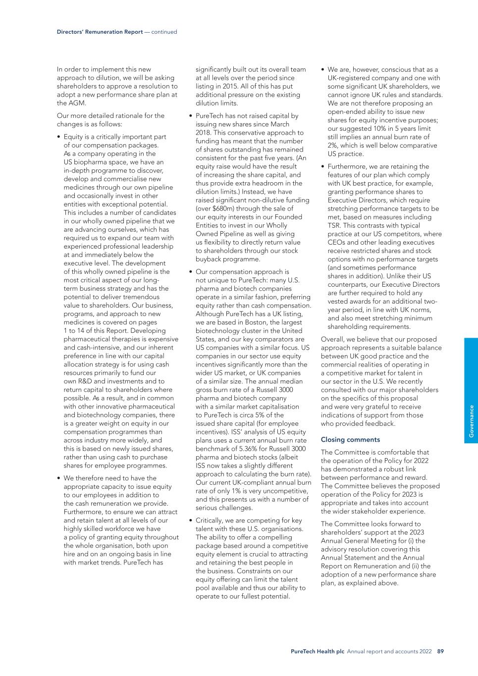PureTech Health plc Annual report and accounts 2022 89 G o ve rn an ce • We are, however, conscious that as a UK-registered company and one with some significant UK shareholders, we cannot ignore UK rules and standards. We are not therefore proposing an open-ended ability to issue new shares for equity incentive purposes; our suggested 10% in 5 years limit still implies an annual burn rate of 2%, which is well below comparative US practice. • Furthermore, we are retaining the features of our plan which comply with UK best practice, for example, granting performance shares to Executive Directors, which require stretching performance targets to be met, based on measures including TSR. This contrasts with typical practice at our US competitors, where CEOs and other leading executives receive restricted shares and stock options with no performance targets (and sometimes performance shares in addition). Unlike their US counterparts, our Executive Directors are further required to hold any vested awards for an additional two- year period, in line with UK norms, and also meet stretching minimum shareholding requirements. Overall, we believe that our proposed approach represents a suitable balance between UK good practice and the commercial realities of operating in a competitive market for talent in our sector in the U.S. We recently consulted with our major shareholders on the specifics of this proposal and were very grateful to receive indications of support from those who provided feedback. Closing comments The Committee is comfortable that the operation of the Policy for 2022 has demonstrated a robust link between performance and reward. The Committee believes the proposed operation of the Policy for 2023 is appropriate and takes into account the wider stakeholder experience. The Committee looks forward to shareholders’ support at the 2023 Annual General Meeting for (i) the advisory resolution covering this Annual Statement and the Annual Report on Remuneration and (ii) the adoption of a new performance share plan, as explained above. significantly built out its overall team at all levels over the period since listing in 2015. All of this has put additional pressure on the existing dilution limits. • PureTech has not raised capital by issuing new shares since March 2018. This conservative approach to funding has meant that the number of shares outstanding has remained consistent for the past five years. (An equity raise would have the result of increasing the share capital, and thus provide extra headroom in the dilution limits.) Instead, we have raised significant non-dilutive funding (over $680m) through the sale of our equity interests in our Founded Entities to invest in our Wholly Owned Pipeline as well as giving us flexibility to directly return value to shareholders through our stock buyback programme. • Our compensation approach is not unique to PureTech: many U.S. pharma and biotech companies operate in a similar fashion, preferring equity rather than cash compensation. Although PureTech has a UK listing, we are based in Boston, the largest biotechnology cluster in the United States, and our key comparators are US companies with a similar focus. US companies in our sector use equity incentives significantly more than the wider US market, or UK companies of a similar size. The annual median gross burn rate of a Russell 3000 pharma and biotech company with a similar market capitalisation to PureTech is circa 5% of the issued share capital (for employee incentives). ISS’ analysis of US equity plans uses a current annual burn rate benchmark of 5.36% for Russell 3000 pharma and biotech stocks (albeit ISS now takes a slightly different approach to calculating the burn rate). Our current UK-compliant annual burn rate of only 1% is very uncompetitive, and this presents us with a number of serious challenges. • Critically, we are competing for key talent with these U.S. organisations. The ability to offer a compelling package based around a competitive equity element is crucial to attracting and retaining the best people in the business. Constraints on our equity offering can limit the talent pool available and thus our ability to operate to our fullest potential. In order to implement this new approach to dilution, we will be asking shareholders to approve a resolution to adopt a new performance share plan at the AGM. Our more detailed rationale for the changes is as follows: • Equity is a critically important part of our compensation packages. As a company operating in the US biopharma space, we have an in-depth programme to discover, develop and commercialise new medicines through our own pipeline and occasionally invest in other entities with exceptional potential. This includes a number of candidates in our wholly owned pipeline that we are advancing ourselves, which has required us to expand our team with experienced professional leadership at and immediately below the executive level. The development of this wholly owned pipeline is the most critical aspect of our long- term business strategy and has the potential to deliver tremendous value to shareholders. Our business, programs, and approach to new medicines is covered on pages 1 to 14 of this Report. Developing pharmaceutical therapies is expensive and cash-intensive, and our inherent preference in line with our capital allocation strategy is for using cash resources primarily to fund our own R&D and investments and to return capital to shareholders where possible. As a result, and in common with other innovative pharmaceutical and biotechnology companies, there is a greater weight on equity in our compensation programmes than across industry more widely, and this is based on newly issued shares, rather than using cash to purchase shares for employee programmes. • We therefore need to have the appropriate capacity to issue equity to our employees in addition to the cash remuneration we provide. Furthermore, to e