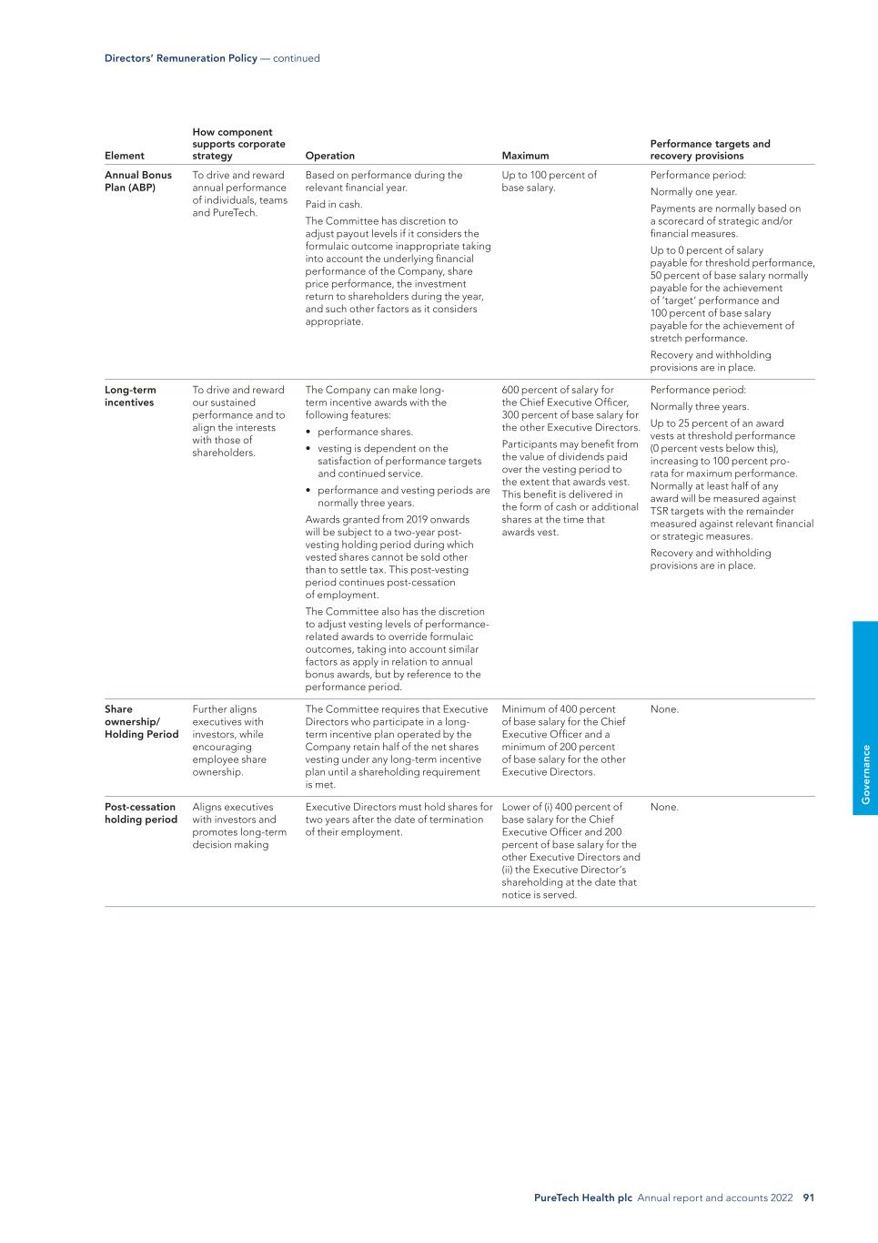 PureTech Health plc Annual report and accounts 2022 91 G o ve rn an ce Element How component supports corporate strategy Operation Maximum Performance targets and recovery provisions Annual Bonus Plan (ABP) To drive and reward annual performance of individuals, teams and PureTech. Based on performance during the relevant financial year. Paid in cash. The Committee has discretion to adjust payout levels if it considers the formulaic outcome inappropriate taking into account the underlying financial performance of the Company, share price performance, the investment return to shareholders during the year, and such other factors as it considers appropriate. Up to 100 percent of base salary. Performance period: Normally one year. Payments are normally based on a scorecard of strategic and/or financial measures. Up to 0 percent of salary payable for threshold performance, 50 percent of base salary normally payable for the achievement of ’target’ performance and 100 percent of base salary payable for the achievement of stretch performance. Recovery and withholding provisions are in place. Long-term incentives To drive and reward our sustained performance and to align the interests with those of shareholders. The Company can make long- term incentive awards with the following features: • performance shares. • vesting is dependent on the satisfaction of performance targets and continued service. • performance and vesting periods are normally three years. Awards granted from 2019 onwards will be subject to a two-year post- vesting holding period during which vested shares cannot be sold other than to settle tax. This post-vesting period continues post-cessation of employment. The Committee also has the discretion to adjust vesting levels of performance- related awards to override formulaic outcomes, taking into account similar factors as apply in relation to annual bonus awards, but by reference to the performance period. 600 percent of salary for the Chief Executive Officer, 300 percent of base salary for the other Executive Directors. Participants may benefit from the value of dividends paid over the vesting period to the extent that awards vest. This benefit is delivered in the form of cash or additional shares at the time that awards vest. Performance period: Normally three years. Up to 25 percent of an award vests at threshold performance (0 percent vests below this), increasing to 100 percent pro- rata for maximum performance. Normally at least half of any award will be measured against TSR targets with the remainder measured against relevant financial or strategic measures. Recovery and withholding provisions are in place. Share ownership/ Holding Period Further aligns executives with investors, while encouraging employee share ownership. The Committee requires that Executive Directors who participate in a long- term incentive plan operated by the Company retain half of the net shares vesting under any long-term incentive plan until a shareholding requirement is met. Minimum of 400 percent of base salary for the Chief Executive Officer and a minimum of 200 percent of base salary for the other Executive Directors. None. Post-cessation holding period Aligns executives with investors and promotes long-term decision making Executive Directors must hold shares for two years after the date of termination of their employment. Lower of (i) 400 percent of base salary for the Chief Executive Officer and 200 percent of base salary for the other Executive Directors and (ii) the Executive Director’s shareholding at the date that notice is served. None. Directors’ Remuneration Policy — continued