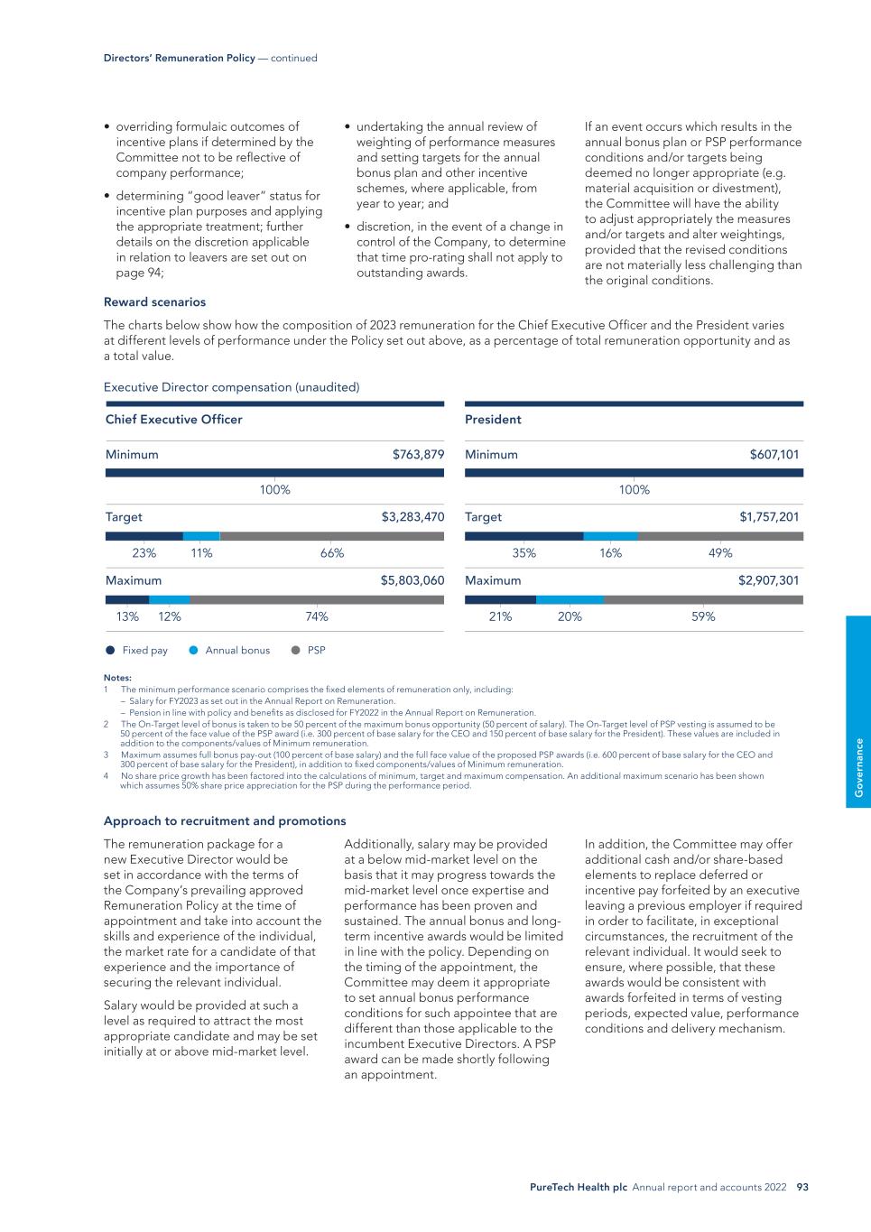 PureTech Health plc Annual report and accounts 2022 93 G o ve rn an ce If an event occurs which results in the annual bonus plan or PSP performance conditions and/or targets being deemed no longer appropriate (e.g. material acquisition or divestment), the Committee will have the ability to adjust appropriately the measures and/or targets and alter weightings, provided that the revised conditions are not materially less challenging than the original conditions. • undertaking the annual review of weighting of performance measures and setting targets for the annual bonus plan and other incentive schemes, where applicable, from year to year; and • discretion, in the event of a change in control of the Company, to determine that time pro-rating shall not apply to outstanding awards. • overriding formulaic outcomes of incentive plans if determined by the Committee not to be reflective of company performance; • determining “good leaver” status for incentive plan purposes and applying the appropriate treatment; further details on the discretion applicable in relation to leavers are set out on page 94; Directors’ Remuneration Policy — continued Reward scenarios The charts below show how the composition of 2023 remuneration for the Chief Executive Officer and the President varies at different levels of performance under the Policy set out above, as a percentage of total remuneration opportunity and as a total value. Executive Director compensation (unaudited) Notes: 1 The minimum performance scenario comprises the fixed elements of remuneration only, including: – Salary for FY2023 as set out in the Annual Report on Remuneration. – Pension in line with policy and benefits as disclosed for FY2022 in the Annual Report on Remuneration. 2 The On-Target level of bonus is taken to be 50 percent of the maximum bonus opportunity (50 percent of salary). The On-Target level of PSP vesting is assumed to be 50 percent of the face value of the PSP award (i.e. 300 percent of base salary for the CEO and 150 percent of base salary for the President). These values are included in addition to the components/values of Minimum remuneration. 3 Maximum assumes full bonus pay-out (100 percent of base salary) and the full face value of the proposed PSP awards (i.e. 600 percent of base salary for the CEO and 300 percent of base salary for the President), in addition to fixed components/values of Minimum remuneration. 4 No share price growth has been factored into the calculations of minimum, target and maximum compensation. An additional maximum scenario has been shown which assumes 50% share price appreciation for the PSP during the performance period. Approach to recruitment and promotions In addition, the Committee may offer additional cash and/or share-based elements to replace deferred or incentive pay forfeited by an executive leaving a previous employer if required in order to facilitate, in exceptional circumstances, the recruitment of the relevant individual. It would seek to ensure, where possible, that these awards would be consistent with awards forfeited in terms of vesting periods, expected value, performance conditions and delivery mechanism. Additionally, salary may be provided at a below mid-market level on the basis that it may progress towards the mid-market level once expertise and performance has been proven and sustained. The annual bonus and long- term incentive awards would be limited in line with the policy. Depending on the timing of the appointment, the Committee may deem it appropriate to set annual bonus performance conditions for such appointee that are different than those applicable to the incumbent Executive Directors. A PSP award can be made shortly following an appointment. The remuneration package for a new Executive Director would be set in accordance with the terms of the Company’s prevailing approved Remuneration Policy at the time of appointment and take into account the skills and experience of the individual, the market rate for a candidate of that experience and the importance of securing the relevant individual. Salary would be provided at such a level as required to attract the most appropriate candidate and may be set initially at or above mid-market level. 23% 100% 100% 11% 66% 35% 49%16% 13% 12% 21% 59%20%74% Minimum Chief Executive Officer $763,879 Target $3,283,470 Maximum $5,803,060 Minimum President $607,101 Target $1,757,201 Maximum $2,907,301 Fixed pay Annual bonus PSP