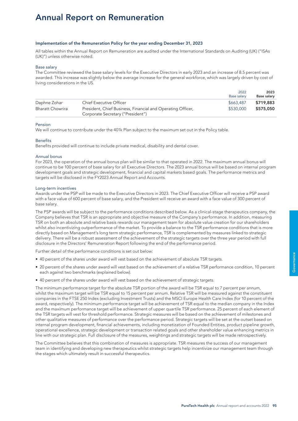 PureTech Health plc Annual report and accounts 2022 95 G o ve rn an ce Annual Report on Remuneration Implementation of the Remuneration Policy for the year ending December 31, 2023 All tables within the Annual Report on Remuneration are audited under the International Standards on Auditing (UK) (“ISAs (UK)”) unless otherwise noted. Base salary The Committee reviewed the base salary levels for the Executive Directors in early 2023 and an increase of 8.5 percent was awarded. This increase was slightly below the average increase for the general workforce, which was largely driven by cost of living considerations in the US. 2022 Base salary 2023 Base salary Daphne Zohar Chief Executive Officer $663,487 $719,883 Bharatt Chowrira President, Chief Business, Financial and Operating Officer, Corporate Secretary (“President”) $530,000 $575,050 Pension We will continue to contribute under the 401k Plan subject to the maximum set out in the Policy table. Benefits Benefits provided will continue to include private medical, disability and dental cover. Annual bonus For 2023, the operation of the annual bonus plan will be similar to that operated in 2022. The maximum annual bonus will continue to be 100 percent of base salary for all Executive Directors. The 2023 annual bonus will be based on internal program development goals and strategic development, financial and capital markets based goals. The performance metrics and targets will be disclosed in the FY2023 Annual Report and Accounts. Long-term incentives Awards under the PSP will be made to the Executive Directors in 2023. The Chief Executive Officer will receive a PSP award with a face value of 600 percent of base salary, and the President will receive an award with a face value of 300 percent of base salary. The PSP awards will be subject to the performance conditions described below. As a clinical-stage therapeutics company, the Company believes that TSR is an appropriate and objective measure of the Company’s performance. In addition, measuring TSR on both an absolute and relative basis rewards our management team for absolute value creation for our shareholders whilst also incentivizing outperformance of the market. To provide a balance to the TSR performance conditions that is more directly based on Management’s long term strategic performance, TSR is complemented by measures linked to strategic delivery. There will be a robust assessment of the achievement of the strategic targets over the three year period with full disclosure in the Directors’ Remuneration Report following the end of the performance period. Further detail of the performance conditions is set out below: • 40 percent of the shares under award will vest based on the achievement of absolute TSR targets. • 20 percent of the shares under award will vest based on the achievement of a relative TSR performance condition, 10 percent each against two benchmarks (explained below). • 40 percent of the shares under award will vest based on the achievement of strategic targets. The minimum performance target for the absolute TSR portion of the award will be TSR equal to 7 percent per annum, whilst the maximum target will be TSR equal to 15 percent per annum. Relative TSR will be measured against the constituent companies in the FTSE 250 Index (excluding Investment Trusts) and the MSCI Europe Health Care Index (for 10 percent of the award, respectively). The minimum performance target will be achievement of TSR equal to the median company in the Index and the maximum performance target will be achievement of upper quartile TSR performance. 25 percent of each element of the TSR targets will vest for threshold performance. Strategic measures will be based on the achievement of milestones and other qualitative measures of performance over the performance period. Strategic targets will be set at the outset based on internal program development, financial achievements, including monetization of Founded Entities, product pipeline growth, operational excellence, strategic development or transaction related goals and other shareholder value enhancing metrics in line with our strategic plan. Full disclosure of the measures, weightings and strategic targets will be made retrospectively. The Committee believes that this combination of measures is appropriate. TSR measures the success of our management team in identifying and developing new therapeutics whilst strategic targets help incentivize our management team through the stages which ultimately result in successful therapeutics.
