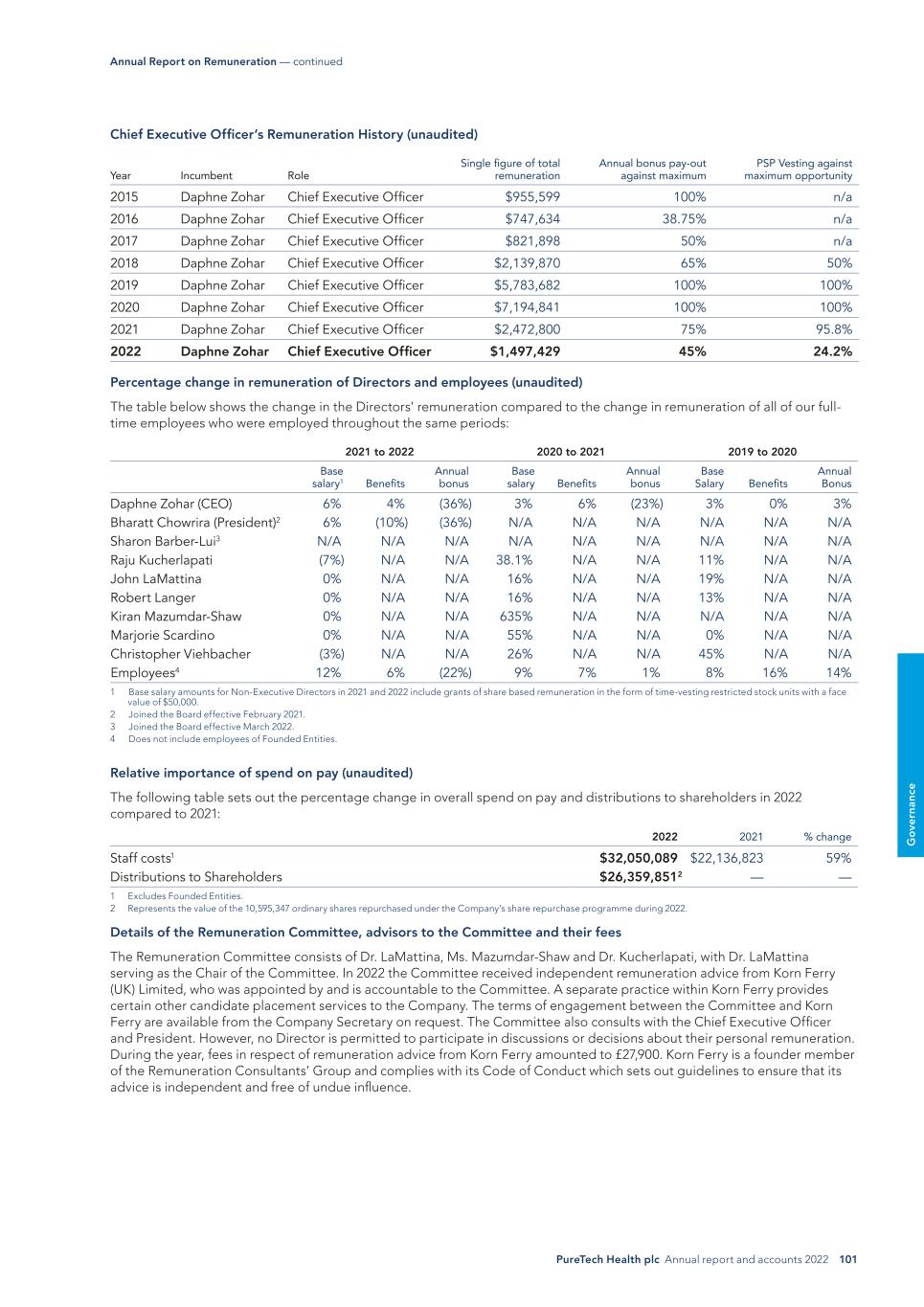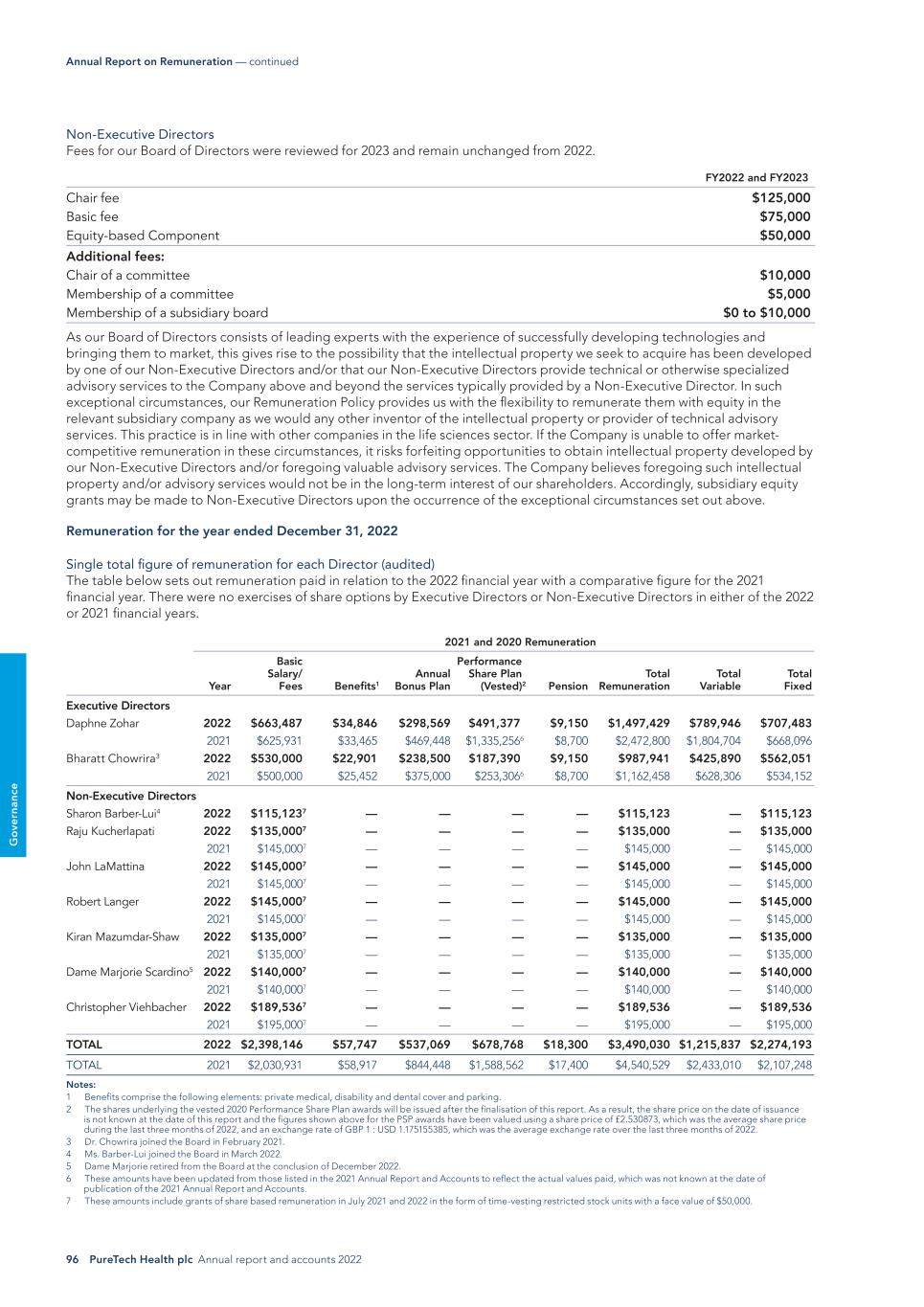 96 PureTech Health plc Annual report and accounts 2022 G o ve rn an ce Non-Executive Directors Fees for our Board of Directors were reviewed for 2023 and remain unchanged from 2022. FY2022 and FY2023 Chair fee $125,000 Basic fee $75,000 Equity-based Component $50,000 Additional fees: Chair of a committee $10,000 Membership of a committee $5,000 Membership of a subsidiary board $0 to $10,000 As our Board of Directors consists of leading experts with the experience of successfully developing technologies and bringing them to market, this gives rise to the possibility that the intellectual property we seek to acquire has been developed by one of our Non-Executive Directors and/or that our Non-Executive Directors provide technical or otherwise specialized advisory services to the Company above and beyond the services typically provided by a Non-Executive Director. In such exceptional circumstances, our Remuneration Policy provides us with the flexibility to remunerate them with equity in the relevant subsidiary company as we would any other inventor of the intellectual property or provider of technical advisory services. This practice is in line with other companies in the life sciences sector. If the Company is unable to offer market- competitive remuneration in these circumstances, it risks forfeiting opportunities to obtain intellectual property developed by our Non-Executive Directors and/or foregoing valuable advisory services. The Company believes foregoing such intellectual property and/or advisory services would not be in the long-term interest of our shareholders. Accordingly, subsidiary equity grants may be made to Non-Executive Directors upon the occurrence of the exceptional circumstances set out above. Remuneration for the year ended December 31, 2022 Single total figure of remuneration for each Director (audited) The table below sets out remuneration paid in relation to the 2022 financial year with a comparative figure for the 2021 financial year. There were no exercises of share options by Executive Directors or Non-Executive Directors in either of the 2022 or 2021 financial years. 2021 and 2020 Remuneration Year Basic Salary/ Fees Benefits1 Annual Bonus Plan Performance Share Plan (Vested)2 Pension Total Remuneration Total Variable Total Fixed Executive Directors Daphne Zohar 2022 $663,487 $34,846 $298,569 $491,377 $9,150 $1,497,429 $789,946 $707,483 2021 $625,931 $33,465 $469,448 $1,335,2566 $8,700 $2,472,800 $1,804,704 $668,096 Bharatt Chowrira3 2022 $530,000 $22,901 $238,500 $187,390 $9,150 $987,941 $425,890 $562,051 2021 $500,000 $25,452 $375,000 $253,3066 $8,700 $1,162,458 $628,306 $534,152 Non-Executive Directors Sharon Barber-Lui4 2022 $115,1237 — — — — $115,123 — $115,123 Raju Kucherlapati 2022 $135,0007 — — — — $135,000 — $135,000 2021 $145,0007 — — — — $145,000 — $145,000 John LaMattina 2022 $145,0007 — — — — $145,000 — $145,000 2021 $145,0007 — — — — $145,000 — $145,000 Robert Langer 2022 $145,0007 — — — — $145,000 — $145,000 2021 $145,0007 — — — — $145,000 — $145,000 Kiran Mazumdar-Shaw 2022 $135,0007 — — — — $135,000 — $135,000 2021 $135,0007 — — — — $135,000 — $135,000 Dame Marjorie Scardino5 2022 $140,0007 — — — — $140,000 — $140,000 2021 $140,0007 — — — — $140,000 — $140,000 Christopher Viehbacher 2022 $189,5367 — — — — $189,536 — $189,536 2021 $195,0007 — — — — $195,000 — $195,000 TOTAL 2022 $2,398,146 $57,747 $537,069 $678,768 $18,300 $3,490,030 $1,215,837 $2,274,193 TOTAL 2021 $2,030,931 $58,917 $844,448 $1,588,562 $17,400 $4,540,529 $2,433,010 $2,107,248 Notes: 1 Benefits comprise the following elements: private medical, disability and dental cover and parking. 2 The shares underlying the vested 2020 Performance Share Plan awards will be issued after the finalisation of this report. As a result, the share price on the date of issuance is not known at the date of this report and the figures shown above for the PSP awards have been valued using a share price of £2.530873, which was the average share price during the last three months of 2022, and an exchange rate of GBP 1 : USD 1.175155385, which was the average exchange rate over the last three months of 2022. 3 Dr. Chowrira joined the Board in February 2021. 4 Ms. Barber-Lui joined the Board in March 2022. 5 Dame Marjorie retired from the Board at the conclusion of December 2022. 6 These amounts have been updated from those listed in the 2021 Annual Report and Accounts to reflect the actual values paid, which was not known at the date of publication of the 2021 Annual Report and Accounts. 7 These amounts include grants of share based remuneration in July 2021 and 2022 in the form of time-vesting restricted stock units with a face value of $50,000. Annual Report on Remuneration — continued