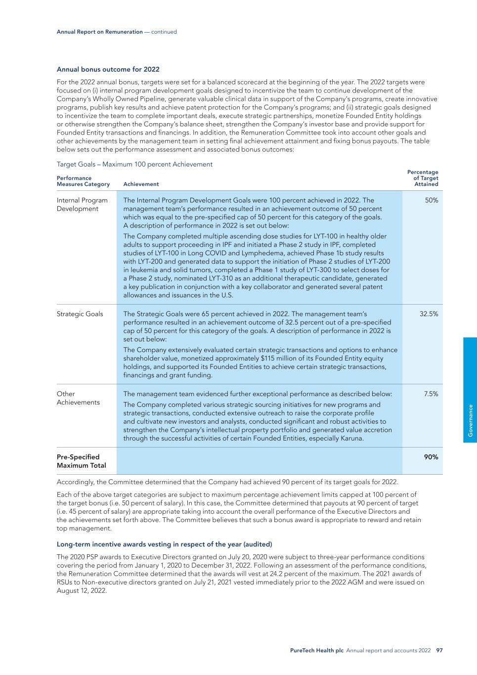 PureTech Health plc Annual report and accounts 2022 97 G o ve rn an ce Annual Report on Remuneration — continued Annual bonus outcome for 2022 For the 2022 annual bonus, targets were set for a balanced scorecard at the beginning of the year. The 2022 targets were focused on (i) internal program development goals designed to incentivize the team to continue development of the Company’s Wholly Owned Pipeline, generate valuable clinical data in support of the Company’s programs, create innovative programs, publish key results and achieve patent protection for the Company’s programs; and (ii) strategic goals designed to incentivize the team to complete important deals, execute strategic partnerships, monetize Founded Entity holdings or otherwise strengthen the Company’s balance sheet, strengthen the Company’s investor base and provide support for Founded Entity transactions and financings. In addition, the Remuneration Committee took into account other goals and other achievements by the management team in setting final achievement attainment and fixing bonus payouts. The table below sets out the performance assessment and associated bonus outcomes: Target Goals – Maximum 100 percent Achievement Performance Measures Category Achievement Percentage of Target Attained Internal Program Development The Internal Program Development Goals were 100 percent achieved in 2022. The management team’s performance resulted in an achievement outcome of 50 percent which was equal to the pre-specified cap of 50 percent for this category of the goals. A description of performance in 2022 is set out below: The Company completed multiple ascending dose studies for LYT-100 in healthy older adults to support proceeding in IPF and initiated a Phase 2 study in IPF, completed studies of LYT-100 in Long COVID and Lymphedema, achieved Phase 1b study results with LYT-200 and generated data to support the initiation of Phase 2 studies of LYT-200 in leukemia and solid tumors, completed a Phase 1 study of LYT-300 to select doses for a Phase 2 study, nominated LYT-310 as an additional therapeutic candidate, generated a key publication in conjunction with a key collaborator and generated several patent allowances and issuances in the U.S. 50% Strategic Goals The Strategic Goals were 65 percent achieved in 2022. The management team’s performance resulted in an achievement outcome of 32.5 percent out of a pre-specified cap of 50 percent for this category of the goals. A description of performance in 2022 is set out below: The Company extensively evaluated certain strategic transactions and options to enhance shareholder value, monetized approximately $115 million of its Founded Entity equity holdings, and supported its Founded Entities to achieve certain strategic transactions, financings and grant funding. 32.5% Other Achievements The management team evidenced further exceptional performance as described below: The Company completed various strategic sourcing initiatives for new programs and strategic transactions, conducted extensive outreach to raise the corporate profile and cultivate new investors and analysts, conducted significant and robust activities to strengthen the Company’s intellectual property portfolio and generated value accretion through the successful activities of certain Founded Entities, especially Karuna. 7.5% Pre-Specified Maximum Total 90% Accordingly, the Committee determined that the Company had achieved 90 percent of its target goals for 2022. Each of the above target categories are subject to maximum percentage achievement limits capped at 100 percent of the target bonus (i.e. 50 percent of salary). In this case, the Committee determined that payouts at 90 percent of target (i.e. 45 percent of salary) are appropriate taking into account the overall performance of the Executive Directors and the achievements set forth above. The Committee believes that such a bonus award is appropriate to reward and retain top management. Long-term incentive awards vesting in respect of the year (audited) The 2020 PSP awards to Executive Directors granted on July 20, 2020 were subject to three-year performance conditions covering the period from January 1, 2020 to December 31, 2022. Following an assessment of the performance conditions, the Remuneration Committee determined that the awards will vest at 24.2 percent of the maximum. The 2021 awards of RSUs to Non-executive directors granted on July 21, 2021 vested immediately prior to the 2022 AGM and were issued on August 12, 2022.