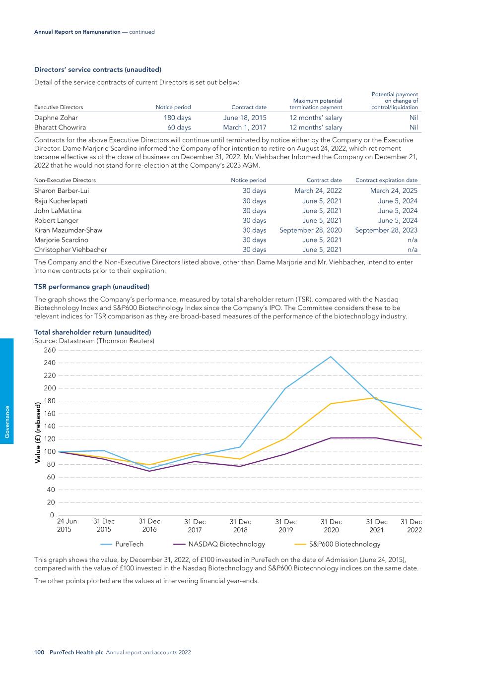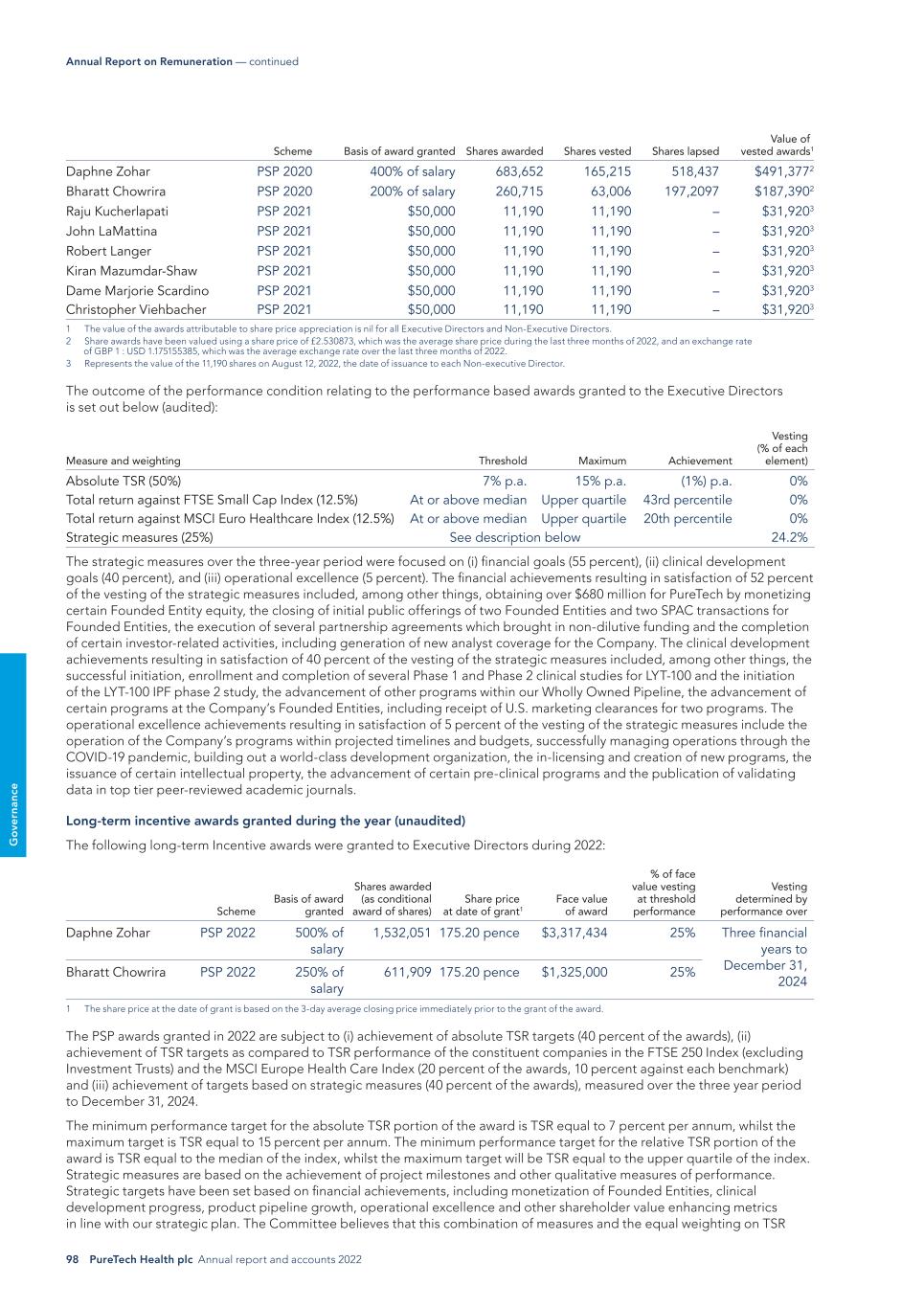 98 PureTech Health plc Annual report and accounts 2022 G o ve rn an ce Annual Report on Remuneration — continued Scheme Basis of award granted Shares awarded Shares vested Shares lapsed Value of vested awards1 Daphne Zohar PSP 2020 400% of salary 683,652 165,215 518,437 $491,3772 Bharatt Chowrira PSP 2020 200% of salary 260,715 63,006 197,2097 $187,3902 Raju Kucherlapati PSP 2021 $50,000 11,190 11,190 – $31,9203 John LaMattina PSP 2021 $50,000 11,190 11,190 – $31,9203 Robert Langer PSP 2021 $50,000 11,190 11,190 – $31,9203 Kiran Mazumdar-Shaw PSP 2021 $50,000 11,190 11,190 – $31,9203 Dame Marjorie Scardino PSP 2021 $50,000 11,190 11,190 – $31,9203 Christopher Viehbacher PSP 2021 $50,000 11,190 11,190 – $31,9203 1 The value of the awards attributable to share price appreciation is nil for all Executive Directors and Non-Executive Directors. 2 Share awards have been valued using a share price of £2.530873, which was the average share price during the last three months of 2022, and an exchange rate of GBP 1 : USD 1.175155385, which was the average exchange rate over the last three months of 2022. 3 Represents the value of the 11,190 shares on August 12, 2022, the date of issuance to each Non-executive Director. The outcome of the performance condition relating to the performance based awards granted to the Executive Directors is set out below (audited): Measure and weighting Threshold Maximum Achievement Vesting (% of each element) Absolute TSR (50%) 7% p.a. 15% p.a. (1%) p.a. 0% Total return against FTSE Small Cap Index (12.5%) At or above median Upper quartile 43rd percentile 0% Total return against MSCI Euro Healthcare Index (12.5%) At or above median Upper quartile 20th percentile 0% Strategic measures (25%) See description below 24.2% The strategic measures over the three-year period were focused on (i) financial goals (55 percent), (ii) clinical development goals (40 percent), and (iii) operational excellence (5 percent). The financial achievements resulting in satisfaction of 52 percent of the vesting of the strategic measures included, among other things, obtaining over $680 million for PureTech by monetizing certain Founded Entity equity, the closing of initial public offerings of two Founded Entities and two SPAC transactions for Founded Entities, the execution of several partnership agreements which brought in non-dilutive funding and the completion of certain investor-related activities, including generation of new analyst coverage for the Company. The clinical development achievements resulting in satisfaction of 40 percent of the vesting of the strategic measures included, among other things, the successful initiation, enrollment and completion of several Phase 1 and Phase 2 clinical studies for LYT-100 and the initiation of the LYT-100 IPF phase 2 study, the advancement of other programs within our Wholly Owned Pipeline, the advancement of certain programs at the Company’s Founded Entities, including receipt of U.S. marketing clearances for two programs. The operational excellence achievements resulting in satisfaction of 5 percent of the vesting of the strategic measures include the operation of the Company’s programs within projected timelines and budgets, successfully managing operations through the COVID-19 pandemic, building out a world-class development organization, the in-licensing and creation of new programs, the issuance of certain intellectual property, the advancement of certain pre-clinical programs and the publication of validating data in top tier peer-reviewed academic journals. Long-term incentive awards granted during the year (unaudited) The following long-term Incentive awards were granted to Executive Directors during 2022: Scheme Basis of award granted Shares awarded (as conditional award of shares) Share price at date of grant1 Face value of award % of face value vesting at threshold performance Vesting determined by performance over Daphne Zohar PSP 2022 500% of salary 1,532,051 175.20 pence $3,317,434 25% Three financial years to December 31, 2024 Bharatt Chowrira PSP 2022 250% of salary 611,909 175.20 pence $1,325,000 25% 1 The share price at the date of grant is based on the 3-day average closing price immediately prior to the grant of the award. The PSP awards granted in 2022 are subject to (i) achievement of absolute TSR targets (40 percent of the awards), (ii) achievement of TSR targets as compared to TSR performance of the constituent companies in the FTSE 250 Index (excluding Investment Trusts) and the MSCI Europe Health Care Index (20 percent of the awards, 10 percent against each benchmark) and (iii) achievement of targets based on strategic measures (40 percent of the awards), measured over the three year period to December 31, 2024. The minimum performance target for the absolute TSR portion of the award is TSR equal to 7 percent per annum, whilst the maximum target is TSR equal to 15 percent per annum. The minimum performance target for the relative TSR portion of the award is TSR equal to the median of the index, whilst the maximum target will be TSR equal to the upper quartile of the index. Strategic measures are based on the achievement of project milestones and other qualitative measures of performance. Strategic targets have been set based on financial achievements, including monetization of Founded Entities, clinical development progress, product pipeline growth, operational excellence and other shareholder value enhancing metrics in line with our strategic plan. The Committee believes that this combination of measures and the equal weighting on TSR