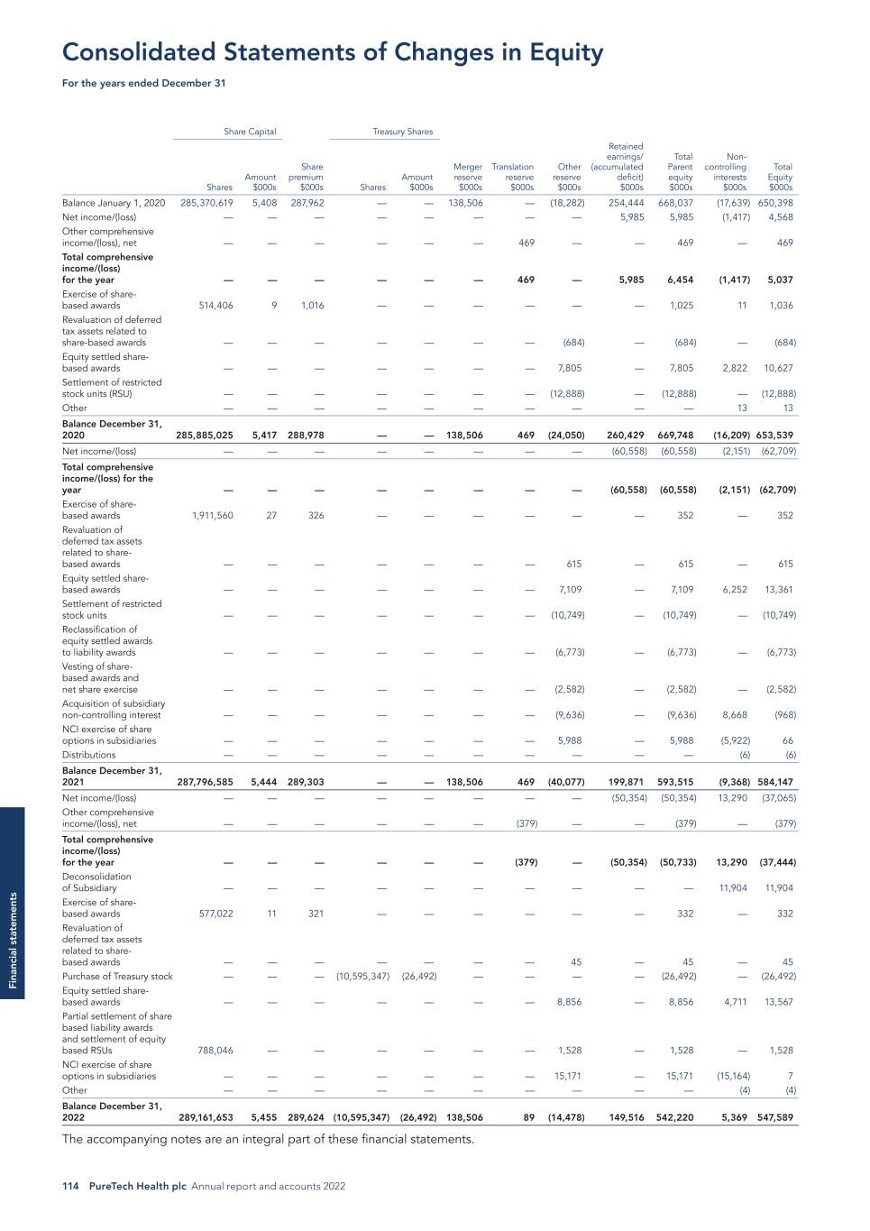 PureTech Health plc Annual report and accounts 2022 171 Fi na nc ia l s ta te m en ts Share Capital Treasury Shares Shares Amount $000s Share Premium $000s Shares Amount $000s Merger Reserve $000s Other Reserve $000s Retained earnings/ (Accumulated deficit) $000s Total equity $000s Balance January 1, 2021 285,885,025 5,417 288,978 — — 138,506 20,725 (10,620) 443,005 Total comprehensive loss for the year — — — — — — — — — Exercise of share- based awards 1,911,560 27 326 — — — — — 352 Equity settled share- based payments — — — — — — 7,109 — 7,109 Settlement of restricted stock units — — — — — — (10,749) — (10,749) Vesting of share- based awards and net share exercise — — — — — — (2,582) — (2,582) Reclassification of equity settled awards to liability awards in subsidiary — — — — — — (6,773) — (6,773) Net loss — — — — — — — (3,401) (3,401) Balance December 31, 2021 287,796,585 5,444 289,303 — — 138,506 7,730 (14,022) 426,961 Total comprehensive loss for the year — — — — — — — — — Exercise of share- based awards 577,022 11 321 — — — — — 332 Equity settled share- based payments — — — — — — 8,856 — 8,856 Settlement of restricted stock units 788,046 — — — — — 1,528 — 1,528 Purchase of Treasury stock — — — (10,595,347) (26,492) — — — (26,492) Net income — — — — — — — 59,198 59,198 Balance December 31, 2022 289,161,653 5,455 289,624 (10,595,347) (26,492) 138,506 18,114 45,176 470,382 The accompanying Notes are an integral part of these financial statements. PureTech Health plc Statements of Changes in Equity For the years ended December 31