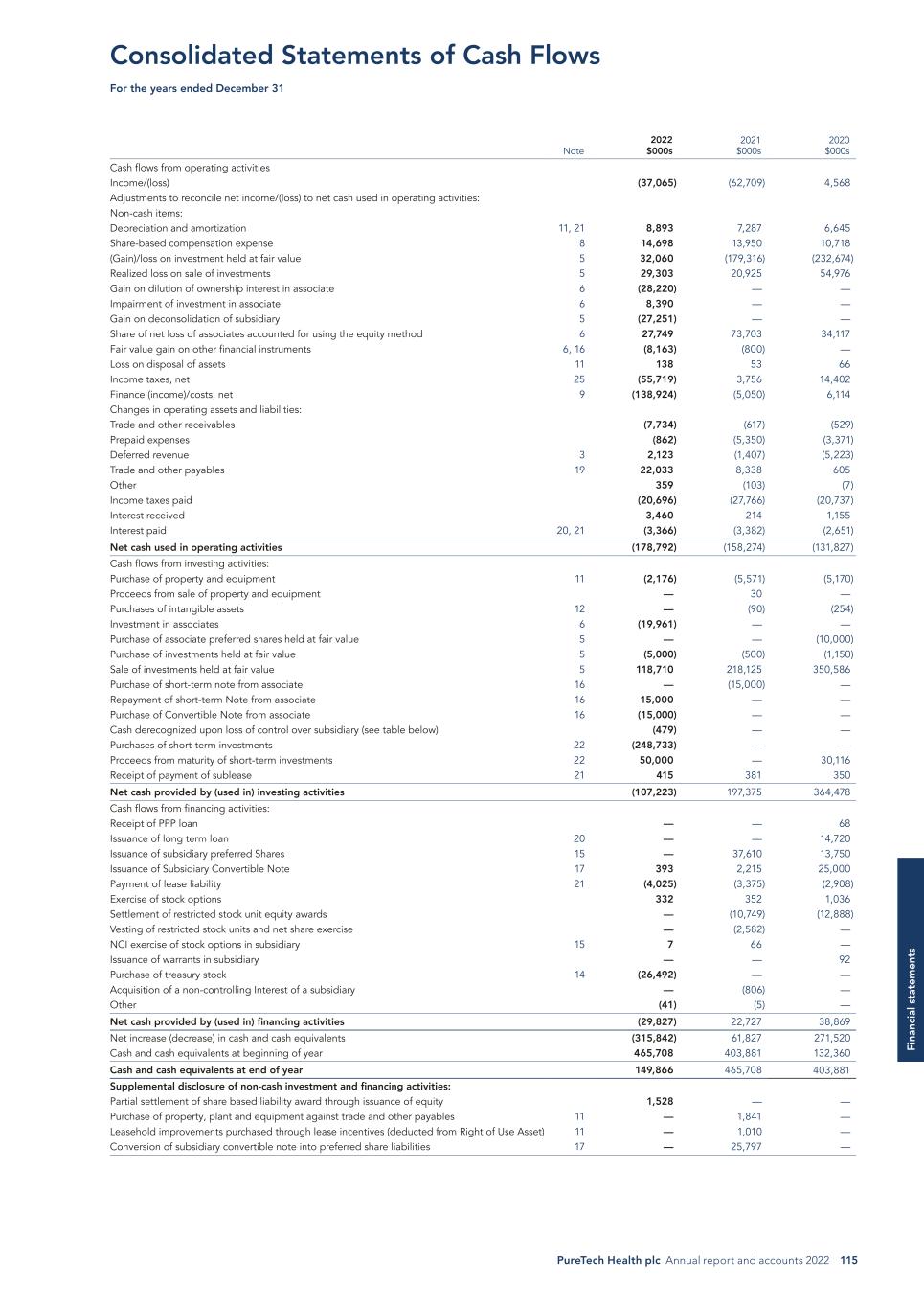 PureTech Health plc Annual report and accounts 2022 115 Fi na nc ia l s ta te m en ts Consolidated Statements of Cash Flows For the years ended December 31 Note 2022 $000s 2021 $000s 2020 $000s Cash flows from operating activities Income/(loss) (37,065) (62,709) 4,568 Adjustments to reconcile net income/(loss) to net cash used in operating activities: Non-cash items: Depreciation and amortization 11, 21 8,893 7,287 6,645 Share-based compensation expense 8 14,698 13,950 10,718 (Gain)/loss on investment held at fair value 5 32,060 (179,316) (232,674) Realized loss on sale of investments 5 29,303 20,925 54,976 Gain on dilution of ownership interest in associate 6 (28,220) — — Impairment of investment in associate 6 8,390 — — Gain on deconsolidation of subsidiary 5 (27,251) — — Share of net loss of associates accounted for using the equity method 6 27,749 73,703 34,117 Fair value gain on other financial instruments 6, 16 (8,163) (800) — Loss on disposal of assets 11 138 53 66 Income taxes, net 25 (55,719) 3,756 14,402 Finance (income)/costs, net 9 (138,924) (5,050) 6,114 Changes in operating assets and liabilities: Trade and other receivables (7,734) (617) (529) Prepaid expenses (862) (5,350) (3,371) Deferred revenue 3 2,123 (1,407) (5,223) Trade and other payables 19 22,033 8,338 605 Other 359 (103) (7) Income taxes paid (20,696) (27,766) (20,737) Interest received 3,460 214 1,155 Interest paid 20, 21 (3,366) (3,382) (2,651) Net cash used in operating activities (178,792) (158,274) (131,827) Cash flows from investing activities: Purchase of property and equipment 11 (2,176) (5,571) (5,170) Proceeds from sale of property and equipment — 30 — Purchases of intangible assets 12 — (90) (254) Investment in associates 6 (19,961) — — Purchase of associate preferred shares held at fair value 5 — — (10,000) Purchase of investments held at fair value 5 (5,000) (500) (1,150) Sale of investments held at fair value 5 118,710 218,125 350,586 Purchase of short-term note from associate 16 — (15,000) — Repayment of short-term Note from associate 16 15,000 — — Purchase of Convertible Note from associate 16 (15,000) — — Cash derecognized upon loss of control over subsidiary (see table below) (479) — — Purchases of short-term investments 22 (248,733) — — Proceeds from maturity of short-term investments 22 50,000 — 30,116 Receipt of payment of sublease 21 415 381 350 Net cash provided by (used in) investing activities (107,223) 197,375 364,478 Cash flows from financing activities: Receipt of PPP loan — — 68 Issuance of long term loan 20 — — 14,720 Issuance of subsidiary preferred Shares 15 — 37,610 13,750 Issuance of Subsidiary Convertible Note 17 393 2,215 25,000 Payment of lease liability 21 (4,025) (3,375) (2,908) Exercise of stock options 332 352 1,036 Settlement of restricted stock unit equity awards — (10,749) (12,888) Vesting of restricted stock units and net share exercise — (2,582) — NCI exercise of stock options in subsidiary 15 7 66 — Issuance of warrants in subsidiary — — 92 Purchase of treasury stock 14 (26,492) — — Acquisition of a non-controlling Interest of a subsidiary — (806) — Other (41) (5) — Net cash provided by (used in) financing activities (29,827) 22,727 38,869 Net increase (decrease) in cash and cash equivalents (315,842) 61,827 271,520 Cash and cash equivalents at beginning of year 465,708 403,881 132,360 Cash and cash equivalents at end of year 149,866 465,708 403,881 Supplemental disclosure of non-cash investment and financing activities: Partial settlement of share based liability award through issuance of equity 1,528 — — Purchase of property, plant and equipment against trade and other payables 11 — 1,841 — Leasehold improvements purchased through lease incentives (deducted from Right of Use Asset) 11 — 1,010 — Conversion of subsidiary convertible note into preferred share liabilities 17 — 25,797 —