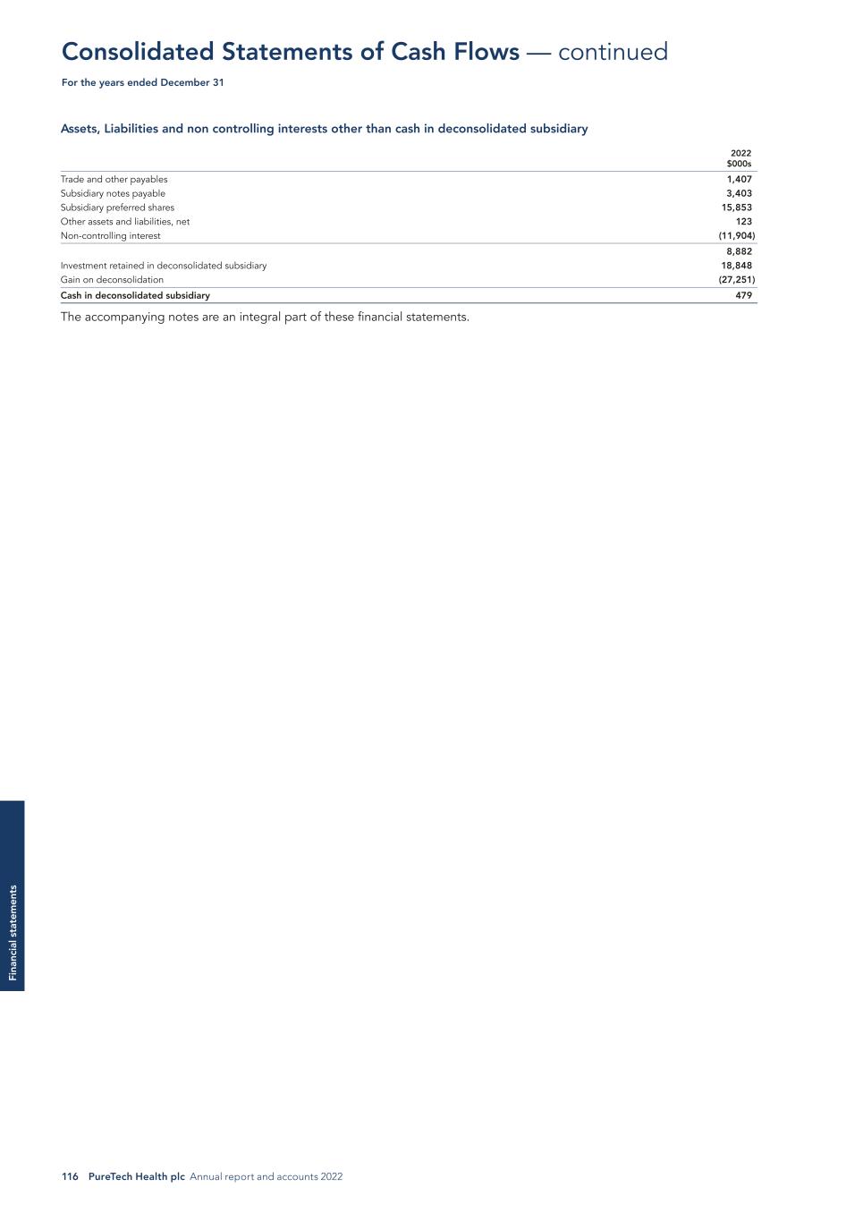 116 PureTech Health plc Annual report and accounts 2022 Fi na nc ia l s ta te m en ts Consolidated Statements of Cash Flows — continued For the years ended December 31 Assets, Liabilities and non controlling interests other than cash in deconsolidated subsidiary 2022 $000s Trade and other payables 1,407 Subsidiary notes payable 3,403 Subsidiary preferred shares 15,853 Other assets and liabilities, net 123 Non-controlling interest (11,904) 8,882 Investment retained in deconsolidated subsidiary 18,848 Gain on deconsolidation (27,251) Cash in deconsolidated subsidiary 479 The accompanying notes are an integral part of these financial statements.