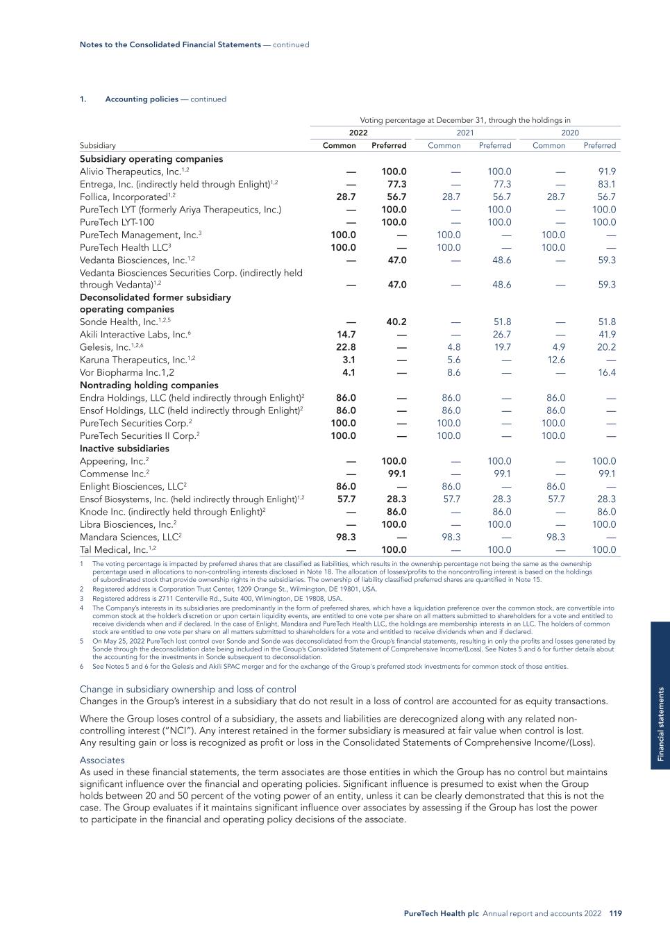 PureTech Health plc Annual report and accounts 2022 119 Fi na nc ia l s ta te m en ts Voting percentage at December 31, through the holdings in 2022 2021 2020 Subsidiary Common Preferred Common Preferred Common Preferred Subsidiary operating companies Alivio Therapeutics, Inc.1,2 — 100.0 — 100.0 — 91.9 Entrega, Inc. (indirectly held through Enlight)1,2 — 77.3 — 77.3 — 83.1 Follica, Incorporated1,2 28.7 56.7 28.7 56.7 28.7 56.7 PureTech LYT (formerly Ariya Therapeutics, Inc.) — 100.0 — 100.0 — 100.0 PureTech LYT-100 — 100.0 — 100.0 — 100.0 PureTech Management, Inc.3 100.0 — 100.0 — 100.0 — PureTech Health LLC3 100.0 — 100.0 — 100.0 — Vedanta Biosciences, Inc.1,2 — 47.0 — 48.6 — 59.3 Vedanta Biosciences Securities Corp. (indirectly held through Vedanta)1,2 — 47.0 — 48.6 — 59.3 Deconsolidated former subsidiary operating companies Sonde Health, Inc.1,2,5 — 40.2 — 51.8 — 51.8 Akili Interactive Labs, Inc.6 14.7 — — 26.7 — 41.9 Gelesis, Inc.1,2,6 22.8 — 4.8 19.7 4.9 20.2 Karuna Therapeutics, Inc.1,2 3.1 — 5.6 — 12.6 — Vor Biopharma Inc.1,2 4.1 — 8.6 — — 16.4 Nontrading holding companies Endra Holdings, LLC (held indirectly through Enlight)2 86.0 — 86.0 — 86.0 — Ensof Holdings, LLC (held indirectly through Enlight)2 86.0 — 86.0 — 86.0 — PureTech Securities Corp.2 100.0 — 100.0 — 100.0 — PureTech Securities II Corp.2 100.0 — 100.0 — 100.0 — Inactive subsidiaries Appeering, Inc.2 — 100.0 — 100.0 — 100.0 Commense Inc.2 — 99.1 — 99.1 — 99.1 Enlight Biosciences, LLC2 86.0 — 86.0 — 86.0 — Ensof Biosystems, Inc. (held indirectly through Enlight)1,2 57.7 28.3 57.7 28.3 57.7 28.3 Knode Inc. (indirectly held through Enlight)2 — 86.0 — 86.0 — 86.0 Libra Biosciences, Inc.2 — 100.0 — 100.0 — 100.0 Mandara Sciences, LLC2 98.3 — 98.3 — 98.3 — Tal Medical, Inc.1,2 — 100.0 — 100.0 — 100.0 1 The voting percentage is impacted by preferred shares that are classified as liabilities, which results in the ownership percentage not being the same as the ownership percentage used in allocations to non-controlling interests disclosed in Note 18. The allocation of losses/profits to the noncontrolling interest is based on the holdings of subordinated stock that provide ownership rights in the subsidiaries. The ownership of liability classified preferred shares are quantified in Note 15. 2 Registered address is Corporation Trust Center, 1209 Orange St., Wilmington, DE 19801, USA. 3 Registered address is 2711 Centerville Rd., Suite 400, Wilmington, DE 19808, USA. 4 The Company’s interests in its subsidiaries are predominantly in the form of preferred shares, which have a liquidation preference over the common stock, are convertible into common stock at the holder’s discretion or upon certain liquidity events, are entitled to one vote per share on all matters submitted to shareholders for a vote and entitled to receive dividends when and if declared. In the case of Enlight, Mandara and PureTech Health LLC, the holdings are membership interests in an LLC. The holders of common stock are entitled to one vote per share on all matters submitted to shareholders for a vote and entitled to receive dividends when and if declared. 5 On May 25, 2022 PureTech lost control over Sonde and Sonde was deconsolidated from the Group’s financial statements, resulting in only the profits and losses generated by Sonde through the deconsolidation date being included in the Group’s Consolidated Statement of Comprehensive Income/(Loss). See Notes 5 and 6 for further details about the accounting for the investments in Sonde subsequent to deconsolidation. 6 See Notes 5 and 6 for the Gelesis and Akili SPAC merger and for the exchange of the Group's preferred stock investments for common stock of those entities. Change in subsidiary ownership and loss of control Changes in the Group’s interest in a subsidiary that do not result in a loss of control are accounted for as equity transactions. Where the Group loses control of a subsidiary, the assets and liabilities are derecognized along with any related non- controlling interest (“NCI”). Any interest retained in the former subsidiary is measured at fair value when control is lost. Any resulting gain or loss is recognized as profit or loss in the Consolidated Statements of Comprehensive Income/(Loss). Associates As used in these financial statements, the term associates are those entities in which the Group has no control but maintains significant influence over the financial and operating policies. Significant influence is presumed to exist when the Group holds between 20 and 50 percent of the voting power of an entity, unless it can be clearly demonstrated that this is not the case. The Group evaluates if it maintains significant influence over associates by assessing if the Group has lost the power to participate in the financial and operating policy decisions of the associate. 1. Accounting policies — continued Notes to the Consolidated Financial Statements — continued