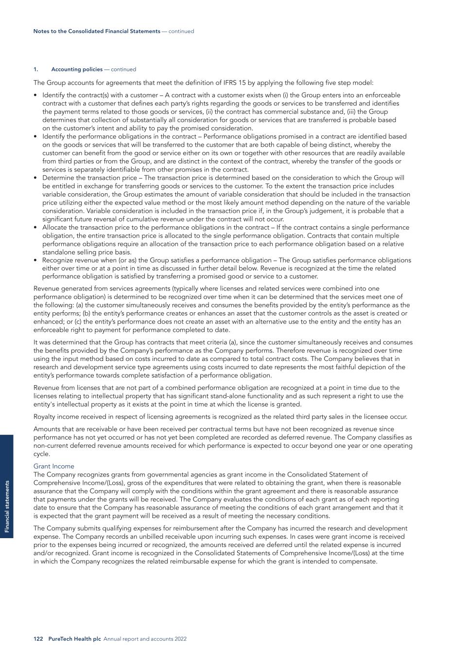 122 PureTech Health plc Annual report and accounts 2022 Fi na nc ia l s ta te m en ts The Group accounts for agreements that meet the definition of IFRS 15 by applying the following five step model: • Identify the contract(s) with a customer – A contract with a customer exists when (i) the Group enters into an enforceable contract with a customer that defines each party’s rights regarding the goods or services to be transferred and identifies the payment terms related to those goods or services, (ii) the contract has commercial substance and, (iii) the Group determines that collection of substantially all consideration for goods or services that are transferred is probable based on the customer’s intent and ability to pay the promised consideration. • Identify the performance obligations in the contract – Performance obligations promised in a contract are identified based on the goods or services that will be transferred to the customer that are both capable of being distinct, whereby the customer can benefit from the good or service either on its own or together with other resources that are readily available from third parties or from the Group, and are distinct in the context of the contract, whereby the transfer of the goods or services is separately identifiable from other promises in the contract. • Determine the transaction price – The transaction price is determined based on the consideration to which the Group will be entitled in exchange for transferring goods or services to the customer. To the extent the transaction price includes variable consideration, the Group estimates the amount of variable consideration that should be included in the transaction price utilizing either the expected value method or the most likely amount method depending on the nature of the variable consideration. Variable consideration is included in the transaction price if, in the Group’s judgement, it is probable that a significant future reversal of cumulative revenue under the contract will not occur. • Allocate the transaction price to the performance obligations in the contract – If the contract contains a single performance obligation, the entire transaction price is allocated to the single performance obligation. Contracts that contain multiple performance obligations require an allocation of the transaction price to each performance obligation based on a relative standalone selling price basis. • Recognize revenue when (or as) the Group satisfies a performance obligation – The Group satisfies performance obligations either over time or at a point in time as discussed in further detail below. Revenue is recognized at the time the related performance obligation is satisfied by transferring a promised good or service to a customer. Revenue generated from services agreements (typically where licenses and related services were combined into one performance obligation) is determined to be recognized over time when it can be determined that the services meet one of the following: (a) the customer simultaneously receives and consumes the benefits provided by the entity’s performance as the entity performs; (b) the entity’s performance creates or enhances an asset that the customer controls as the asset is created or enhanced; or (c) the entity’s performance does not create an asset with an alternative use to the entity and the entity has an enforceable right to payment for performance completed to date. It was determined that the Group has contracts that meet criteria (a), since the customer simultaneously receives and consumes the benefits provided by the Company’s performance as the Company performs. Therefore revenue is recognized over time using the input method based on costs incurred to date as compared to total contract costs. The Company believes that in research and development service type agreements using costs incurred to date represents the most faithful depiction of the entity’s performance towards complete satisfaction of a performance obligation. Revenue from licenses that are not part of a combined performance obligation are recognized at a point in time due to the licenses relating to intellectual property that has significant stand-alone functionality and as such represent a right to use the entity's intellectual property as it exists at the point in time at which the license is granted. Royalty income received in respect of licensing agreements is recognized as the related third party sales in the licensee occur. Amounts that are receivable or have been received per contractual terms but have not been recognized as revenue since performance has not yet occurred or has not yet been completed are recorded as deferred revenue. The Company classifies as non-current deferred revenue amounts received for which performance is expected to occur beyond one year or one operating cycle. Grant Income The Company recognizes grants from governmental agencies as grant income in the Consolidated Statement of Comprehensive Income/(Loss), gross of the expenditures that were related to obtaining the grant, when there is reasonable assurance that the Company will comply with the conditions within the grant agreement and there is reasonable assurance that payments under the grants will be received. The Company evaluates the conditions of each grant as of each reporting date to ensure that the Company has reasonable assurance of meeting the conditions of each grant arrangement and that it is expected that the grant payment will be received as a result of meeting the necessary conditions. The Company submits qualifying expenses for reimbursement after the Company has incurred the research and development expense. The Company records an unbilled receivable upon incurring such expenses. In cases were grant income is received prior to the expenses being incurred or recognized, the amounts received are deferred until the related expense is incurred and/or recognized. Gran