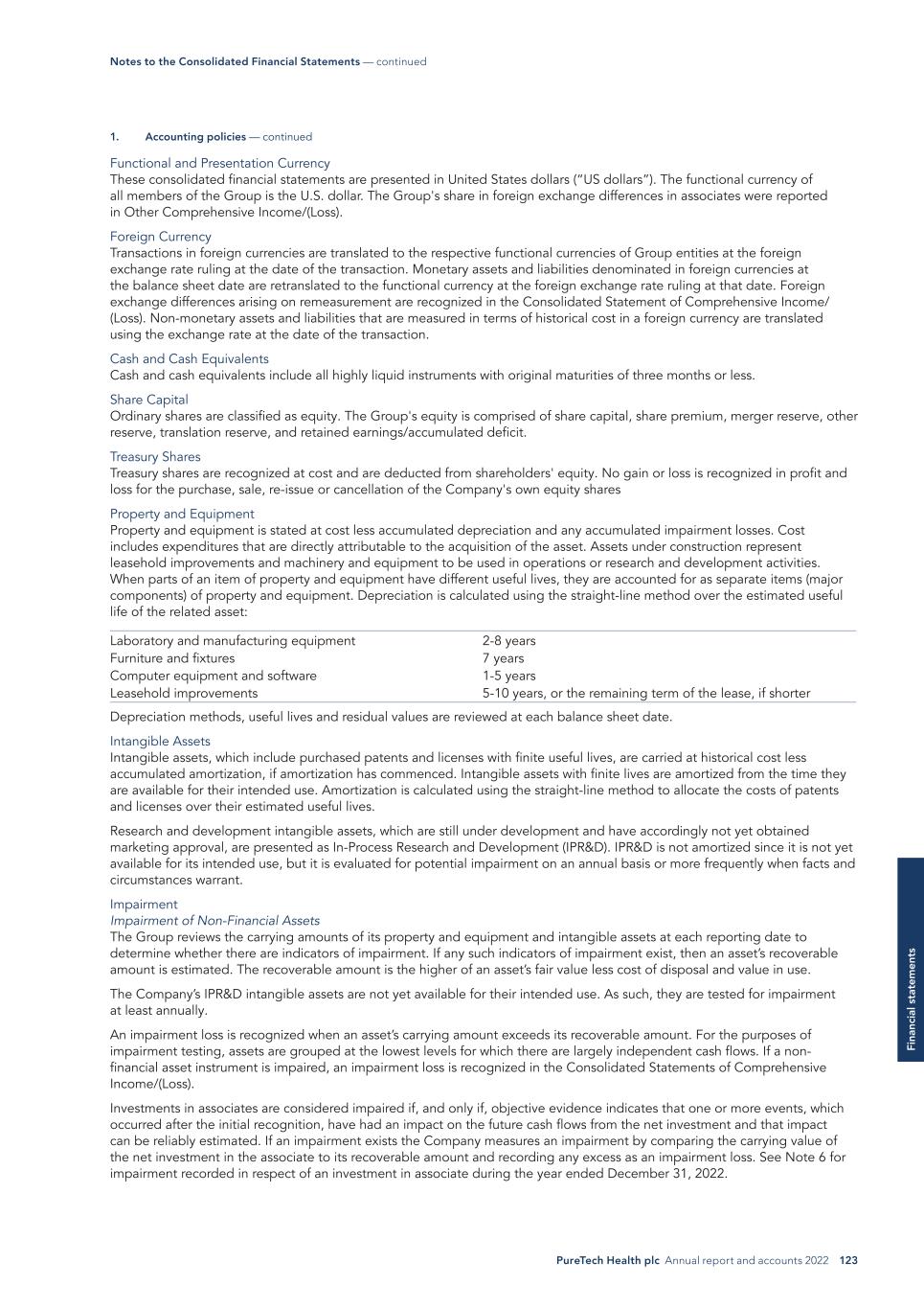 PureTech Health plc Annual report and accounts 2022 123 Fi na nc ia l s ta te m en ts Functional and Presentation Currency These consolidated financial statements are presented in United States dollars (“US dollars”). The functional currency of all members of the Group is the U.S. dollar. The Group's share in foreign exchange differences in associates were reported in Other Comprehensive Income/(Loss). Foreign Currency Transactions in foreign currencies are translated to the respective functional currencies of Group entities at the foreign exchange rate ruling at the date of the transaction. Monetary assets and liabilities denominated in foreign currencies at the balance sheet date are retranslated to the functional currency at the foreign exchange rate ruling at that date. Foreign exchange differences arising on remeasurement are recognized in the Consolidated Statement of Comprehensive Income/ (Loss). Non-monetary assets and liabilities that are measured in terms of historical cost in a foreign currency are translated using the exchange rate at the date of the transaction. Cash and Cash Equivalents Cash and cash equivalents include all highly liquid instruments with original maturities of three months or less. Share Capital Ordinary shares are classified as equity. The Group's equity is comprised of share capital, share premium, merger reserve, other reserve, translation reserve, and retained earnings/accumulated deficit. Treasury Shares Treasury shares are recognized at cost and are deducted from shareholders' equity. No gain or loss is recognized in profit and loss for the purchase, sale, re-issue or cancellation of the Company's own equity shares Property and Equipment Property and equipment is stated at cost less accumulated depreciation and any accumulated impairment losses. Cost includes expenditures that are directly attributable to the acquisition of the asset. Assets under construction represent leasehold improvements and machinery and equipment to be used in operations or research and development activities. When parts of an item of property and equipment have different useful lives, they are accounted for as separate items (major components) of property and equipment. Depreciation is calculated using the straight-line method over the estimated useful life of the related asset: Laboratory and manufacturing equipment 2-8 years Furniture and fixtures 7 years Computer equipment and software 1-5 years Leasehold improvements 5-10 years, or the remaining term of the lease, if shorter Depreciation methods, useful lives and residual values are reviewed at each balance sheet date. Intangible Assets Intangible assets, which include purchased patents and licenses with finite useful lives, are carried at historical cost less accumulated amortization, if amortization has commenced. Intangible assets with finite lives are amortized from the time they are available for their intended use. Amortization is calculated using the straight-line method to allocate the costs of patents and licenses over their estimated useful lives. Research and development intangible assets, which are still under development and have accordingly not yet obtained marketing approval, are presented as In-Process Research and Development (IPR&D). IPR&D is not amortized since it is not yet available for its intended use, but it is evaluated for potential impairment on an annual basis or more frequently when facts and circumstances warrant. Impairment Impairment of Non-Financial Assets The Group reviews the carrying amounts of its property and equipment and intangible assets at each reporting date to determine whether there are indicators of impairment. If any such indicators of impairment exist, then an asset’s recoverable amount is estimated. The recoverable amount is the higher of an asset’s fair value less cost of disposal and value in use. The Company’s IPR&D intangible assets are not yet available for their intended use. As such, they are tested for impairment at least annually. An impairment loss is recognized when an asset’s carrying amount exceeds its recoverable amount. For the purposes of impairment testing, assets are grouped at the lowest levels for which there are largely independent cash flows. If a non- financial asset instrument is impaired, an impairment loss is recognized in the Consolidated Statements of Comprehensive Income/(Loss). Investments in associates are considered impaired if, and only if, objective evidence indicates that one or more events, which occurred after the initial recognition, have had an impact on the future cash flows from the net investment and that impact can be reliably estimated. If an impairment exists the Company measures an impairment by comparing the carrying value of the net investment in the associate to its recoverable amount and recording any excess as an impairment loss. See Note 6 for impairment recorded in respect of an investment in associate during the year ended December 31, 2022. 1. Accounting policies — continued Notes to the Consolidated Financial Statements — continued