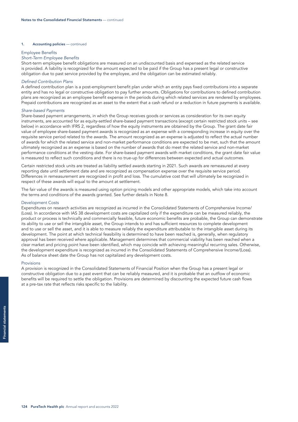 124 PureTech Health plc Annual report and accounts 2022 Fi na nc ia l s ta te m en ts Employee Benefits Short-Term Employee Benefits Short-term employee benefit obligations are measured on an undiscounted basis and expensed as the related service is provided. A liability is recognized for the amount expected to be paid if the Group has a present legal or constructive obligation due to past service provided by the employee, and the obligation can be estimated reliably. Defined Contribution Plans A defined contribution plan is a post-employment benefit plan under which an entity pays fixed contributions into a separate entity and has no legal or constructive obligation to pay further amounts. Obligations for contributions to defined contribution plans are recognized as an employee benefit expense in the periods during which related services are rendered by employees. Prepaid contributions are recognized as an asset to the extent that a cash refund or a reduction in future payments is available. Share-based Payments Share-based payment arrangements, in which the Group receives goods or services as consideration for its own equity instruments, are accounted for as equity-settled share-based payment transactions (except certain restricted stock units – see below) in accordance with IFRS 2, regardless of how the equity instruments are obtained by the Group. The grant date fair value of employee share-based payment awards is recognized as an expense with a corresponding increase in equity over the requisite service period related to the awards. The amount recognized as an expense is adjusted to reflect the actual number of awards for which the related service and non-market performance conditions are expected to be met, such that the amount ultimately recognized as an expense is based on the number of awards that do meet the related service and non-market performance conditions at the vesting date. For share-based payment awards with market conditions, the grant date fair value is measured to reflect such conditions and there is no true-up for differences between expected and actual outcomes. Certain restricted stock units are treated as liability settled awards starting in 2021. Such awards are remeasured at every reporting date until settlement date and are recognized as compensation expense over the requisite service period. Differences in remeasurement are recognized in profit and loss. The cumulative cost that will ultimately be recognized in respect of these awards will equal to the amount at settlement. The fair value of the awards is measured using option pricing models and other appropriate models, which take into account the terms and conditions of the awards granted. See further details in Note 8. Development Costs Expenditures on research activities are recognized as incurred in the Consolidated Statements of Comprehensive Income/ (Loss). In accordance with IAS 38 development costs are capitalized only if the expenditure can be measured reliably, the product or process is technically and commercially feasible, future economic benefits are probable, the Group can demonstrate its ability to use or sell the intangible asset, the Group intends to and has sufficient resources to complete development and to use or sell the asset, and it is able to measure reliably the expenditure attributable to the intangible asset during its development. The point at which technical feasibility is determined to have been reached is, generally, when regulatory approval has been received where applicable. Management determines that commercial viability has been reached when a clear market and pricing point have been identified, which may coincide with achieving meaningful recurring sales. Otherwise, the development expenditure is recognized as incurred in the Consolidated Statements of Comprehensive Income/(Loss). As of balance sheet date the Group has not capitalized any development costs. Provisions A provision is recognized in the Consolidated Statements of Financial Position when the Group has a present legal or constructive obligation due to a past event that can be reliably measured, and it is probable that an outflow of economic benefits will be required to settle the obligation. Provisions are determined by discounting the expected future cash flows at a pre-tax rate that reflects risks specific to the liability. 1. Accounting policies — continued Notes to the Consolidated Financial Statements — continued