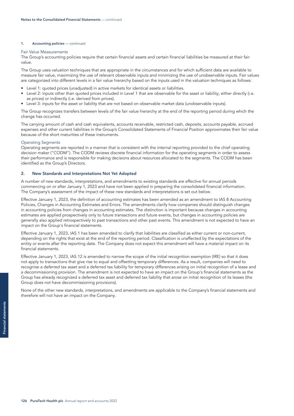 126 PureTech Health plc Annual report and accounts 2022 Fi na nc ia l s ta te m en ts Fair Value Measurements The Group’s accounting policies require that certain financial assets and certain financial liabilities be measured at their fair value. The Group uses valuation techniques that are appropriate in the circumstances and for which sufficient data are available to measure fair value, maximizing the use of relevant observable inputs and minimizing the use of unobservable inputs. Fair values are categorized into different levels in a fair value hierarchy based on the inputs used in the valuation techniques as follows: • Level 1: quoted prices (unadjusted) in active markets for identical assets or liabilities. • Level 2: inputs other than quoted prices included in Level 1 that are observable for the asset or liability, either directly (i.e. as prices) or indirectly (i.e. derived from prices). • Level 3: inputs for the asset or liability that are not based on observable market data (unobservable inputs). The Group recognizes transfers between levels of the fair value hierarchy at the end of the reporting period during which the change has occurred. The carrying amount of cash and cash equivalents, accounts receivable, restricted cash, deposits, accounts payable, accrued expenses and other current liabilities in the Group’s Consolidated Statements of Financial Position approximates their fair value because of the short maturities of these instruments. Operating Segments Operating segments are reported in a manner that is consistent with the internal reporting provided to the chief operating decision maker (“CODM”). The CODM reviews discrete financial information for the operating segments in order to assess their performance and is responsible for making decisions about resources allocated to the segments. The CODM has been identified as the Group’s Directors. 2. New Standards and Interpretations Not Yet Adopted A number of new standards, interpretations, and amendments to existing standards are effective for annual periods commencing on or after January 1, 2023 and have not been applied in preparing the consolidated financial information. The Company’s assessment of the impact of these new standards and interpretations is set out below. Effective January 1, 2023, the definition of accounting estimates has been amended as an amendment to IAS 8 Accounting Policies, Changes in Accounting Estimates and Errors. The amendments clarify how companies should distinguish changes in accounting policies from changes in accounting estimates. The distinction is important because changes in accounting estimates are applied prospectively only to future transactions and future events, but changes in accounting policies are generally also applied retrospectively to past transactions and other past events. This amendment is not expected to have an impact on the Group's financial statements. Effective January 1, 2023, IAS 1 has been amended to clarify that liabilities are classified as either current or non-current, depending on the rights that exist at the end of the reporting period. Classification is unaffected by the expectations of the entity or events after the reporting date. The Company does not expect this amendment will have a material impact on its financial statements. Effective January 1, 2023, IAS 12 is amended to narrow the scope of the initial recognition exemption (IRE) so that it does not apply to transactions that give rise to equal and offsetting temporary differences. As a result, companies will need to recognise a deferred tax asset and a deferred tax liability for temporary differences arising on initial recognition of a lease and a decommissioning provision. The amendment is not expected to have an impact on the Group's financial statements as the Group has already recognized a deferred tax asset and deferred tax liability that arose on initial recognition of its leases (the Group does not have decommissioning provisions). None of the other new standards, interpretations, and amendments are applicable to the Company’s financial statements and therefore will not have an impact on the Company. Notes to the Consolidated Financial Statements — continued 1. Accounting policies — continued