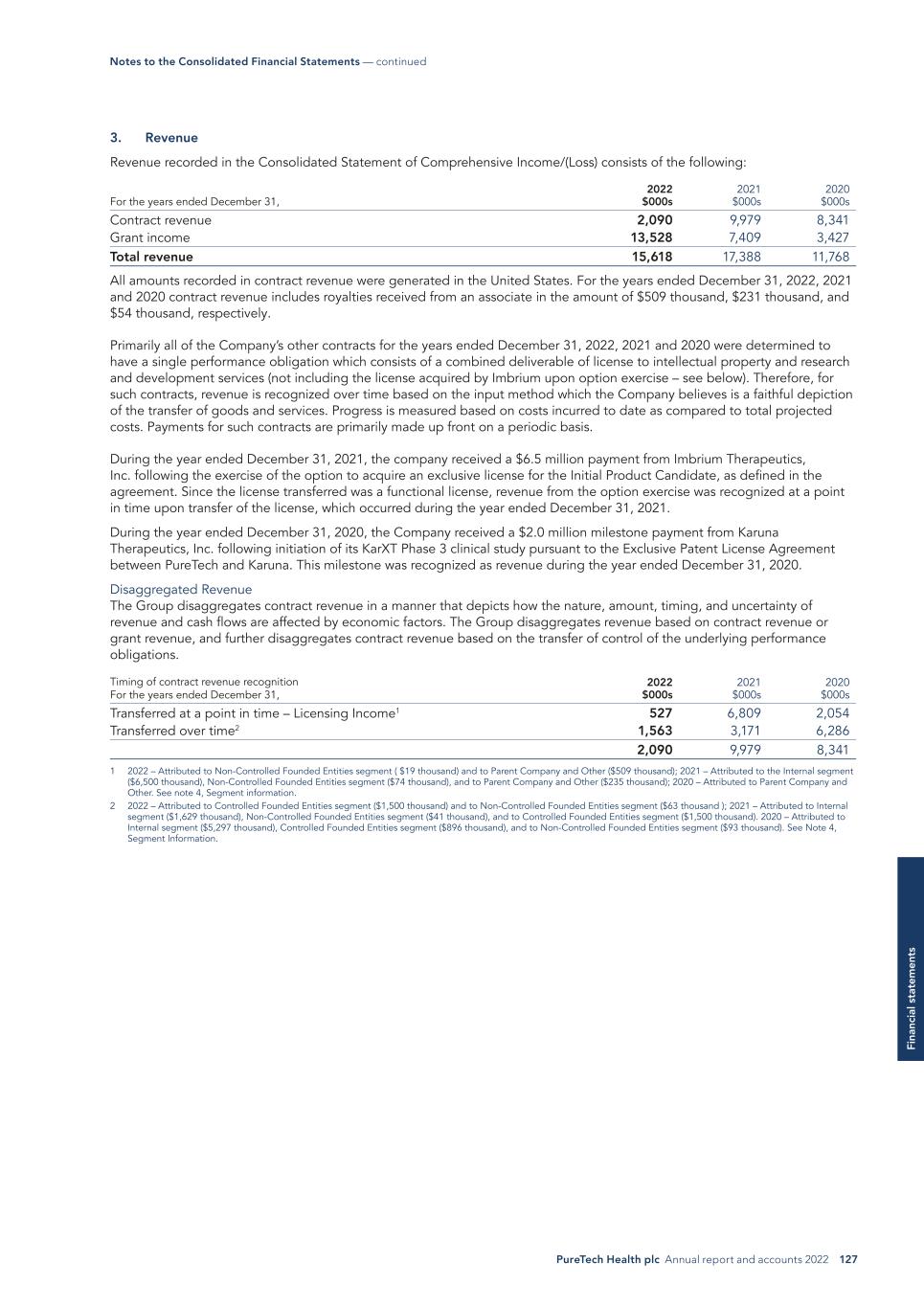 PureTech Health plc Annual report and accounts 2022 127 Fi na nc ia l s ta te m en ts 3. Revenue Revenue recorded in the Consolidated Statement of Comprehensive Income/(Loss) consists of the following: For the years ended December 31, 2022 $000s 2021 $000s 2020 $000s Contract revenue 2,090 9,979 8,341 Grant income 13,528 7,409 3,427 Total revenue 15,618 17,388 11,768 All amounts recorded in contract revenue were generated in the United States. For the years ended December 31, 2022, 2021 and 2020 contract revenue includes royalties received from an associate in the amount of $509 thousand, $231 thousand, and $54 thousand, respectively. Primarily all of the Company’s other contracts for the years ended December 31, 2022, 2021 and 2020 were determined to have a single performance obligation which consists of a combined deliverable of license to intellectual property and research and development services (not including the license acquired by Imbrium upon option exercise – see below). Therefore, for such contracts, revenue is recognized over time based on the input method which the Company believes is a faithful depiction of the transfer of goods and services. Progress is measured based on costs incurred to date as compared to total projected costs. Payments for such contracts are primarily made up front on a periodic basis. During the year ended December 31, 2021, the company received a $6.5 million payment from Imbrium Therapeutics, Inc. following the exercise of the option to acquire an exclusive license for the Initial Product Candidate, as defined in the agreement. Since the license transferred was a functional license, revenue from the option exercise was recognized at a point in time upon transfer of the license, which occurred during the year ended December 31, 2021. During the year ended December 31, 2020, the Company received a $2.0 million milestone payment from Karuna Therapeutics, Inc. following initiation of its KarXT Phase 3 clinical study pursuant to the Exclusive Patent License Agreement between PureTech and Karuna. This milestone was recognized as revenue during the year ended December 31, 2020. Disaggregated Revenue The Group disaggregates contract revenue in a manner that depicts how the nature, amount, timing, and uncertainty of revenue and cash flows are affected by economic factors. The Group disaggregates revenue based on contract revenue or grant revenue, and further disaggregates contract revenue based on the transfer of control of the underlying performance obligations. Timing of contract revenue recognition For the years ended December 31, 2022 $000s 2021 $000s 2020 $000s Transferred at a point in time – Licensing Income1 527 6,809 2,054 Transferred over time2 1,563 3,171 6,286 2,090 9,979 8,341 1 2022 – Attributed to Non-Controlled Founded Entities segment ( $19 thousand) and to Parent Company and Other ($509 thousand); 2021 – Attributed to the Internal segment ($6,500 thousand), Non-Controlled Founded Entities segment ($74 thousand), and to Parent Company and Other ($235 thousand); 2020 – Attributed to Parent Company and Other. See note 4, Segment information. 2 2022 – Attributed to Controlled Founded Entities segment ($1,500 thousand) and to Non-Controlled Founded Entities segment ($63 thousand ); 2021 – Attributed to Internal segment ($1,629 thousand), Non-Controlled Founded Entities segment ($41 thousand), and to Controlled Founded Entities segment ($1,500 thousand). 2020 – Attributed to Internal segment ($5,297 thousand), Controlled Founded Entities segment ($896 thousand), and to Non-Controlled Founded Entities segment ($93 thousand). See Note 4, Segment Information. Notes to the Consolidated Financial Statements — continued