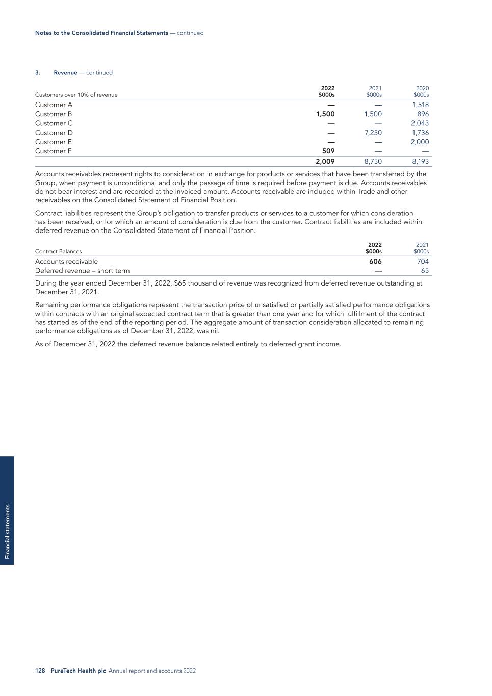 128 PureTech Health plc Annual report and accounts 2022 Fi na nc ia l s ta te m en ts Customers over 10% of revenue 2022 $000s 2021 $000s 2020 $000s Customer A — — 1,518 Customer B 1,500 1,500 896 Customer C — — 2,043 Customer D — 7,250 1,736 Customer E — — 2,000 Customer F 509 — — 2,009 8,750 8,193 Accounts receivables represent rights to consideration in exchange for products or services that have been transferred by the Group, when payment is unconditional and only the passage of time is required before payment is due. Accounts receivables do not bear interest and are recorded at the invoiced amount. Accounts receivable are included within Trade and other receivables on the Consolidated Statement of Financial Position. Contract liabilities represent the Group’s obligation to transfer products or services to a customer for which consideration has been received, or for which an amount of consideration is due from the customer. Contract liabilities are included within deferred revenue on the Consolidated Statement of Financial Position. Contract Balances 2022 $000s 2021 $000s Accounts receivable 606 704 Deferred revenue – short term — 65 During the year ended December 31, 2022, $65 thousand of revenue was recognized from deferred revenue outstanding at December 31, 2021. Remaining performance obligations represent the transaction price of unsatisfied or partially satisfied performance obligations within contracts with an original expected contract term that is greater than one year and for which fulfillment of the contract has started as of the end of the reporting period. The aggregate amount of transaction consideration allocated to remaining performance obligations as of December 31, 2022, was nil. As of December 31, 2022 the deferred revenue balance related entirely to deferred grant income. Notes to the Consolidated Financial Statements — continued 3. Revenue — continued