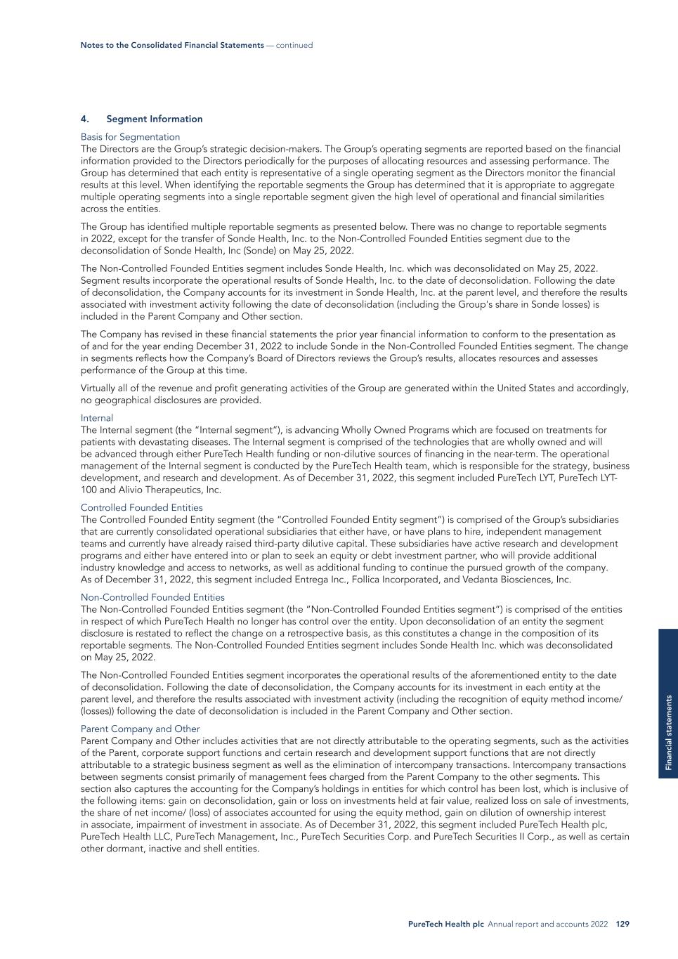 PureTech Health plc Annual report and accounts 2022 129 Fi na nc ia l s ta te m en ts 4. Segment Information Basis for Segmentation The Directors are the Group’s strategic decision-makers. The Group’s operating segments are reported based on the financial information provided to the Directors periodically for the purposes of allocating resources and assessing performance. The Group has determined that each entity is representative of a single operating segment as the Directors monitor the financial results at this level. When identifying the reportable segments the Group has determined that it is appropriate to aggregate multiple operating segments into a single reportable segment given the high level of operational and financial similarities across the entities. The Group has identified multiple reportable segments as presented below. There was no change to reportable segments in 2022, except for the transfer of Sonde Health, Inc. to the Non-Controlled Founded Entities segment due to the deconsolidation of Sonde Health, Inc (Sonde) on May 25, 2022. The Non-Controlled Founded Entities segment includes Sonde Health, Inc. which was deconsolidated on May 25, 2022. Segment results incorporate the operational results of Sonde Health, Inc. to the date of deconsolidation. Following the date of deconsolidation, the Company accounts for its investment in Sonde Health, Inc. at the parent level, and therefore the results associated with investment activity following the date of deconsolidation (including the Group's share in Sonde losses) is included in the Parent Company and Other section. The Company has revised in these financial statements the prior year financial information to conform to the presentation as of and for the year ending December 31, 2022 to include Sonde in the Non-Controlled Founded Entities segment. The change in segments reflects how the Company’s Board of Directors reviews the Group’s results, allocates resources and assesses performance of the Group at this time. Virtually all of the revenue and profit generating activities of the Group are generated within the United States and accordingly, no geographical disclosures are provided. Internal The Internal segment (the “Internal segment”), is advancing Wholly Owned Programs which are focused on treatments for patients with devastating diseases. The Internal segment is comprised of the technologies that are wholly owned and will be advanced through either PureTech Health funding or non-dilutive sources of financing in the near-term. The operational management of the Internal segment is conducted by the PureTech Health team, which is responsible for the strategy, business development, and research and development. As of December 31, 2022, this segment included PureTech LYT, PureTech LYT- 100 and Alivio Therapeutics, Inc. Controlled Founded Entities The Controlled Founded Entity segment (the “Controlled Founded Entity segment”) is comprised of the Group’s subsidiaries that are currently consolidated operational subsidiaries that either have, or have plans to hire, independent management teams and currently have already raised third-party dilutive capital. These subsidiaries have active research and development programs and either have entered into or plan to seek an equity or debt investment partner, who will provide additional industry knowledge and access to networks, as well as additional funding to continue the pursued growth of the company. As of December 31, 2022, this segment included Entrega Inc., Follica Incorporated, and Vedanta Biosciences, Inc. Non-Controlled Founded Entities The Non-Controlled Founded Entities segment (the “Non-Controlled Founded Entities segment”) is comprised of the entities in respect of which PureTech Health no longer has control over the entity. Upon deconsolidation of an entity the segment disclosure is restated to reflect the change on a retrospective basis, as this constitutes a change in the composition of its reportable segments. The Non-Controlled Founded Entities segment includes Sonde Health Inc. which was deconsolidated on May 25, 2022. The Non-Controlled Founded Entities segment incorporates the operational results of the aforementioned entity to the date of deconsolidation. Following the date of deconsolidation, the Company accounts for its investment in each entity at the parent level, and therefore the results associated with investment activity (including the recognition of equity method income/ (losses)) following the date of deconsolidation is included in the Parent Company and Other section. Parent Company and Other Parent Company and Other includes activities that are not directly attributable to the operating segments, such as the activities of the Parent, corporate support functions and certain research and development support functions that are not directly attributable to a strategic business segment as well as the elimination of intercompany transactions. Intercompany transactions between segments consist primarily of management fees charged from the Parent Company to the other segments. This section also captures the accounting for the Company’s holdings in entities for which control has been lost, which is inclusive of the following items: gain on deconsolidation, gain or loss on investments held at fair value, realized loss on sale of investments, the share of net income/ (loss) of associates accounted for using the equity method, gain on dilution of ownership interest in associate, impairment of investment in associate. As of December 31, 2022, this segment included PureTech Health plc, PureTech Health LLC, PureTech Management, Inc., PureTech Securities Corp. and PureTech Securities II Corp., as well as certain other dormant, inactive and shell entities. Notes to the Consolidated Financial Statements — continued
