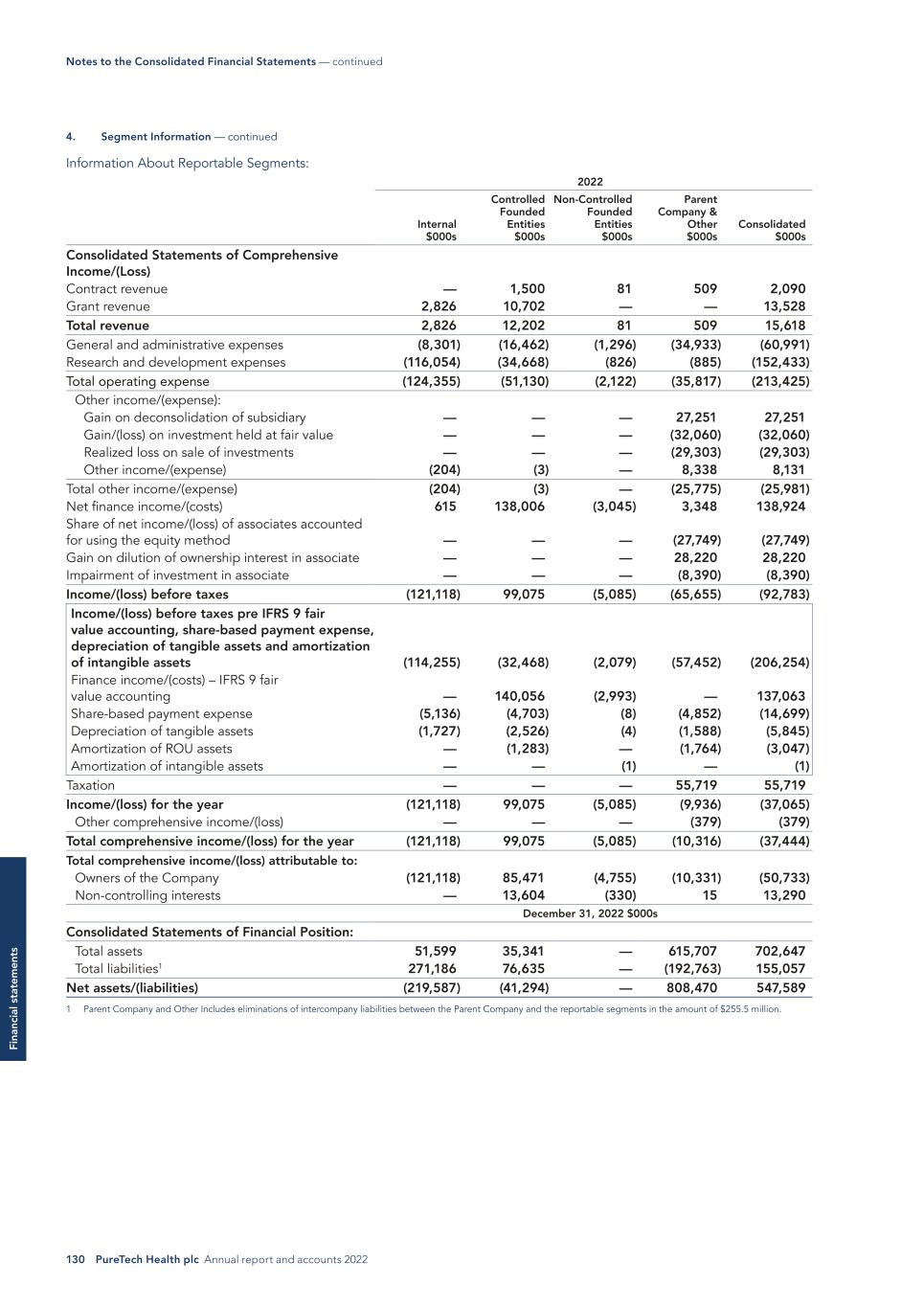 130 PureTech Health plc Annual report and accounts 2022 Fi na nc ia l s ta te m en ts Information About Reportable Segments: 2022 Internal $000s Controlled Founded Entities $000s Non-Controlled Founded Entities $000s Parent Company & Other $000s Consolidated $000s Consolidated Statements of Comprehensive Income/(Loss) Contract revenue — 1,500 81 509 2,090 Grant revenue 2,826 10,702 — — 13,528 Total revenue 2,826 12,202 81 509 15,618 General and administrative expenses (8,301) (16,462) (1,296) (34,933) (60,991) Research and development expenses (116,054) (34,668) (826) (885) (152,433) Total operating expense (124,355) (51,130) (2,122) (35,817) (213,425) Other income/(expense): Gain on deconsolidation of subsidiary — — — 27,251 27,251 Gain/(loss) on investment held at fair value — — — (32,060) (32,060) Realized loss on sale of investments — — — (29,303) (29,303) Other income/(expense) (204) (3) — 8,338 8,131 Total other income/(expense) (204) (3) — (25,775) (25,981) Net finance income/(costs) 615 138,006 (3,045) 3,348 138,924 Share of net income/(loss) of associates accounted for using the equity method — — — (27,749) (27,749) Gain on dilution of ownership interest in associate — — — 28,220 28,220 Impairment of investment in associate — — — (8,390) (8,390) Income/(loss) before taxes (121,118) 99,075 (5,085) (65,655) (92,783) Income/(loss) before taxes pre IFRS 9 fair value accounting, share-based payment expense, depreciation of tangible assets and amortization of intangible assets (114,255) (32,468) (2,079) (57,452) (206,254) Finance income/(costs) – IFRS 9 fair value accounting — 140,056 (2,993) — 137,063 Share-based payment expense (5,136) (4,703) (8) (4,852) (14,699) Depreciation of tangible assets (1,727) (2,526) (4) (1,588) (5,845) Amortization of ROU assets — (1,283) — (1,764) (3,047) Amortization of intangible assets — — (1) — (1) Taxation — — — 55,719 55,719 Income/(loss) for the year (121,118) 99,075 (5,085) (9,936) (37,065) Other comprehensive income/(loss) — — — (379) (379) Total comprehensive income/(loss) for the year (121,118) 99,075 (5,085) (10,316) (37,444) Total comprehensive income/(loss) attributable to: Owners of the Company (121,118) 85,471 (4,755) (10,331) (50,733) Non-controlling interests — 13,604 (330) 15 13,290 December 31, 2022 $000s Consolidated Statements of Financial Position: Total assets 51,599 35,341 — 615,707 702,647 Total liabilities1 271,186 76,635 — (192,763) 155,057 Net assets/(liabilities) (219,587) (41,294) — 808,470 547,589 1 Parent Company and Other Includes eliminations of intercompany liabilities between the Parent Company and the reportable segments in the amount of $255.5 million. 4. Segment Information — continued Notes to the Consolidated Financial Statements — continued