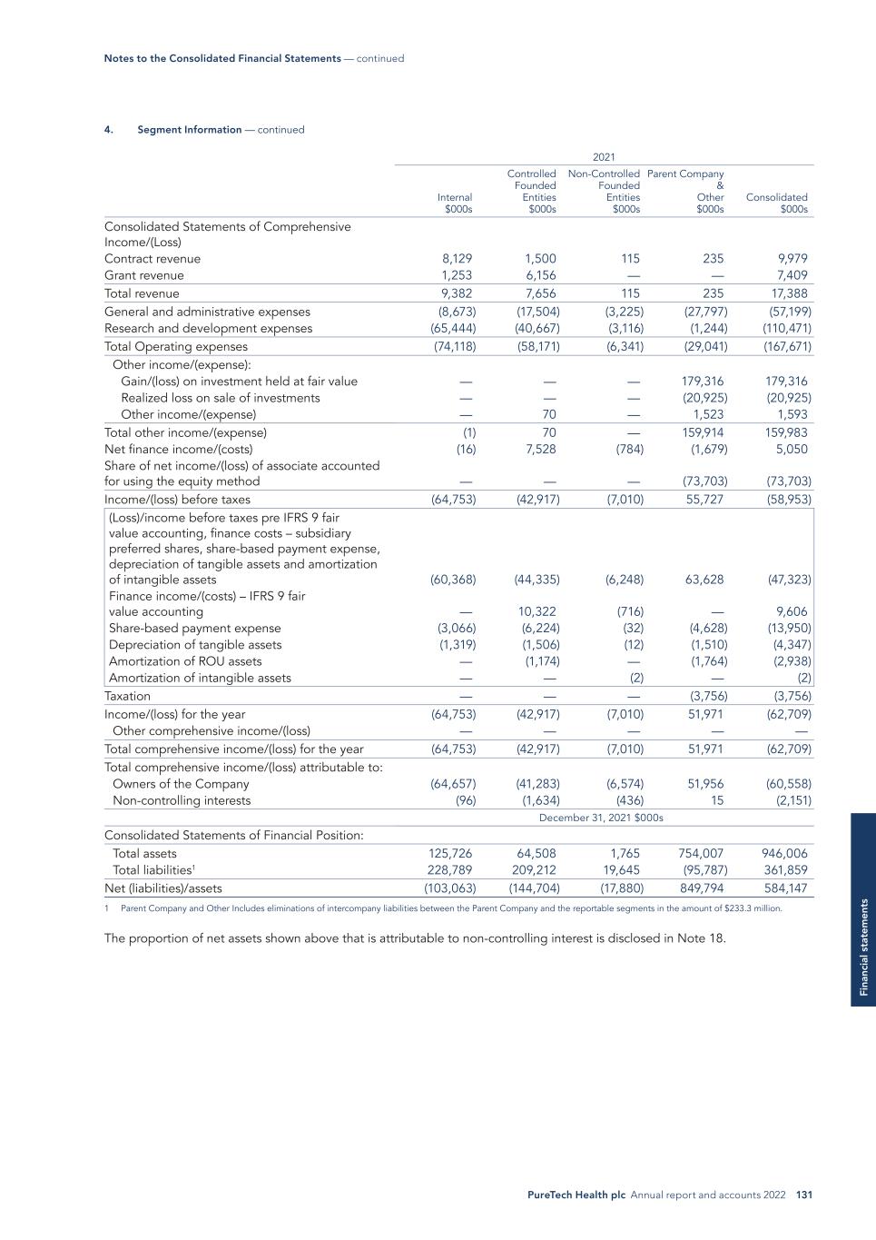PureTech Health plc Annual report and accounts 2022 131 Fi na nc ia l s ta te m en ts 2021 Internal $000s Controlled Founded Entities $000s Non-Controlled Founded Entities $000s Parent Company & Other $000s Consolidated $000s Consolidated Statements of Comprehensive Income/(Loss) Contract revenue 8,129 1,500 115 235 9,979 Grant revenue 1,253 6,156 — — 7,409 Total revenue 9,382 7,656 115 235 17,388 General and administrative expenses (8,673) (17,504) (3,225) (27,797) (57,199) Research and development expenses (65,444) (40,667) (3,116) (1,244) (110,471) Total Operating expenses (74,118) (58,171) (6,341) (29,041) (167,671) Other income/(expense): Gain/(loss) on investment held at fair value — — — 179,316 179,316 Realized loss on sale of investments — — — (20,925) (20,925) Other income/(expense) — 70 — 1,523 1,593 Total other income/(expense) (1) 70 — 159,914 159,983 Net finance income/(costs) (16) 7,528 (784) (1,679) 5,050 Share of net income/(loss) of associate accounted for using the equity method — — — (73,703) (73,703) Income/(loss) before taxes (64,753) (42,917) (7,010) 55,727 (58,953) (Loss)/income before taxes pre IFRS 9 fair value accounting, finance costs – subsidiary preferred shares, share-based payment expense, depreciation of tangible assets and amortization of intangible assets (60,368) (44,335) (6,248) 63,628 (47,323) Finance income/(costs) – IFRS 9 fair value accounting — 10,322 (716) — 9,606 Share-based payment expense (3,066) (6,224) (32) (4,628) (13,950) Depreciation of tangible assets (1,319) (1,506) (12) (1,510) (4,347) Amortization of ROU assets — (1,174) — (1,764) (2,938) Amortization of intangible assets — — (2) — (2) Taxation — — — (3,756) (3,756) Income/(loss) for the year (64,753) (42,917) (7,010) 51,971 (62,709) Other comprehensive income/(loss) — — — — — Total comprehensive income/(loss) for the year (64,753) (42,917) (7,010) 51,971 (62,709) Total comprehensive income/(loss) attributable to: Owners of the Company (64,657) (41,283) (6,574) 51,956 (60,558) Non-controlling interests (96) (1,634) (436) 15 (2,151) December 31, 2021 $000s Consolidated Statements of Financial Position: Total assets 125,726 64,508 1,765 754,007 946,006 Total liabilities1 228,789 209,212 19,645 (95,787) 361,859 Net (liabilities)/assets (103,063) (144,704) (17,880) 849,794 584,147 1 Parent Company and Other Includes eliminations of intercompany liabilities between the Parent Company and the reportable segments in the amount of $233.3 million. The proportion of net assets shown above that is attributable to non-controlling interest is disclosed in Note 18. Notes to the Consolidated Financial Statements — continued 4. Segment Information — continued