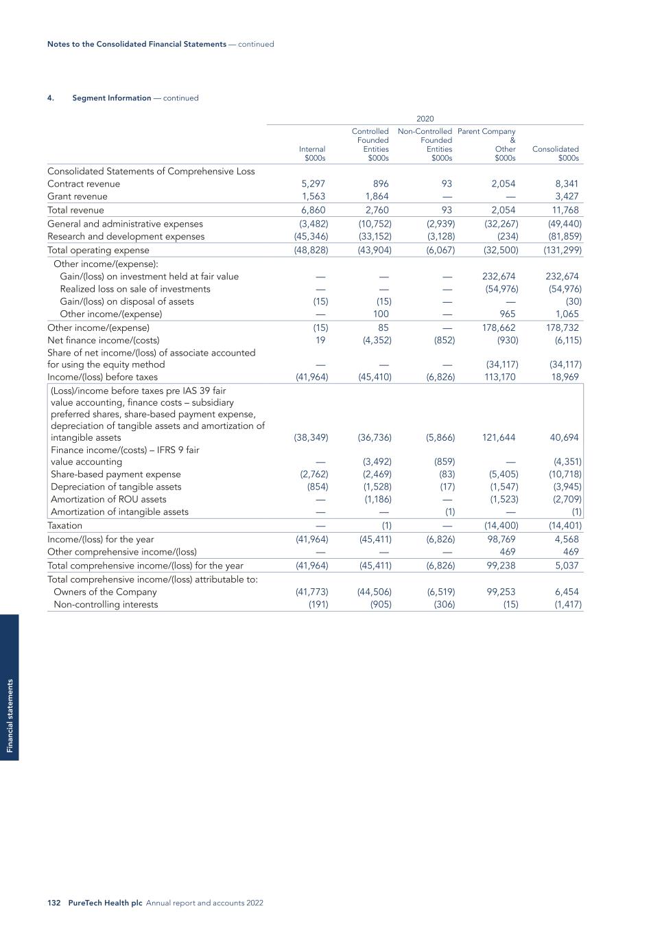 132 PureTech Health plc Annual report and accounts 2022 Fi na nc ia l s ta te m en ts 2020 Internal $000s Controlled Founded Entities $000s Non-Controlled Founded Entities $000s Parent Company & Other $000s Consolidated $000s Consolidated Statements of Comprehensive Loss Contract revenue 5,297 896 93 2,054 8,341 Grant revenue 1,563 1,864 — — 3,427 Total revenue 6,860 2,760 93 2,054 11,768 General and administrative expenses (3,482) (10,752) (2,939) (32,267) (49,440) Research and development expenses (45,346) (33,152) (3,128) (234) (81,859) Total operating expense (48,828) (43,904) (6,067) (32,500) (131,299) Other income/(expense): Gain/(loss) on investment held at fair value — — — 232,674 232,674 Realized loss on sale of investments — — — (54,976) (54,976) Gain/(loss) on disposal of assets (15) (15) — — (30) Other income/(expense) — 100 — 965 1,065 Other income/(expense) (15) 85 — 178,662 178,732 Net finance income/(costs) 19 (4,352) (852) (930) (6,115) Share of net income/(loss) of associate accounted for using the equity method — — — (34,117) (34,117) Income/(loss) before taxes (41,964) (45,410) (6,826) 113,170 18,969 (Loss)/income before taxes pre IAS 39 fair value accounting, finance costs – subsidiary preferred shares, share-based payment expense, depreciation of tangible assets and amortization of intangible assets (38,349) (36,736) (5,866) 121,644 40,694 Finance income/(costs) – IFRS 9 fair value accounting — (3,492) (859) — (4,351) Share-based payment expense (2,762) (2,469) (83) (5,405) (10,718) Depreciation of tangible assets (854) (1,528) (17) (1,547) (3,945) Amortization of ROU assets — (1,186) — (1,523) (2,709) Amortization of intangible assets — — (1) — (1) Taxation — (1) — (14,400) (14,401) Income/(loss) for the year (41,964) (45,411) (6,826) 98,769 4,568 Other comprehensive income/(loss) — — — 469 469 Total comprehensive income/(loss) for the year (41,964) (45,411) (6,826) 99,238 5,037 Total comprehensive income/(loss) attributable to: Owners of the Company (41,773) (44,506) (6,519) 99,253 6,454 Non-controlling interests (191) (905) (306) (15) (1,417) Notes to the Consolidated Financial Statements — continued 4. Segment Information — continued