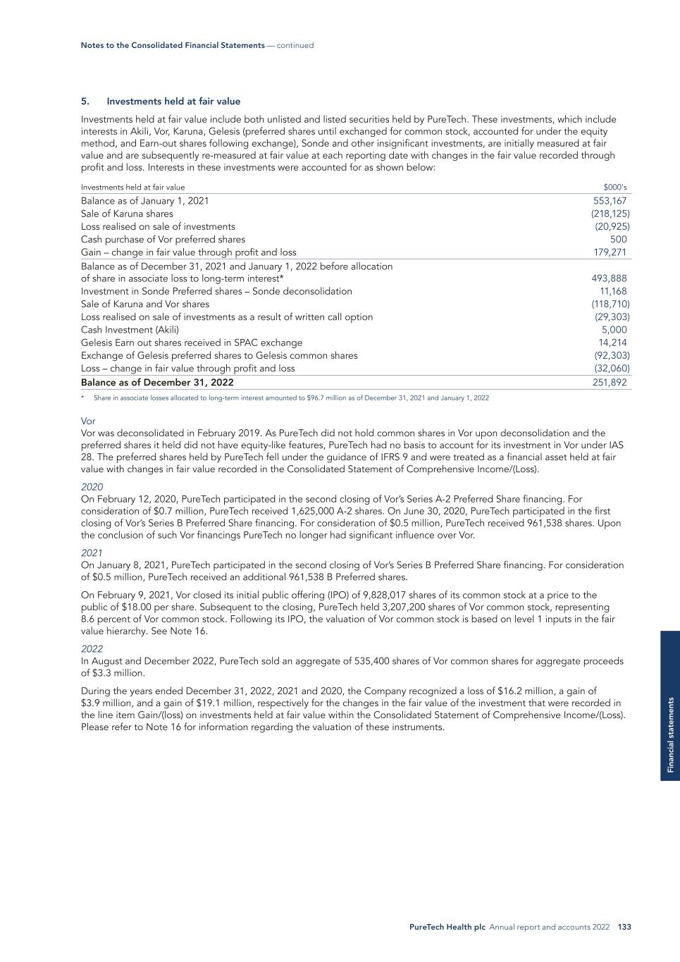 PureTech Health plc Annual report and accounts 2022 133 Fi na nc ia l s ta te m en ts 5. Investments held at fair value Investments held at fair value include both unlisted and listed securities held by PureTech. These investments, which include interests in Akili, Vor, Karuna, Gelesis (preferred shares until exchanged for common stock, accounted for under the equity method, and Earn-out shares following exchange), Sonde and other insignificant investments, are initially measured at fair value and are subsequently re-measured at fair value at each reporting date with changes in the fair value recorded through profit and loss. Interests in these investments were accounted for as shown below: Investments held at fair value $000's Balance as of January 1, 2021 553,167 Sale of Karuna shares (218,125) Loss realised on sale of investments (20,925) Cash purchase of Vor preferred shares 500 Gain – change in fair value through profit and loss 179,271 Balance as of December 31, 2021 and January 1, 2022 before allocation of share in associate loss to long-term interest* 493,888 Investment in Sonde Preferred shares – Sonde deconsolidation 11,168 Sale of Karuna and Vor shares (118,710) Loss realised on sale of investments as a result of written call option (29,303) Cash Investment (Akili) 5,000 Gelesis Earn out shares received in SPAC exchange 14,214 Exchange of Gelesis preferred shares to Gelesis common shares (92,303) Loss – change in fair value through profit and loss (32,060) Balance as of December 31, 2022 251,892 * Share in associate losses allocated to long-term interest amounted to $96.7 million as of December 31, 2021 and January 1, 2022 Vor Vor was deconsolidated in February 2019. As PureTech did not hold common shares in Vor upon deconsolidation and the preferred shares it held did not have equity-like features, PureTech had no basis to account for its investment in Vor under IAS 28. The preferred shares held by PureTech fell under the guidance of IFRS 9 and were treated as a financial asset held at fair value with changes in fair value recorded in the Consolidated Statement of Comprehensive Income/(Loss). 2020 On February 12, 2020, PureTech participated in the second closing of Vor’s Series A-2 Preferred Share financing. For consideration of $0.7 million, PureTech received 1,625,000 A-2 shares. On June 30, 2020, PureTech participated in the first closing of Vor’s Series B Preferred Share financing. For consideration of $0.5 million, PureTech received 961,538 shares. Upon the conclusion of such Vor financings PureTech no longer had significant influence over Vor. 2021 On January 8, 2021, PureTech participated in the second closing of Vor’s Series B Preferred Share financing. For consideration of $0.5 million, PureTech received an additional 961,538 B Preferred shares. On February 9, 2021, Vor closed its initial public offering (IPO) of 9,828,017 shares of its common stock at a price to the public of $18.00 per share. Subsequent to the closing, PureTech held 3,207,200 shares of Vor common stock, representing 8.6 percent of Vor common stock. Following its IPO, the valuation of Vor common stock is based on level 1 inputs in the fair value hierarchy. See Note 16. 2022 In August and December 2022, PureTech sold an aggregate of 535,400 shares of Vor common shares for aggregate proceeds of $3.3 million. During the years ended December 31, 2022, 2021 and 2020, the Company recognized a loss of $16.2 million, a gain of $3.9 million, and a gain of $19.1 million, respectively for the changes in the fair value of the investment that were recorded in the line item Gain/(loss) on investments held at fair value within the Consolidated Statement of Comprehensive Income/(Loss). Please refer to Note 16 for information regarding the valuation of these instruments. Notes to the Consolidated Financial Statements — continued