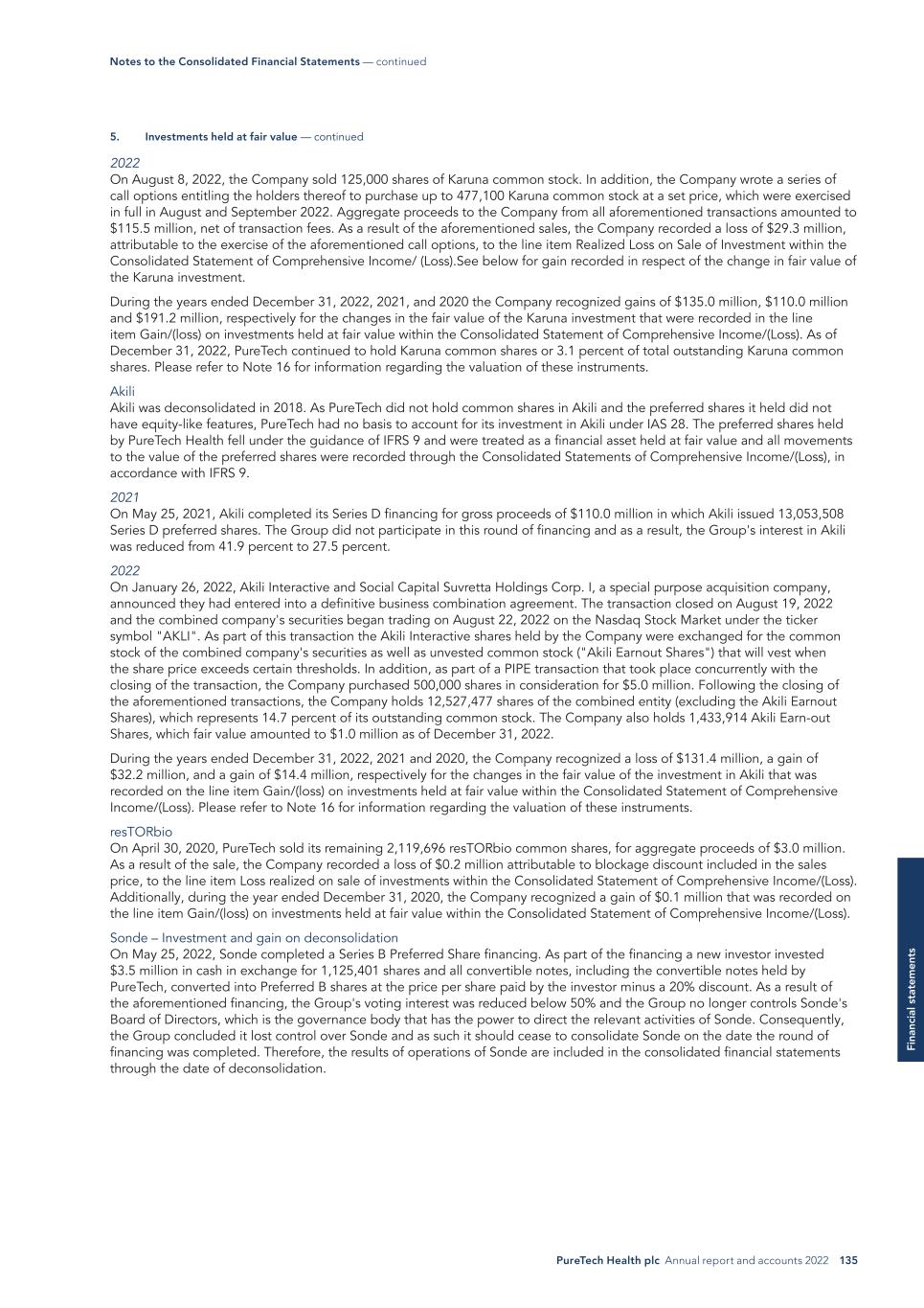 PureTech Health plc Annual report and accounts 2022 135 Fi na nc ia l s ta te m en ts 2022 On August 8, 2022, the Company sold 125,000 shares of Karuna common stock. In addition, the Company wrote a series of call options entitling the holders thereof to purchase up to 477,100 Karuna common stock at a set price, which were exercised in full in August and September 2022. Aggregate proceeds to the Company from all aforementioned transactions amounted to $115.5 million, net of transaction fees. As a result of the aforementioned sales, the Company recorded a loss of $29.3 million, attributable to the exercise of the aforementioned call options, to the line item Realized Loss on Sale of Investment within the Consolidated Statement of Comprehensive Income/ (Loss).See below for gain recorded in respect of the change in fair value of the Karuna investment. During the years ended December 31, 2022, 2021, and 2020 the Company recognized gains of $135.0 million, $110.0 million and $191.2 million, respectively for the changes in the fair value of the Karuna investment that were recorded in the line item Gain/(loss) on investments held at fair value within the Consolidated Statement of Comprehensive Income/(Loss). As of December 31, 2022, PureTech continued to hold Karuna common shares or 3.1 percent of total outstanding Karuna common shares. Please refer to Note 16 for information regarding the valuation of these instruments. Akili Akili was deconsolidated in 2018. As PureTech did not hold common shares in Akili and the preferred shares it held did not have equity-like features, PureTech had no basis to account for its investment in Akili under IAS 28. The preferred shares held by PureTech Health fell under the guidance of IFRS 9 and were treated as a financial asset held at fair value and all movements to the value of the preferred shares were recorded through the Consolidated Statements of Comprehensive Income/(Loss), in accordance with IFRS 9. 2021 On May 25, 2021, Akili completed its Series D financing for gross proceeds of $110.0 million in which Akili issued 13,053,508 Series D preferred shares. The Group did not participate in this round of financing and as a result, the Group's interest in Akili was reduced from 41.9 percent to 27.5 percent. 2022 On January 26, 2022, Akili Interactive and Social Capital Suvretta Holdings Corp. I, a special purpose acquisition company, announced they had entered into a definitive business combination agreement. The transaction closed on August 19, 2022 and the combined company's securities began trading on August 22, 2022 on the Nasdaq Stock Market under the ticker symbol "AKLI". As part of this transaction the Akili Interactive shares held by the Company were exchanged for the common stock of the combined company's securities as well as unvested common stock ("Akili Earnout Shares") that will vest when the share price exceeds certain thresholds. In addition, as part of a PIPE transaction that took place concurrently with the closing of the transaction, the Company purchased 500,000 shares in consideration for $5.0 million. Following the closing of the aforementioned transactions, the Company holds 12,527,477 shares of the combined entity (excluding the Akili Earnout Shares), which represents 14.7 percent of its outstanding common stock. The Company also holds 1,433,914 Akili Earn-out Shares, which fair value amounted to $1.0 million as of December 31, 2022. During the years ended December 31, 2022, 2021 and 2020, the Company recognized a loss of $131.4 million, a gain of $32.2 million, and a gain of $14.4 million, respectively for the changes in the fair value of the investment in Akili that was recorded on the line item Gain/(loss) on investments held at fair value within the Consolidated Statement of Comprehensive Income/(Loss). Please refer to Note 16 for information regarding the valuation of these instruments. resTORbio On April 30, 2020, PureTech sold its remaining 2,119,696 resTORbio common shares, for aggregate proceeds of $3.0 million. As a result of the sale, the Company recorded a loss of $0.2 million attributable to blockage discount included in the sales price, to the line item Loss realized on sale of investments within the Consolidated Statement of Comprehensive Income/(Loss). Additionally, during the year ended December 31, 2020, the Company recognized a gain of $0.1 million that was recorded on the line item Gain/(loss) on investments held at fair value within the Consolidated Statement of Comprehensive Income/(Loss). Sonde – Investment and gain on deconsolidation On May 25, 2022, Sonde completed a Series B Preferred Share financing. As part of the financing a new investor invested $3.5 million in cash in exchange for 1,125,401 shares and all convertible notes, including the convertible notes held by PureTech, converted into Preferred B shares at the price per share paid by the investor minus a 20% discount. As a result of the aforementioned financing, the Group's voting interest was reduced below 50% and the Group no longer controls Sonde's Board of Directors, which is the governance body that has the power to direct the relevant activities of Sonde. Consequently, the Group concluded it lost control over Sonde and as such it should cease to consolidate Sonde on the date the round of financing was completed. Therefore, the results of operations of Sonde are included in the consolidated financial statements through the date of deconsolidation. Notes to the Consolidated Financial Statements — continued 5. Investments held at fair value — continued