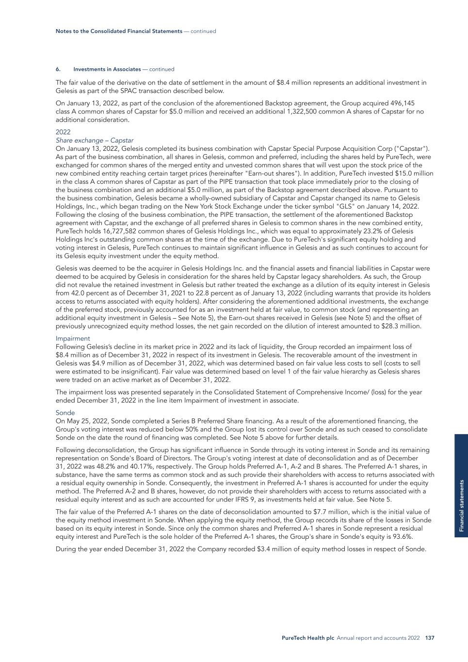 PureTech Health plc Annual report and accounts 2022 137 Fi na nc ia l s ta te m en ts The fair value of the derivative on the date of settlement in the amount of $8.4 million represents an additional investment in Gelesis as part of the SPAC transaction described below. On January 13, 2022, as part of the conclusion of the aforementioned Backstop agreement, the Group acquired 496,145 class A common shares of Capstar for $5.0 million and received an additional 1,322,500 common A shares of Capstar for no additional consideration. 2022 Share exchange – Capstar On January 13, 2022, Gelesis completed its business combination with Capstar Special Purpose Acquisition Corp ("Capstar"). As part of the business combination, all shares in Gelesis, common and preferred, including the shares held by PureTech, were exchanged for common shares of the merged entity and unvested common shares that will vest upon the stock price of the new combined entity reaching certain target prices (hereinafter "Earn-out shares"). In addition, PureTech invested $15.0 million in the class A common shares of Capstar as part of the PIPE transaction that took place immediately prior to the closing of the business combination and an additional $5.0 million, as part of the Backstop agreement described above. Pursuant to the business combination, Gelesis became a wholly-owned subsidiary of Capstar and Capstar changed its name to Gelesis Holdings, Inc., which began trading on the New York Stock Exchange under the ticker symbol "GLS" on January 14, 2022. Following the closing of the business combination, the PIPE transaction, the settlement of the aforementioned Backstop agreement with Capstar, and the exchange of all preferred shares in Gelesis to common shares in the new combined entity, PureTech holds 16,727,582 common shares of Gelesis Holdings Inc., which was equal to approximately 23.2% of Gelesis Holdings Inc's outstanding common shares at the time of the exchange. Due to PureTech's significant equity holding and voting interest in Gelesis, PureTech continues to maintain significant influence in Gelesis and as such continues to account for its Gelesis equity investment under the equity method. Gelesis was deemed to be the acquirer in Gelesis Holdings Inc. and the financial assets and financial liabilities in Capstar were deemed to be acquired by Gelesis in consideration for the shares held by Capstar legacy shareholders. As such, the Group did not revalue the retained investment in Gelesis but rather treated the exchange as a dilution of its equity interest in Gelesis from 42.0 percent as of December 31, 2021 to 22.8 percent as of January 13, 2022 (including warrants that provide its holders access to returns associated with equity holders). After considering the aforementioned additional investments, the exchange of the preferred stock, previously accounted for as an investment held at fair value, to common stock (and representing an additional equity investment in Gelesis – See Note 5), the Earn-out shares received in Gelesis (see Note 5) and the offset of previously unrecognized equity method losses, the net gain recorded on the dilution of interest amounted to $28.3 million. Impairment Following Gelesis’s decline in its market price in 2022 and its lack of liquidity, the Group recorded an impairment loss of $8.4 million as of December 31, 2022 in respect of its investment in Gelesis. The recoverable amount of the investment in Gelesis was $4.9 million as of December 31, 2022, which was determined based on fair value less costs to sell (costs to sell were estimated to be insignificant). Fair value was determined based on level 1 of the fair value hierarchy as Gelesis shares were traded on an active market as of December 31, 2022. The impairment loss was presented separately in the Consolidated Statement of Comprehensive Income/ (loss) for the year ended December 31, 2022 in the line item Impairment of investment in associate. Sonde On May 25, 2022, Sonde completed a Series B Preferred Share financing. As a result of the aforementioned financing, the Group's voting interest was reduced below 50% and the Group lost its control over Sonde and as such ceased to consolidate Sonde on the date the round of financing was completed. See Note 5 above for further details. Following deconsolidation, the Group has significant influence in Sonde through its voting interest in Sonde and its remaining representation on Sonde's Board of Directors. The Group's voting interest at date of deconsolidation and as of December 31, 2022 was 48.2% and 40.17%, respectively. The Group holds Preferred A-1, A-2 and B shares. The Preferred A-1 shares, in substance, have the same terms as common stock and as such provide their shareholders with access to returns associated with a residual equity ownership in Sonde. Consequently, the investment in Preferred A-1 shares is accounted for under the equity method. The Preferred A-2 and B shares, however, do not provide their shareholders with access to returns associated with a residual equity interest and as such are accounted for under IFRS 9, as investments held at fair value. See Note 5. The fair value of the Preferred A-1 shares on the date of deconsolidation amounted to $7.7 million, which is the initial value of the equity method investment in Sonde. When applying the equity method, the Group records its share of the losses in Sonde based on its equity interest in Sonde. Since only the common shares and Preferred A-1 shares in Sonde represent a residual equity interest and PureTech is the sole holder of the Preferred A-1 shares, the Group's share in Sonde's equity is 93.6%. During the year ended December 31, 2022 the Company recorded $3.4 million of equity method losses in respect of Sonde. 6. Investments in Associates — continued Notes to the Consolidated Financial Statements — continued