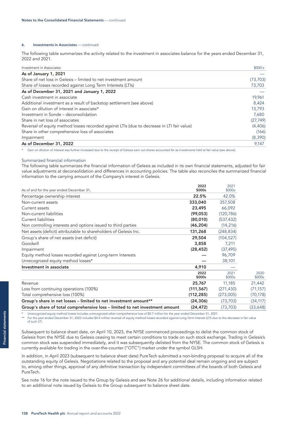 138 PureTech Health plc Annual report and accounts 2022 Fi na nc ia l s ta te m en ts The following table summarizes the activity related to the investment in associates balance for the years ended December 31, 2022 and 2021. Investment in Associates $000's As of January 1, 2021 — Share of net loss in Gelesis – limited to net investment amount (73,703) Share of losses recorded against Long Term Interests (LTIs) 73,703 As of December 31, 2021 and January 1, 2022 — Cash investment in associate 19,961 Additional investment as a result of backstop settlement (see above) 8,424 Gain on dilution of interest in associate* 13,793 Investment in Sonde – deconsolidation 7,680 Share in net loss of associates (27,749) Reversal of equity method losses recorded against LTIs (due to decrease in LTI fair value) (4,406) Share in other comprehensive loss of associates (166) Impairment (8,390) As of December 31, 2022 9,147 * Gain on dilution of interest was further increased due to the receipt of Gelesis earn out shares accounted for as investments held at fair value (see above). Summarized financial information The following table summarizes the financial information of Gelesis as included in its own financial statements, adjusted for fair value adjustments at deconsolidation and differences in accounting policies. The table also reconciles the summarized financial information to the carrying amount of the Company’s interest in Gelesis. 2022 $000s 2021 $000sAs of and for the year ended December 31, Percentage ownership interest 22.5% 42.0% Non-current assets 333,040 357,508 Current assets 23,495 66,092 Non-current liabilities (99,053) (120,786) Current liabilities (80,010) (537,432) Non controlling interests and options issued to third parties (46,204) (14,216) Net assets (deficit) attributable to shareholders of Gelesis Inc. 131,268 (248,834) Group's share of net assets (net deficit) 29,504 (104,527) Goodwill 3,858 7,211 Impairment (28,452) (37,495) Equity method losses recorded against Long-term Interests — 96,709 Unrecognized equity method losses* — 38,101 Investment in associate 4,910 — 2022 $000s 2021 $000s 2020 $000s Revenue 25,767 11,185 21,442 Loss from continuing operations (100%) (111,567) (271,430) (71,157) Total comprehensive loss (100%) (112,285) (273,005) (70,178) Group's share in net losses – limited to net investment amount** (24,306) (73,703) (34,117) Group's share of total comprehensive loss – limited to net investment amount (24,472) (73,703) (33,648) * Unrecognized equity method losses includes unrecognized other comprehensive loss of $0.7 million for the year ended December 31, 2021. ** For the year ended December 31, 2022 includes $4.4 million reversal of equity method losses recorded against Long-Term Interest (LTI) due to the decrease in fair value of such LTI. Subsequent to balance sheet date, on April 10, 2023, the NYSE commenced proceedings to delist the common stock of Gelesis from the NYSE due to Gelesis ceasing to meet certain conditions to trade on such stock exchange. Trading in Gelesis’s common stock was suspended immediately, and it was subsequently delisted from the NYSE. The common stock of Gelesis is currently available for trading in the over-the-counter (“OTC”) market under the symbol GLSH. In addition, in April 2023 (subsequent to balance sheet date) PureTech submitted a non-binding proposal to acquire all of the outstanding equity of Gelesis. Negotiations related to the proposal and any potential deal remain ongoing and are subject to, among other things, approval of any definitive transaction by independent committees of the boards of both Gelesis and PureTech. See note 16 for the note issued to the Group by Gelesis and see Note 26 for additional details, including information related to an additional note issued by Gelesis to the Group subsequent to balance sheet date. Notes to the Consolidated Financial Statements — continued 6. Investments in Associates — continued